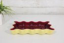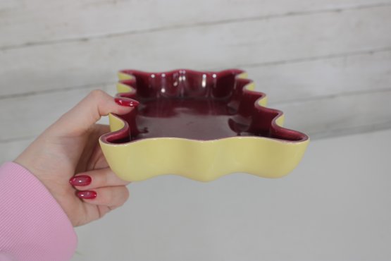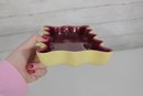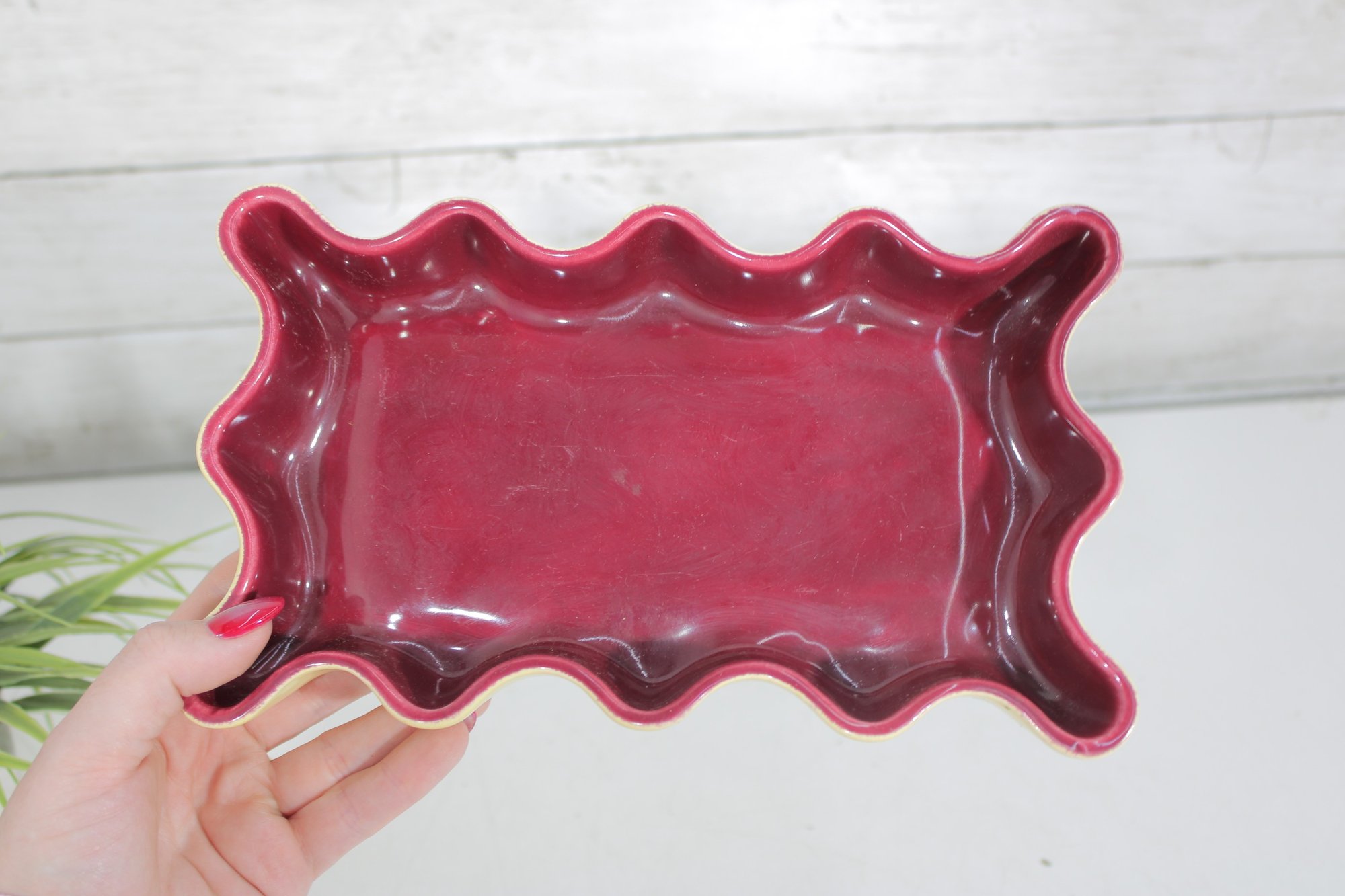 vintage Mid-Century Modern dish by Catalina Pottery, USA. This beautifully designed piece features a distinctive scalloped, fluted form with a vibrant two-tone glaze—rich burgundy interior contrasted by a soft yellow exterior.