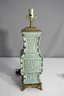 This exquisite vintage table lamp features a beautifully detailed celadon-glazed ceramic body adorned with intricate raised designs, evoking traditional East Asian artistry. The lamp sits on an ornate brass base with scrolling leaf motifs, adding a touch of sophistication. The brass accents extend to the lamp's top, harmonizing with its elegant form.