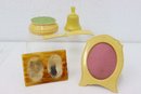 Vintage Celluloid Picture Frames, Yellow/Green Bakelite Powder Box, Shoe Horn, And Knickerbocker Minstrel Bell
