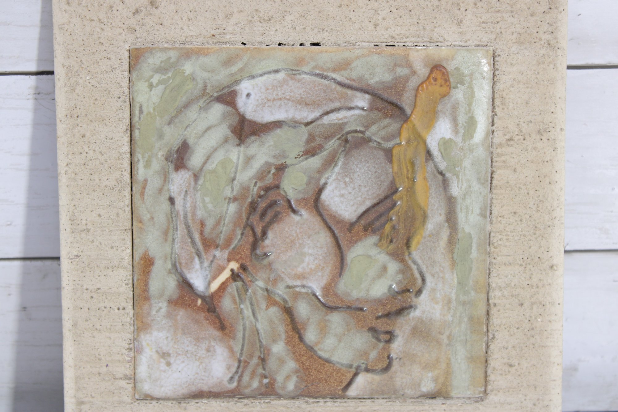Unique vintage ceramic art tile featuring an abstract profile of a human face in soft, earthy tones. The design is rendered in a raised relief style, with flowing organic shapes and subtle glazing in creams, browns, and muted greens that create depth and texture.