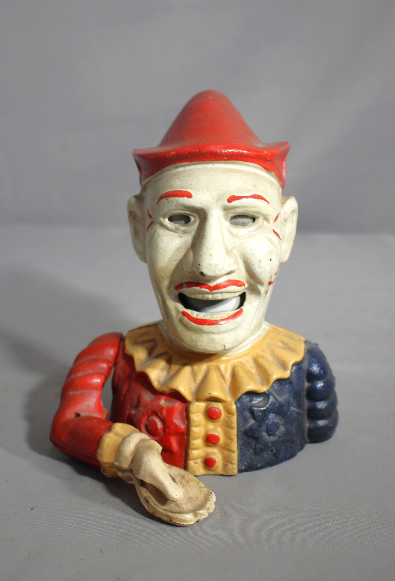 This quaint piece features a hand-painted clown with traditional garb in primary colors, accentuated with crisp white and a standout red pointed hat. The bust is in need of repair, presenting a wonderful opportunity for restoration enthusiasts to bring back its original charm. The craftsmanship suggests a playful yet classic depiction of circus life. Perfect for collectors of circus memorabilia or those with an eye for reviving vintage treasures. Whether restored to its former glory or displayed as a testament to the passage of time, this piece is sure to evoke smiles and memories of the golden days of the big top.