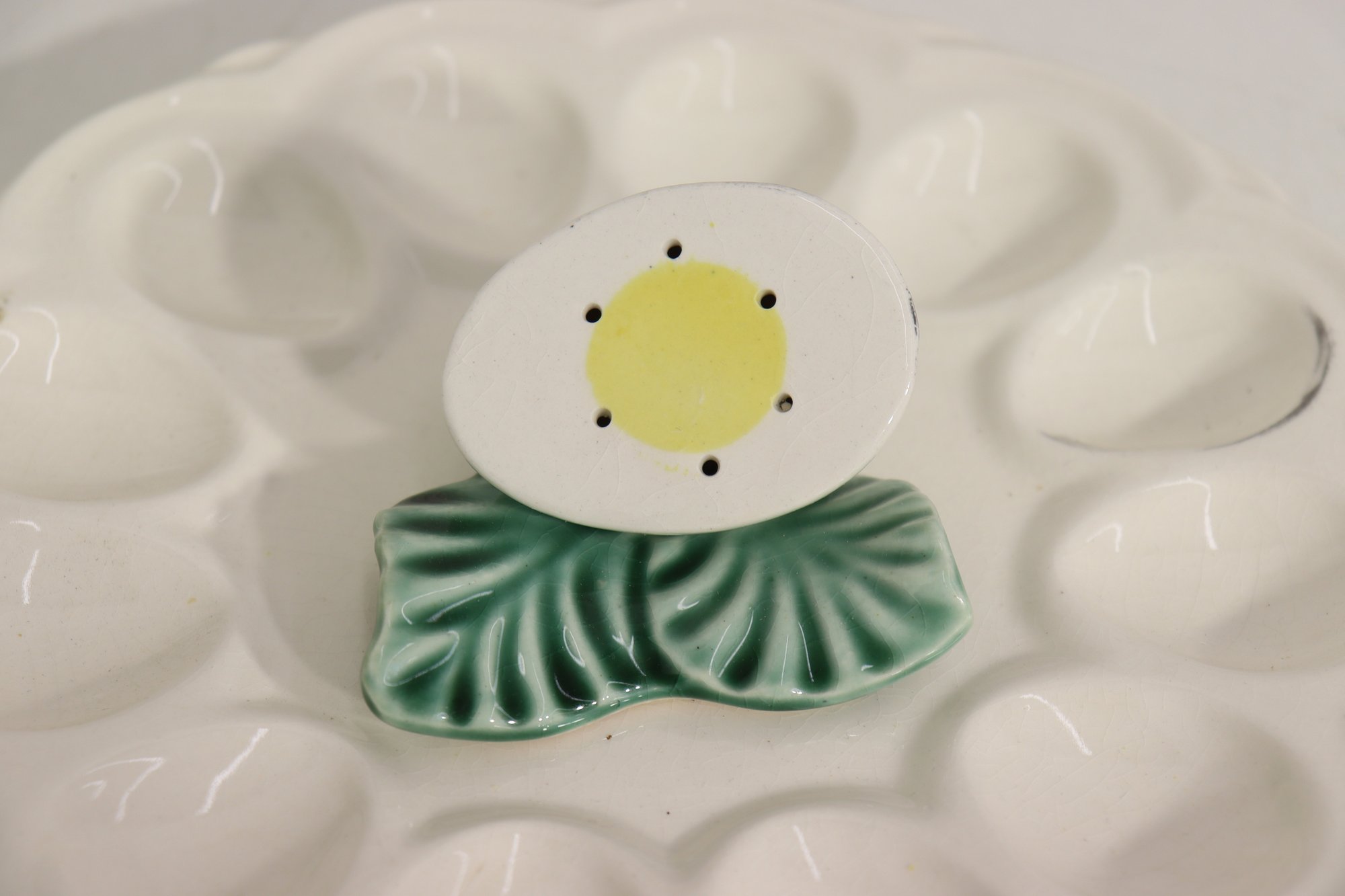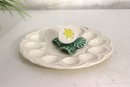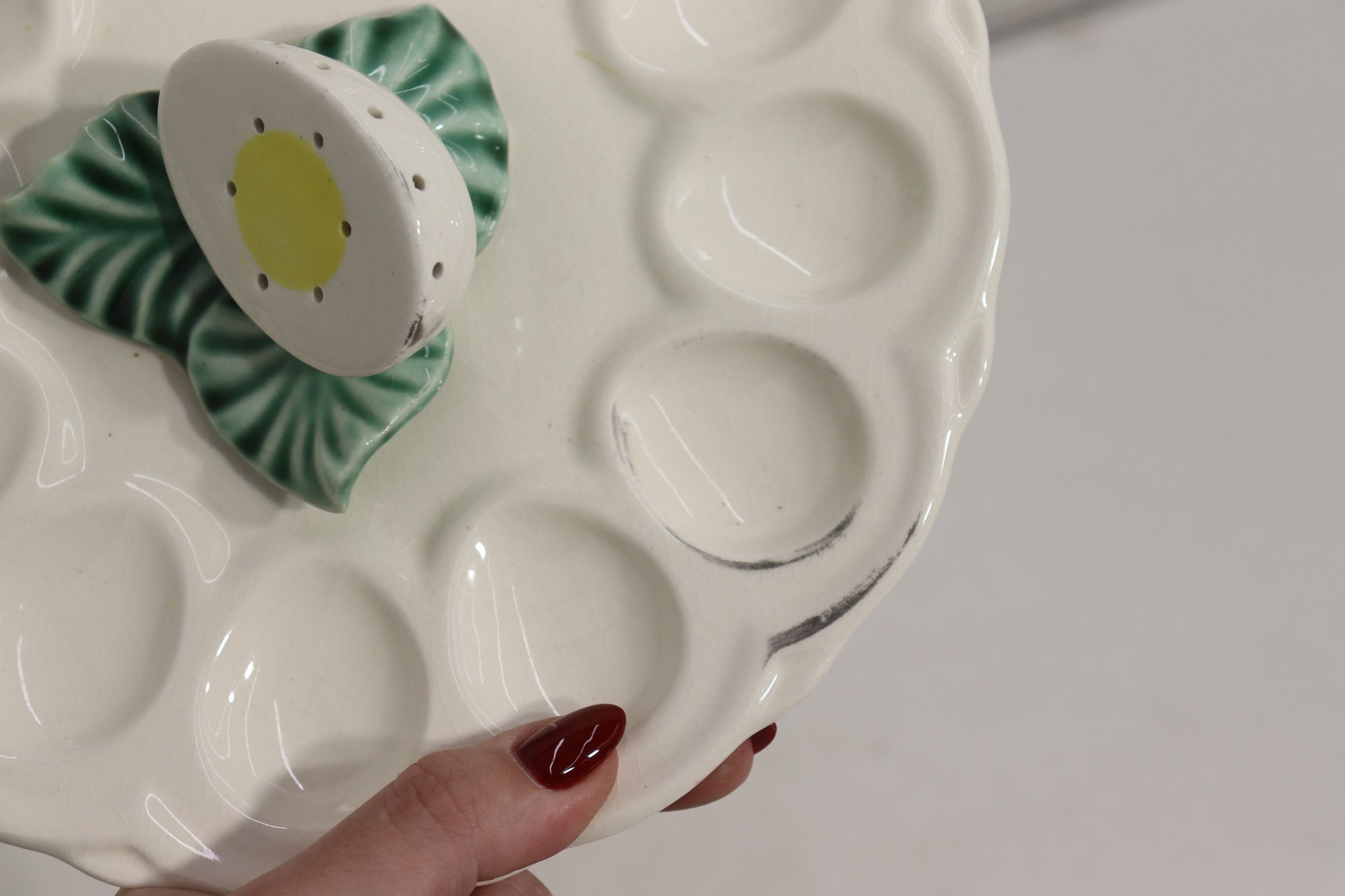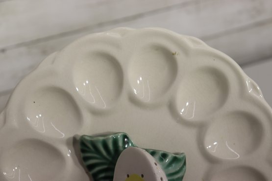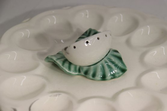 Charming vintage ceramic deviled egg serving plate featuring 12 egg wells and a matching center piece egg-shaped shaker on green leaf base (salt or pepper shaker). Plate measures approx. 9” round.