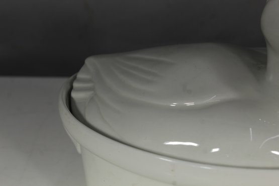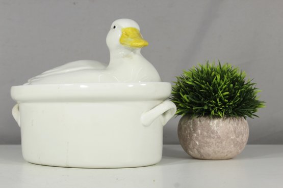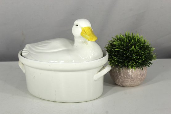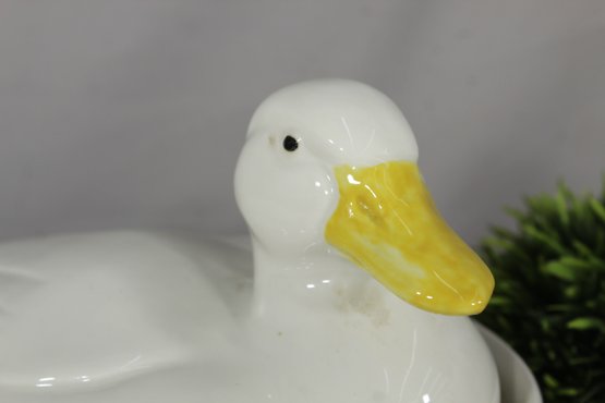 This charming vintage ceramic tureen is shaped like a duck, featuring a glossy white finish with a bright yellow beak. The lid is sculpted to resemble the duck's wings, creating a delightful and functional piece for your kitchen or dining table. Perfect for soups, stews, or as a decorative centerpiece.