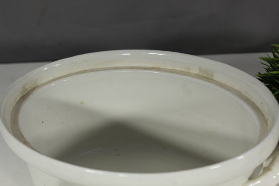 The tureen is in good vintage condition with some signs of use, including slight discoloration and wear on the interior and base, as shown in the photos. A lovely addition to any farmhouse or country-style decor collection.