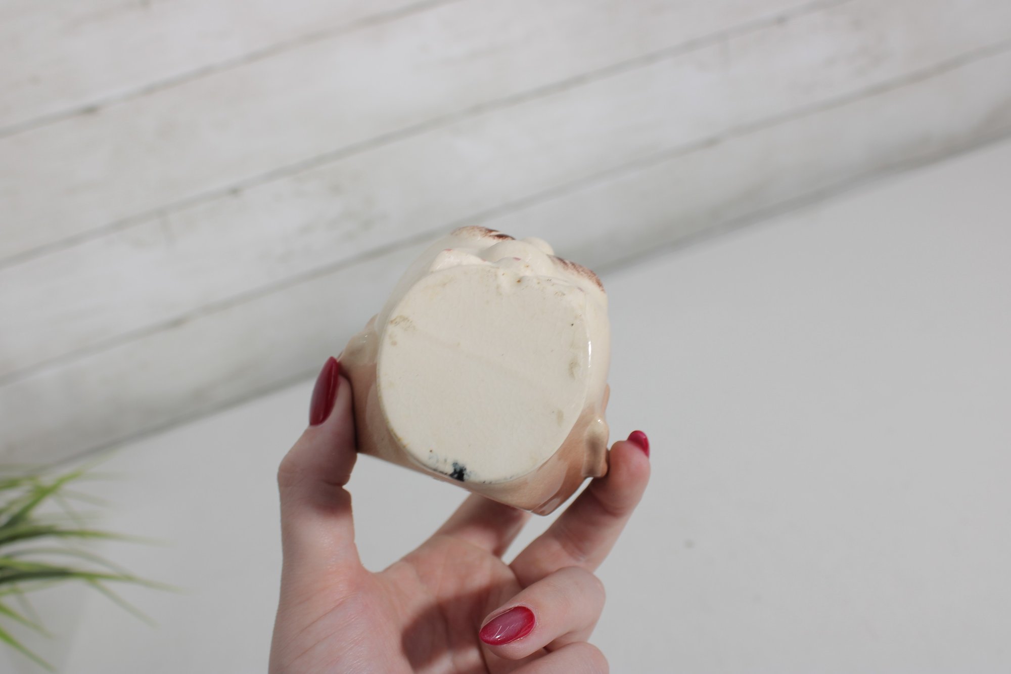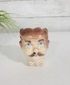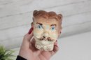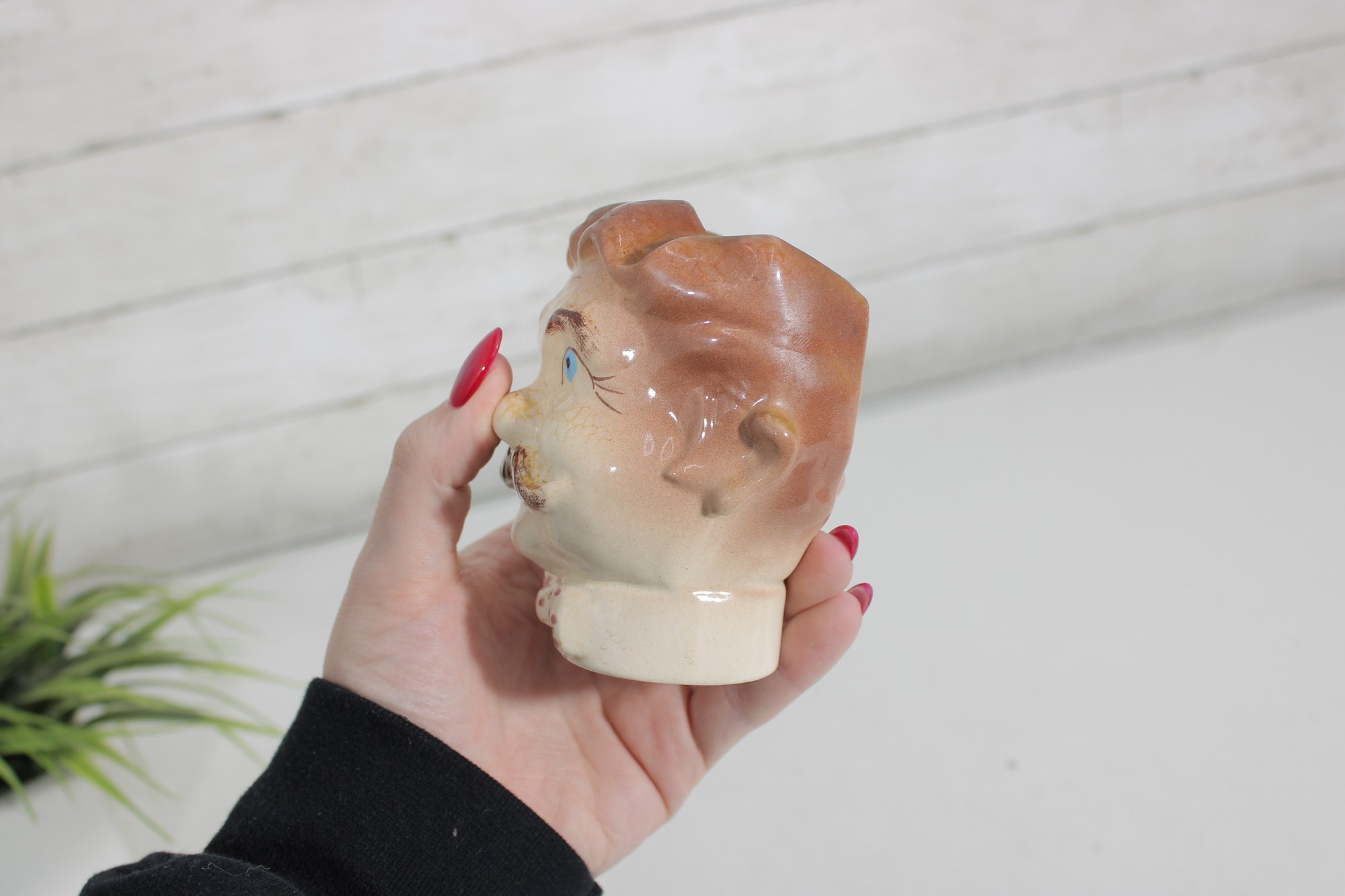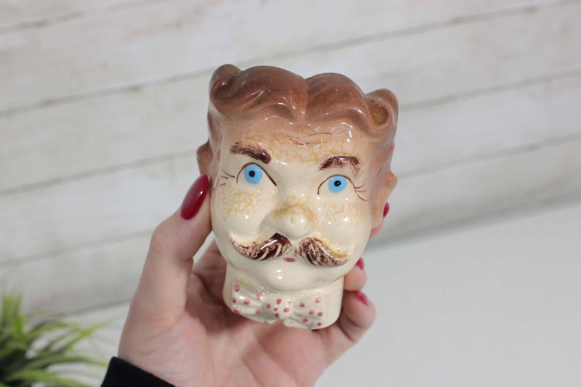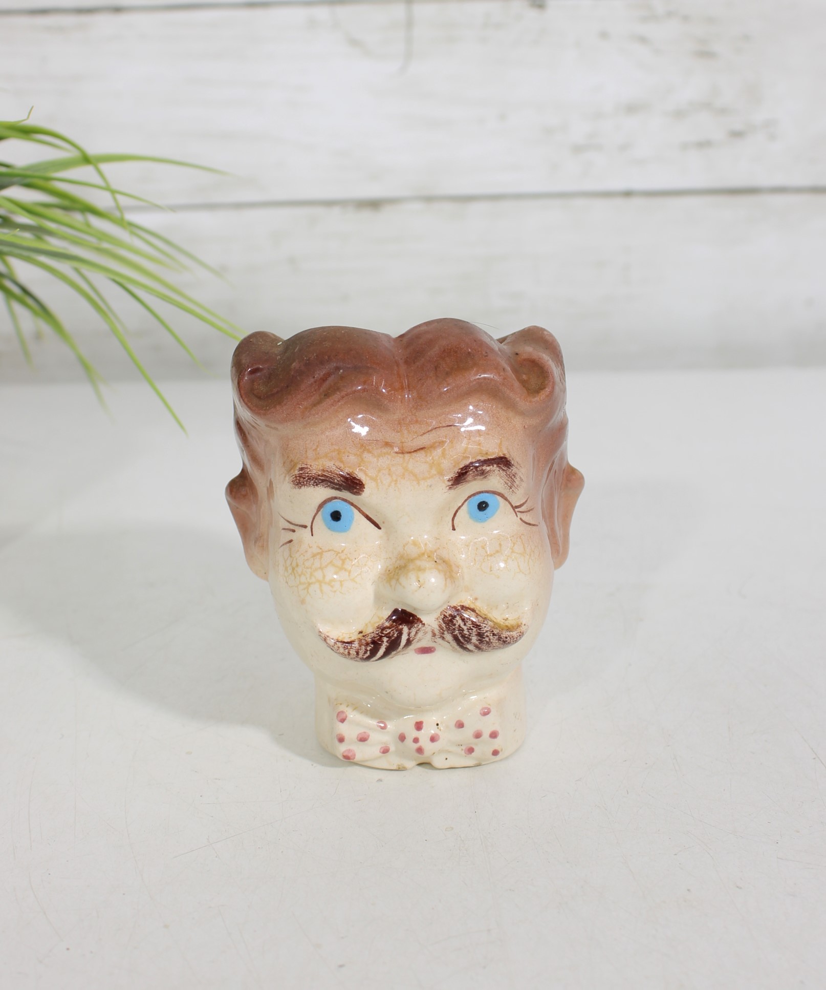 Charming vintage ceramic wall pocket featuring a whimsical man’s head with a curled mustache and bright blue eyes. This hand-painted piece has a glossy finish and is designed to hang on the wall, perfect for holding small plants, flowers, or decorative items.