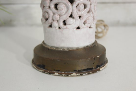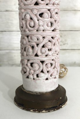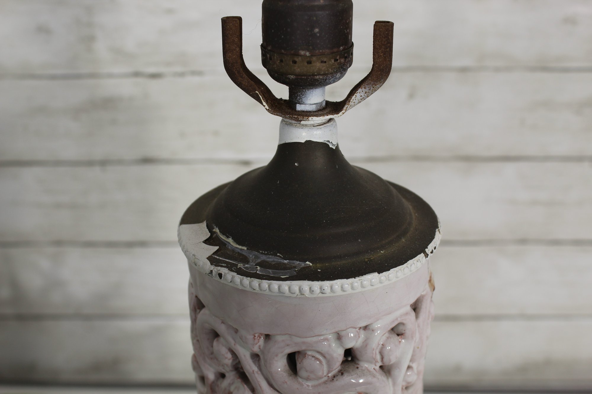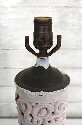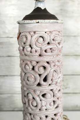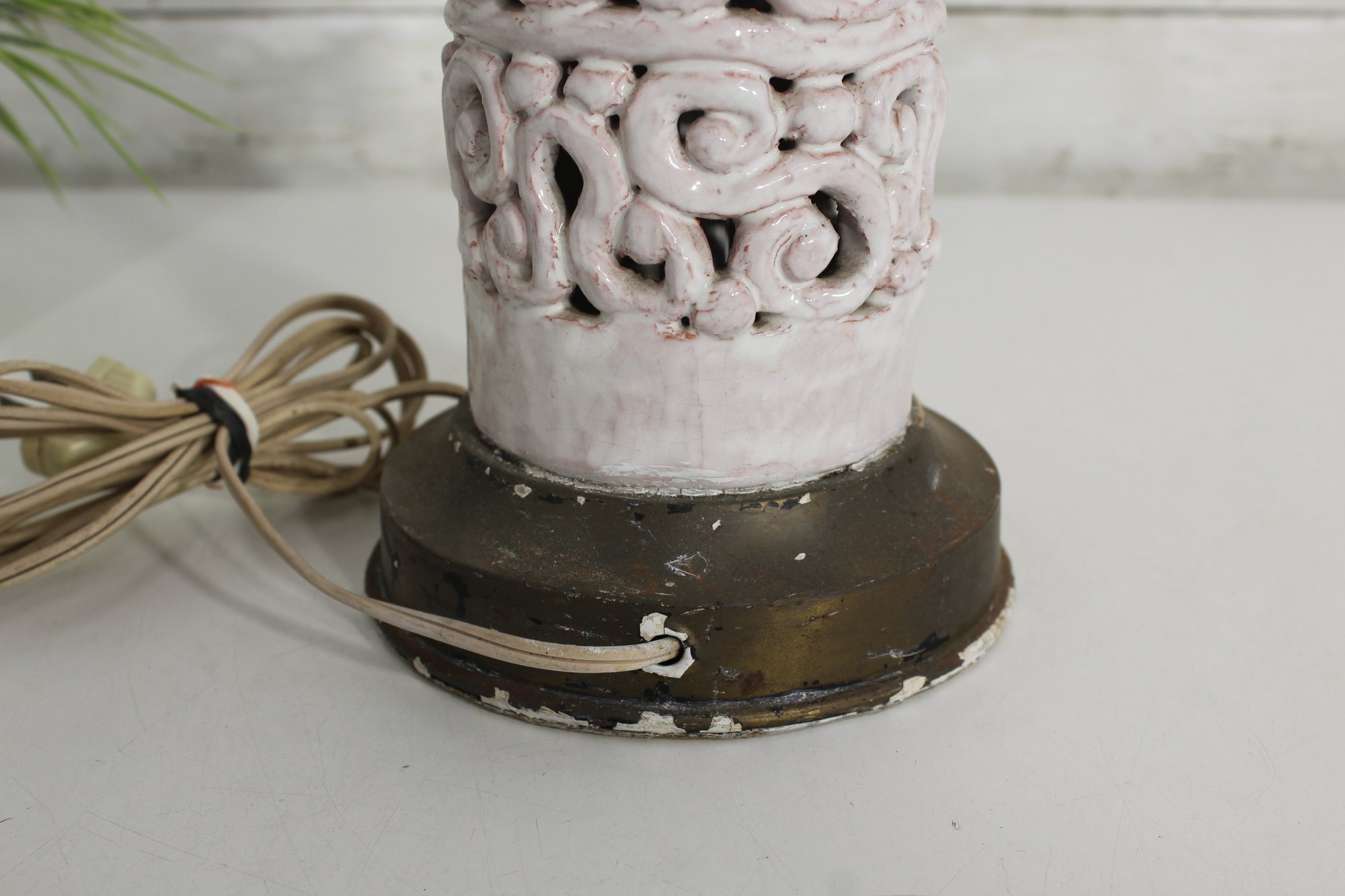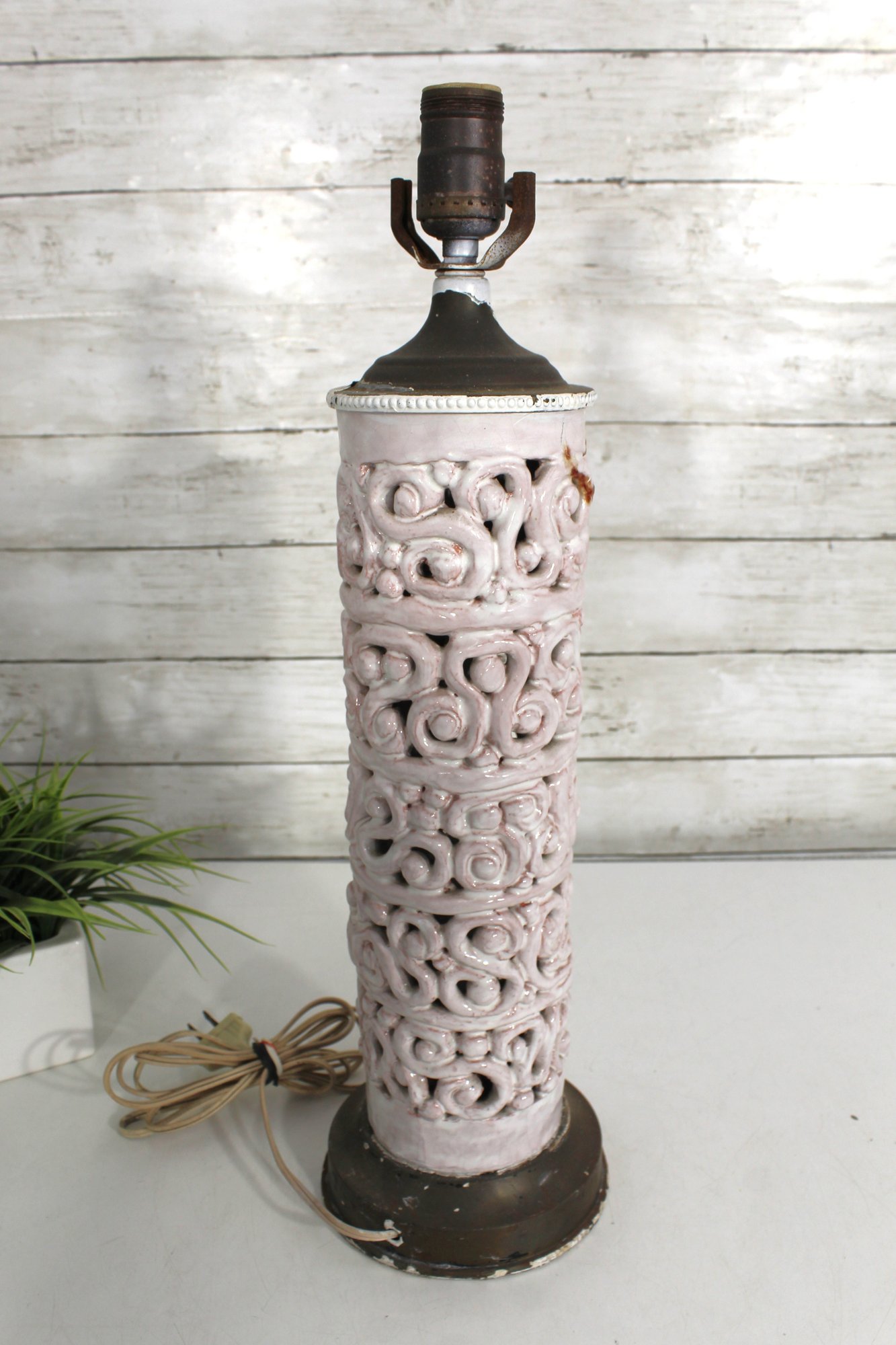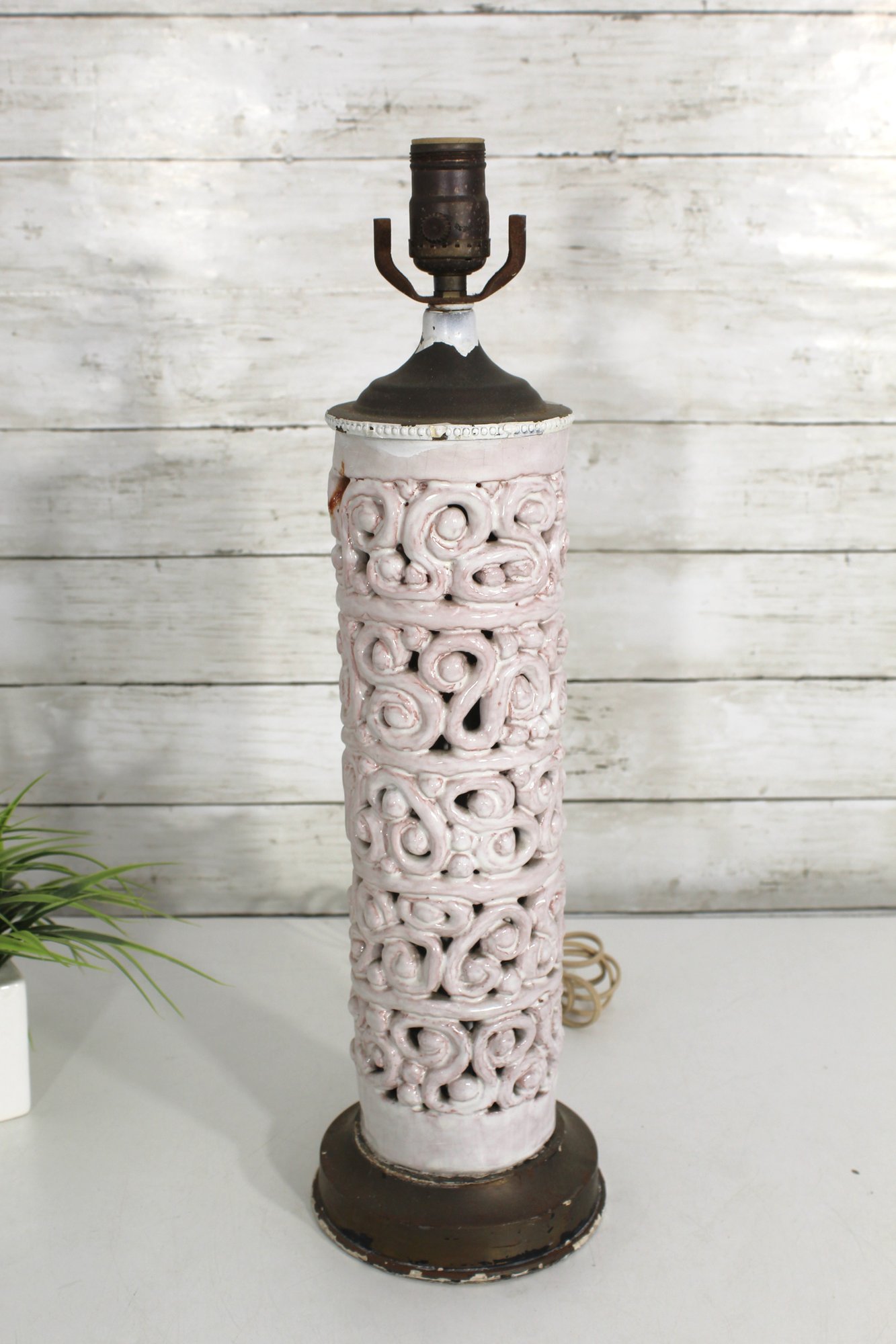 Charming and full of character, this vintage ceramic table lamp features a unique openwork scroll pattern with a lightly distressed pale pink glaze. The intricate raised design wraps around the cylindrical body, giving it an elegant and decorative appearance that pairs beautifully with cottage, shabby chic, or mid-century interiors.