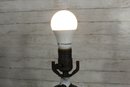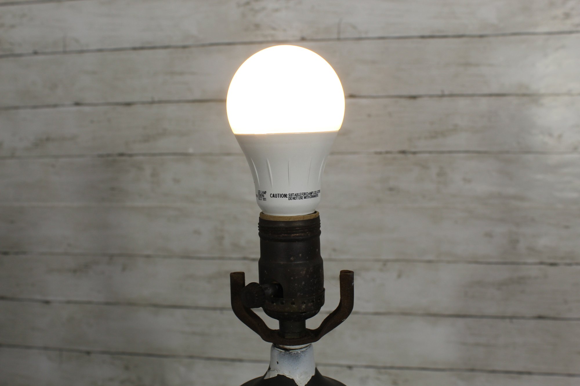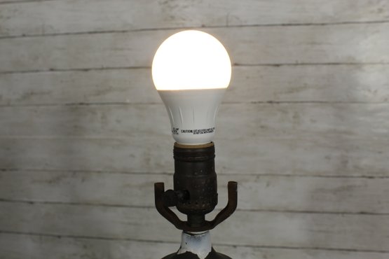 The lamp stands approximately 20 inches high and rests on a metal base with an aged bronze finish, adding to its vintage appeal. It has been tested and works as shown in the photos.