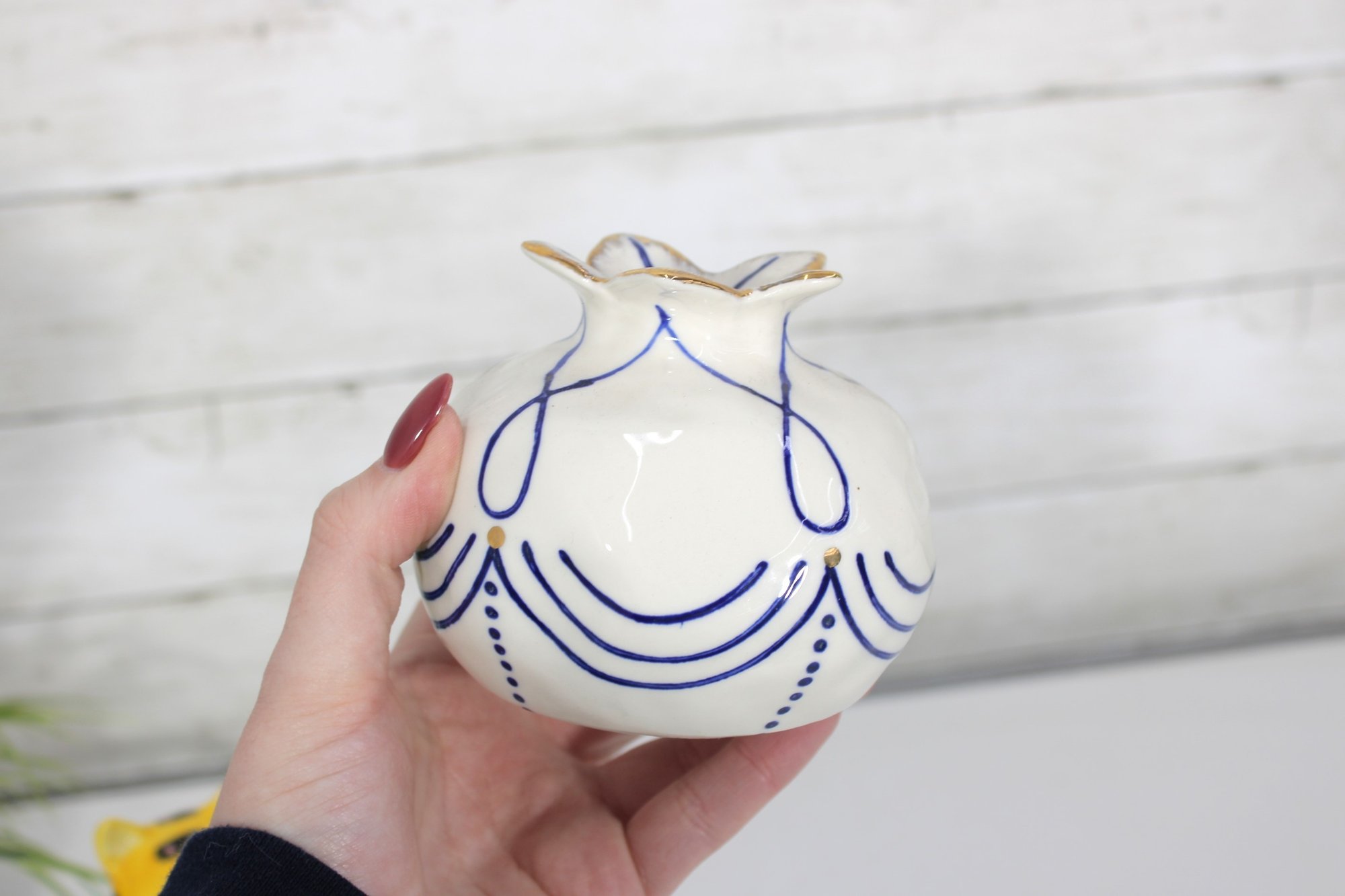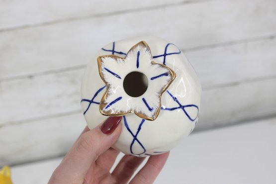 Petite round ceramic bud vase featuring cobalt blue linework on a white glazed body with gold-tone trim around the top opening. The opening is shaped like a stylized flower.