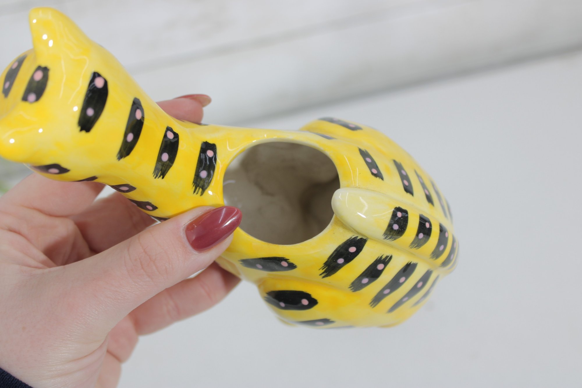 Adorable stylized cat form with black accent striping and a glossy finish. The open top cavity allows for use as a small planter, succulent holder, or decorative accent piece.