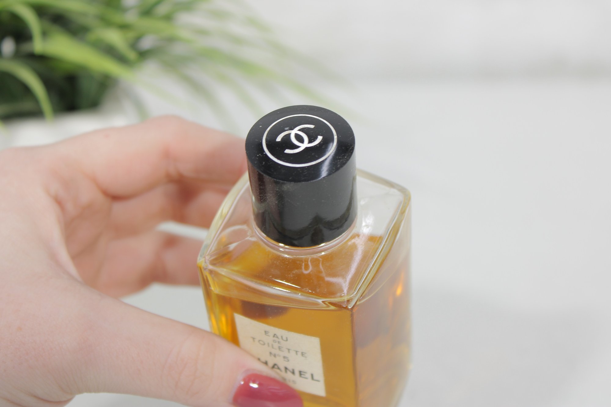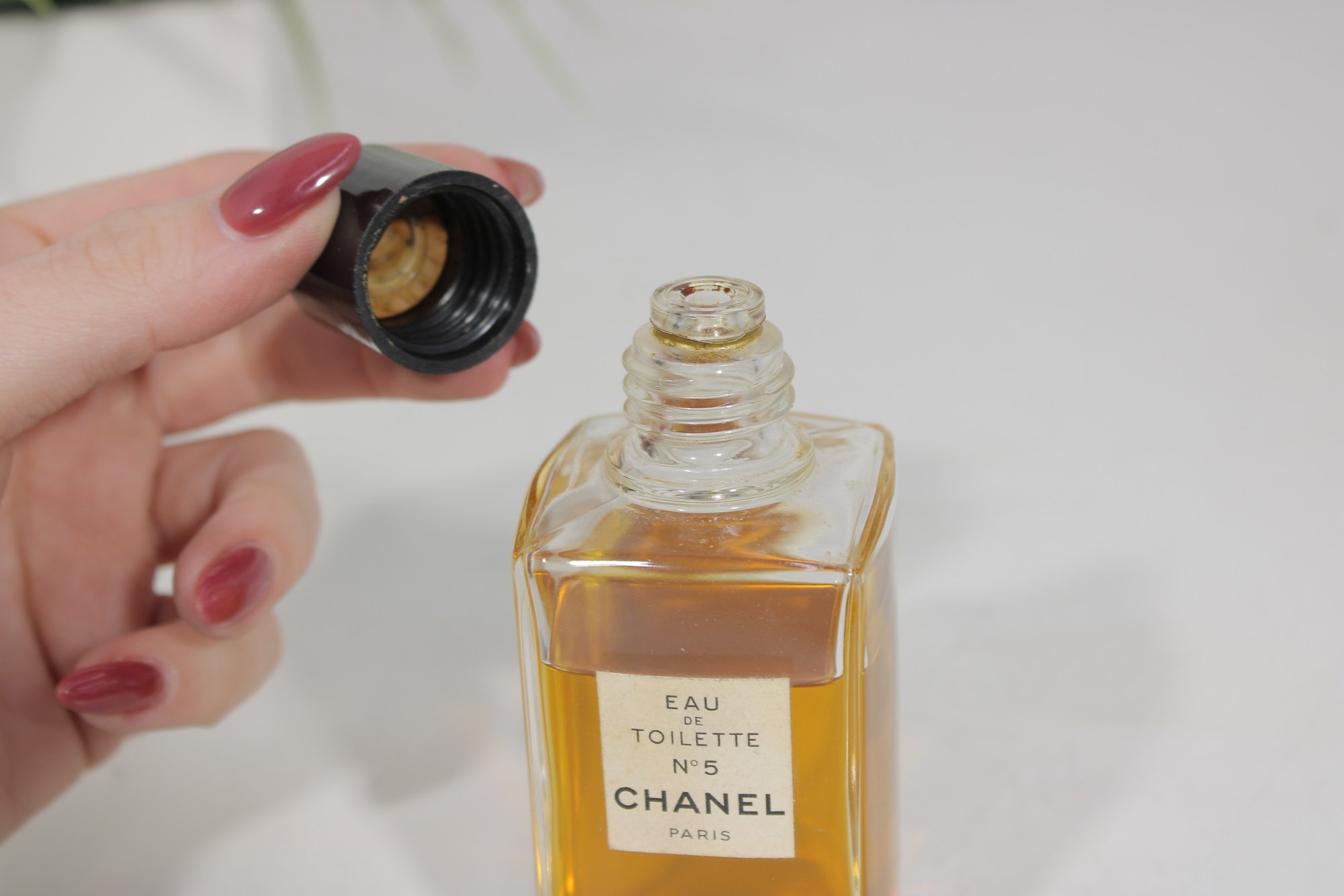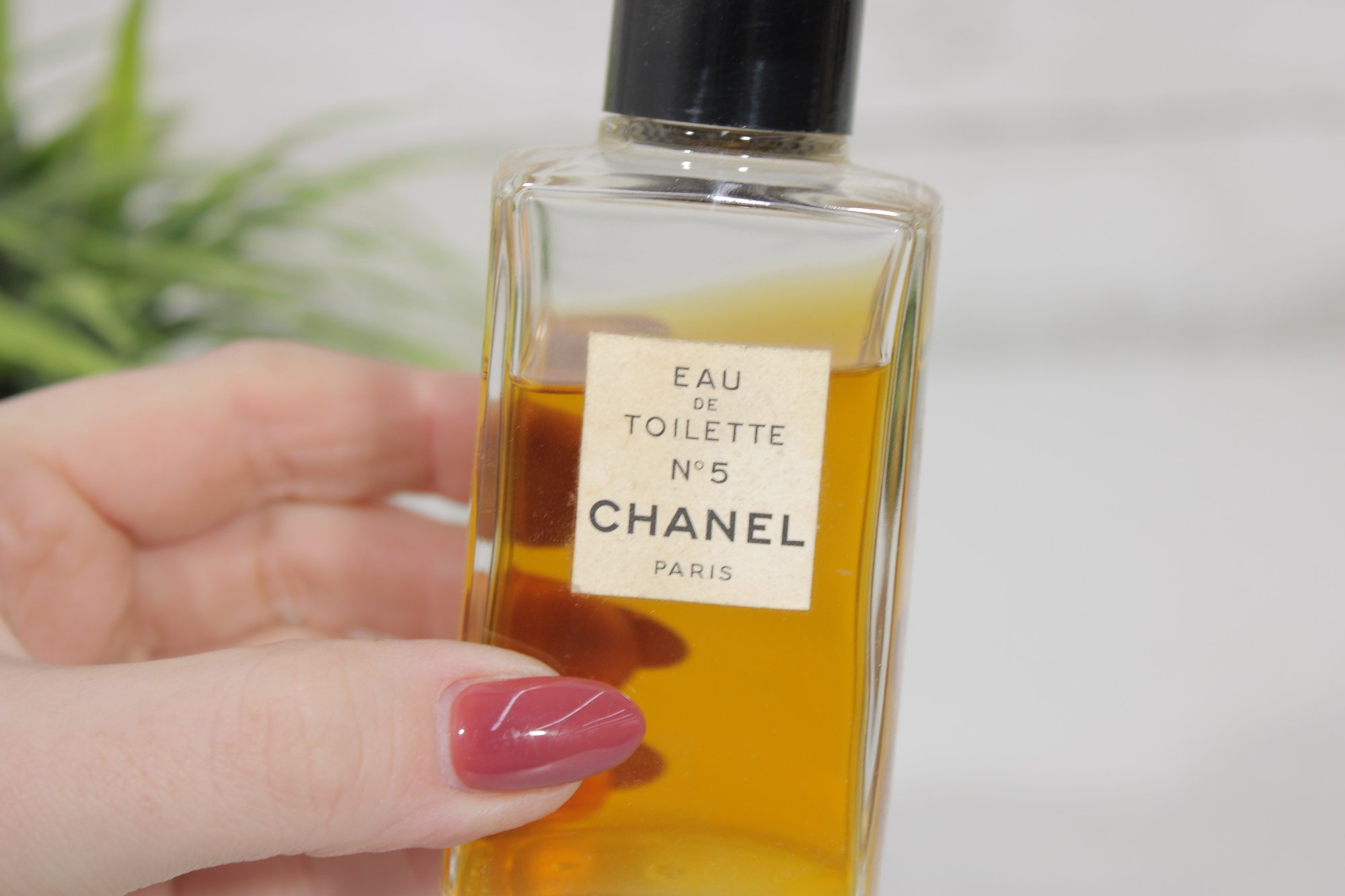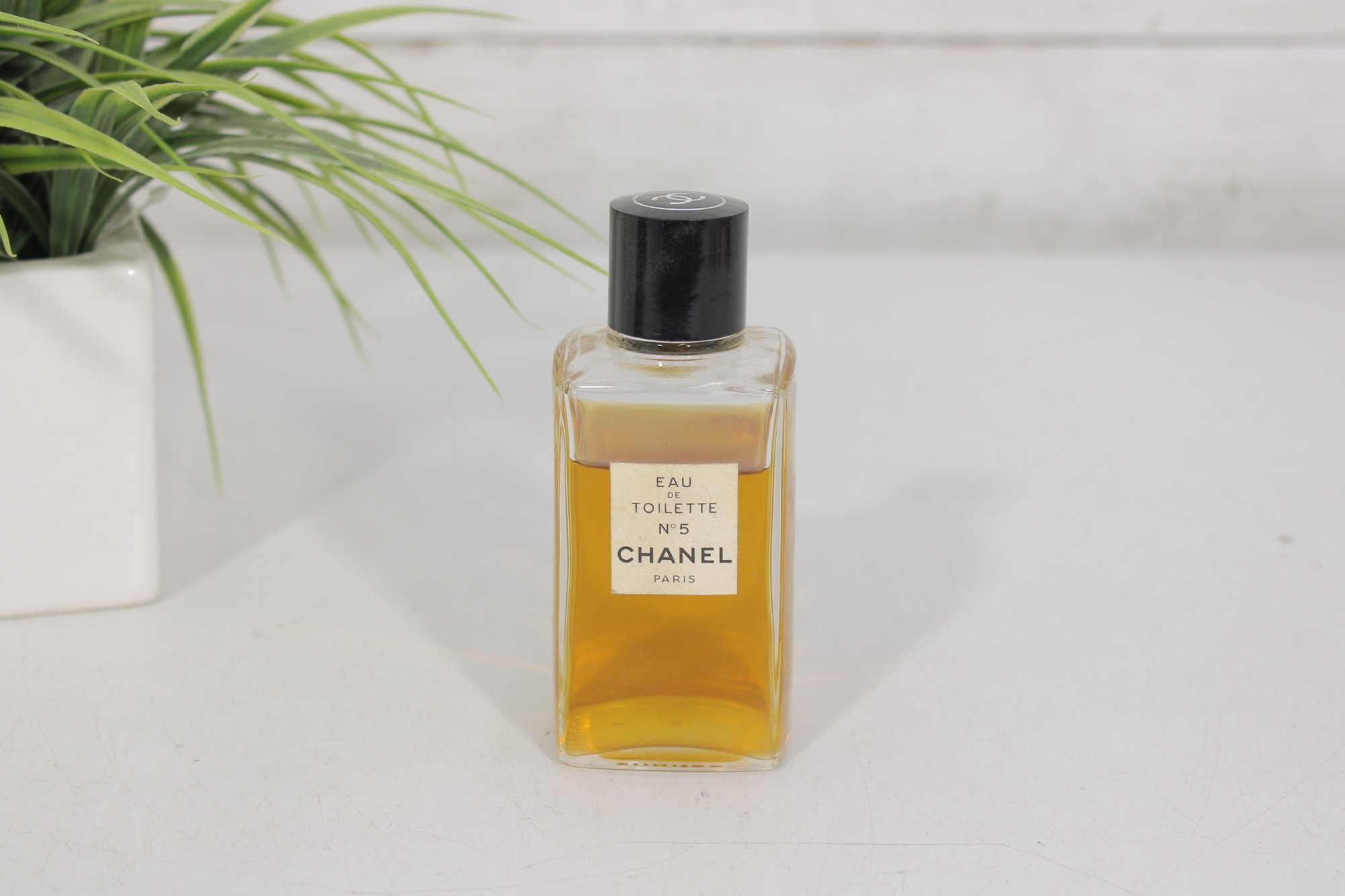 vintage Chanel No. 5 Eau de Cologne, believed to date to the 1950s, featuring the classic paper label and embossed glass bottle.