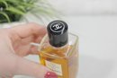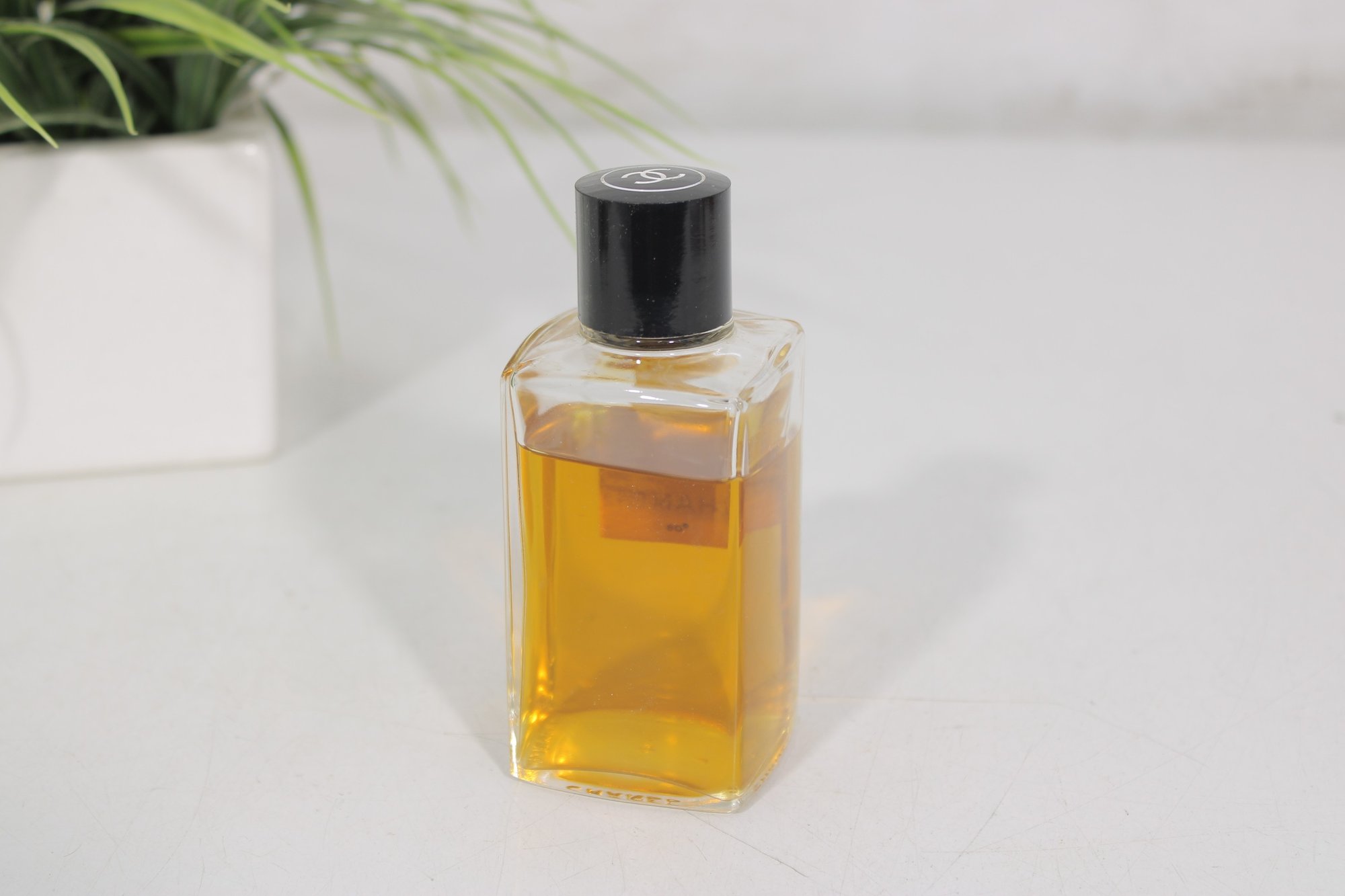 This iconic rectangular bottle displays the timeless elegance that made Chanel No. 5 one of the most legendary fragrances in history. The bottle retains its original black cap (with visible crack) and approximately half of the original fragrance content (see photos for exact level).