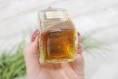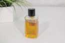 The glass base shows embossed detailing, adding to its authenticity and collectible appeal. The warm amber tone of the remaining fragrance gives it beautiful vintage character.