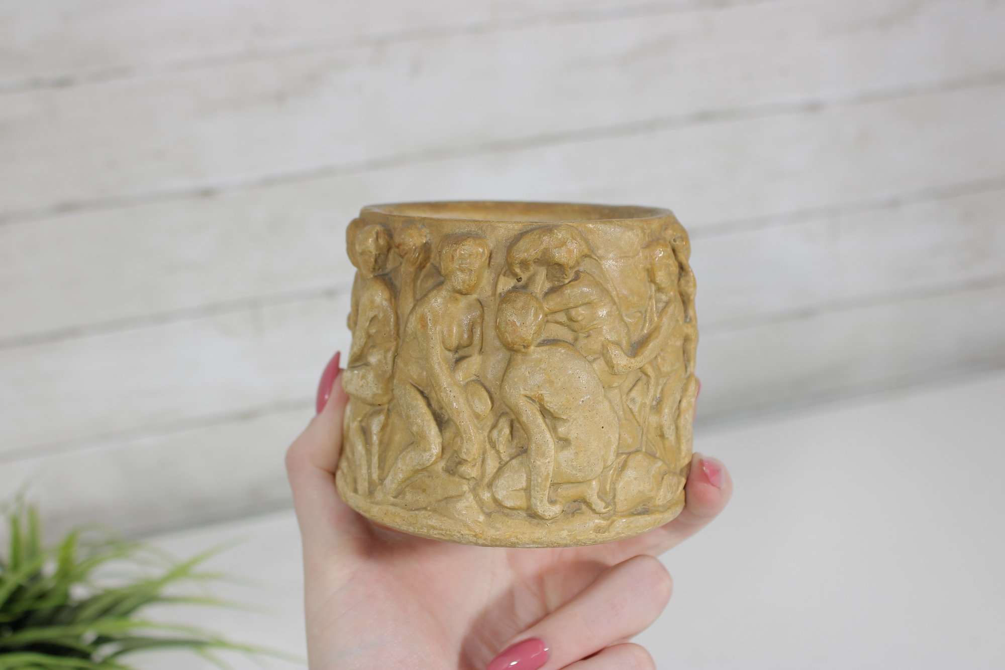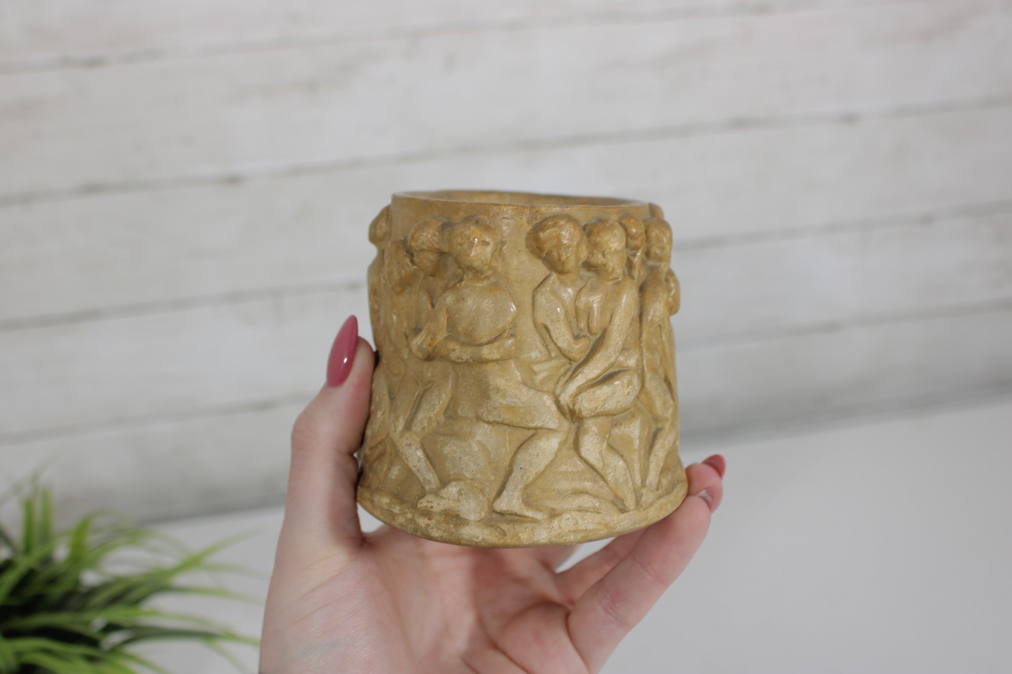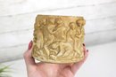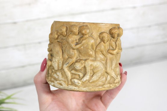 Charming vintage resin vase or small planter featuring a beautifully detailed classical cherub (putti) relief design. The exterior is decorated with multiple cherubs in a playful scene wrapping around the entire piece, giving it a timeless Renaissance or classical-inspired look.