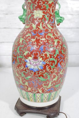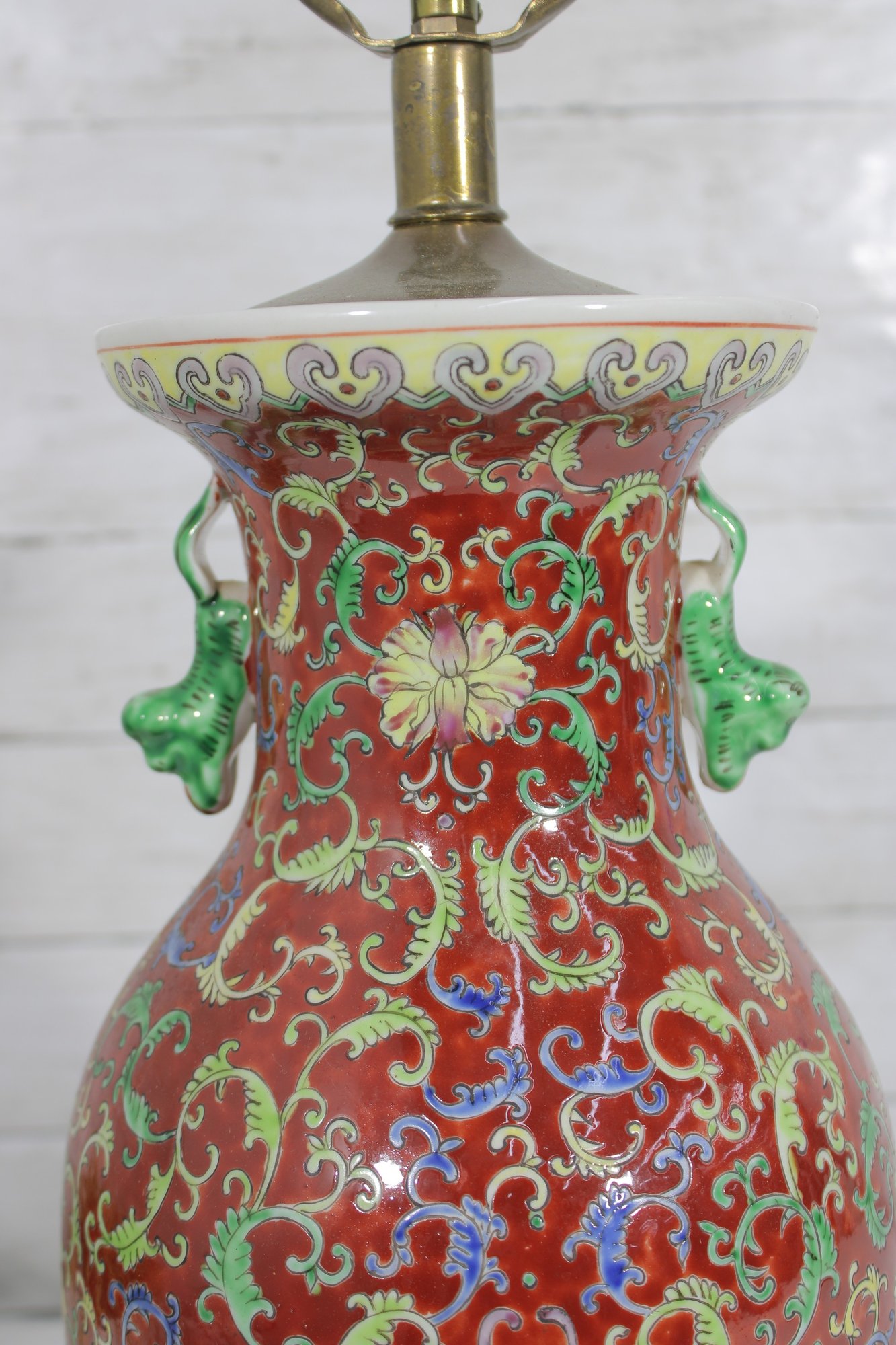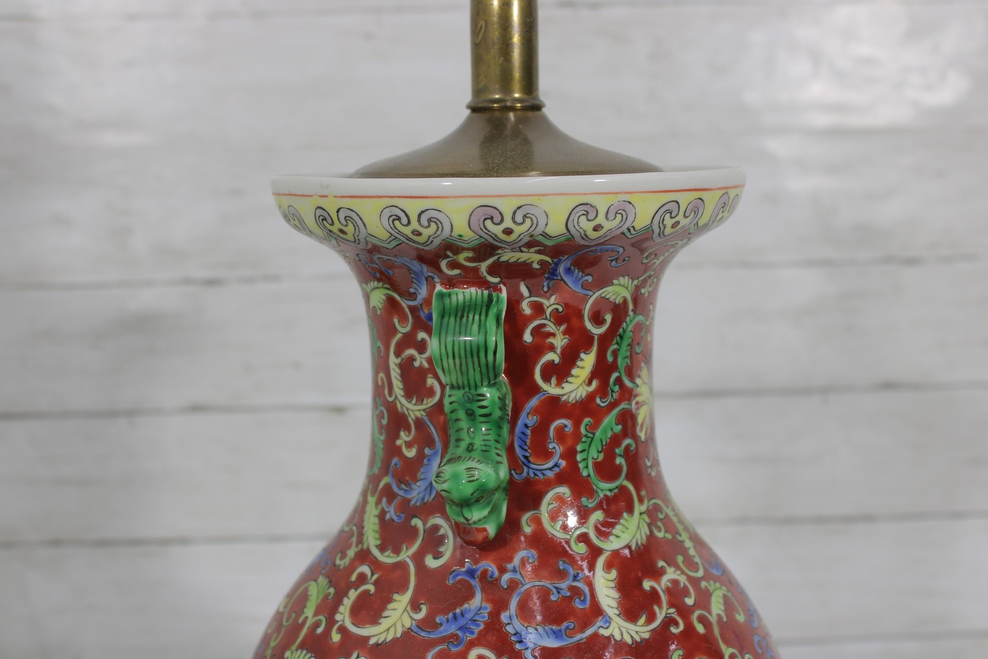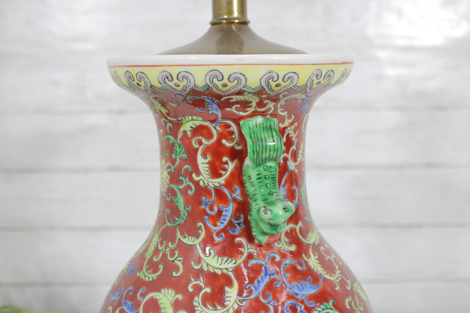 vintage Chinese porcelain table lamp beautifully decorated in the Famille Rose style. The vase-form body features a vibrant red ground with intricate floral and scrolling vine patterns highlighted with green, blue, and gold tones. The design includes detailed lotus-style medallions and ornate decorative borders, showcasing traditional Chinese decorative artistry.