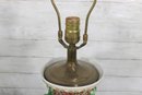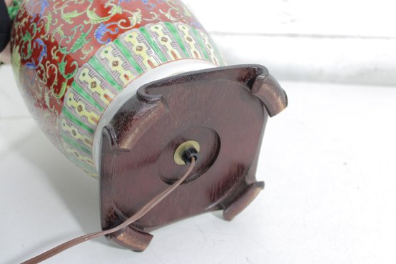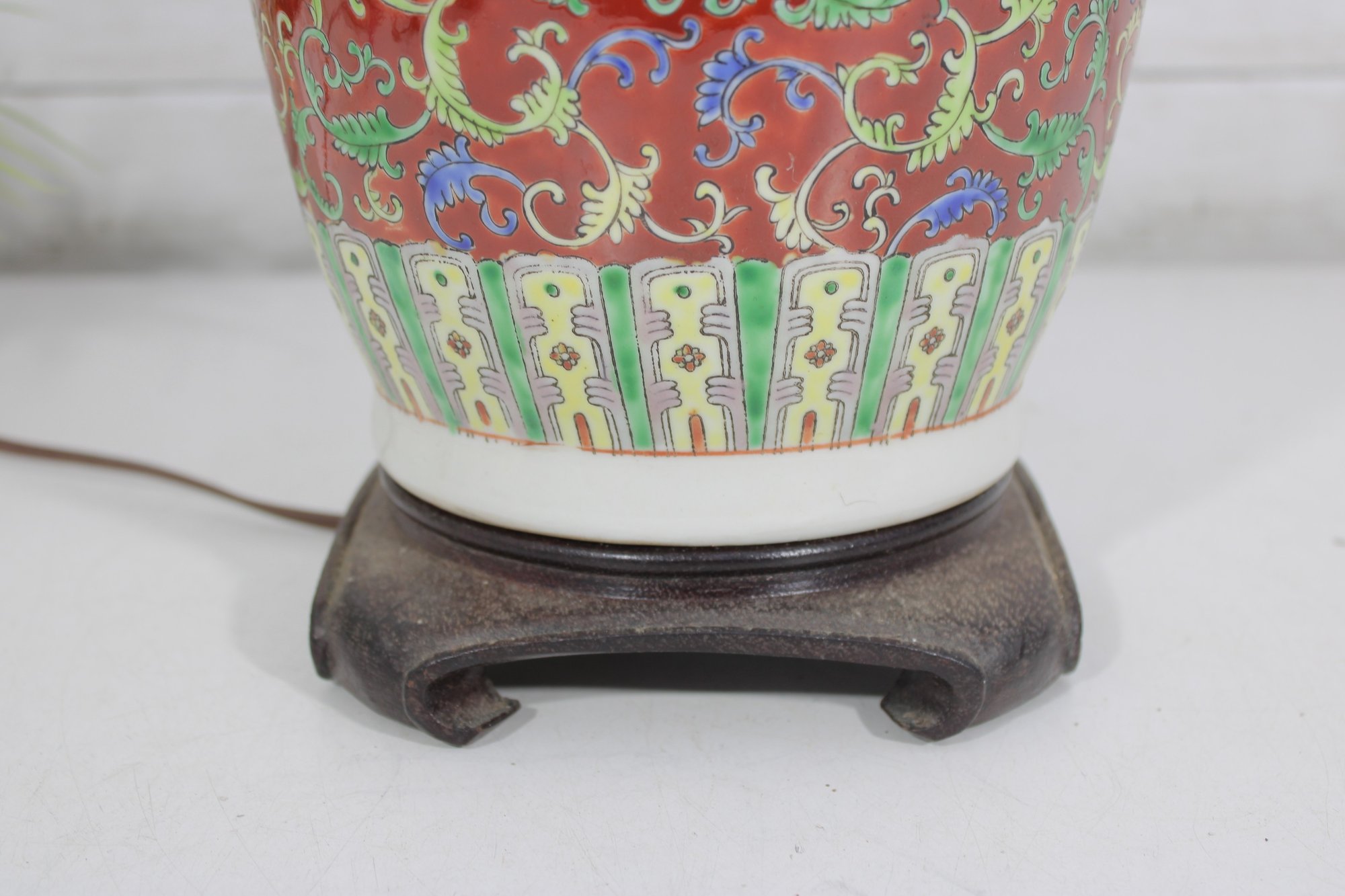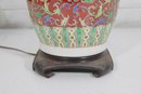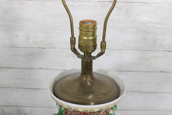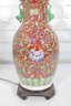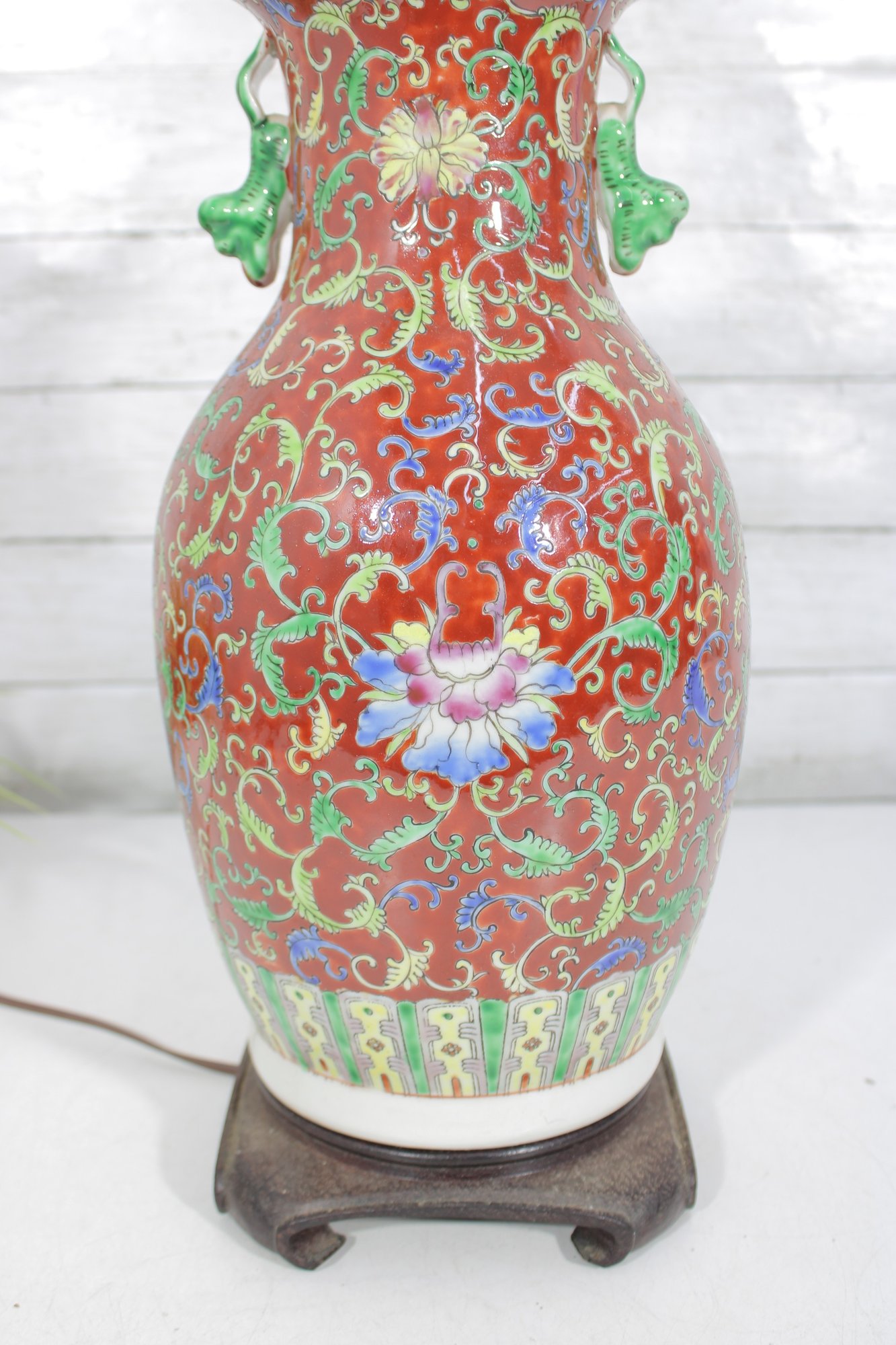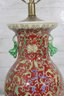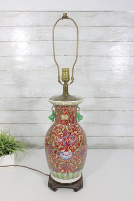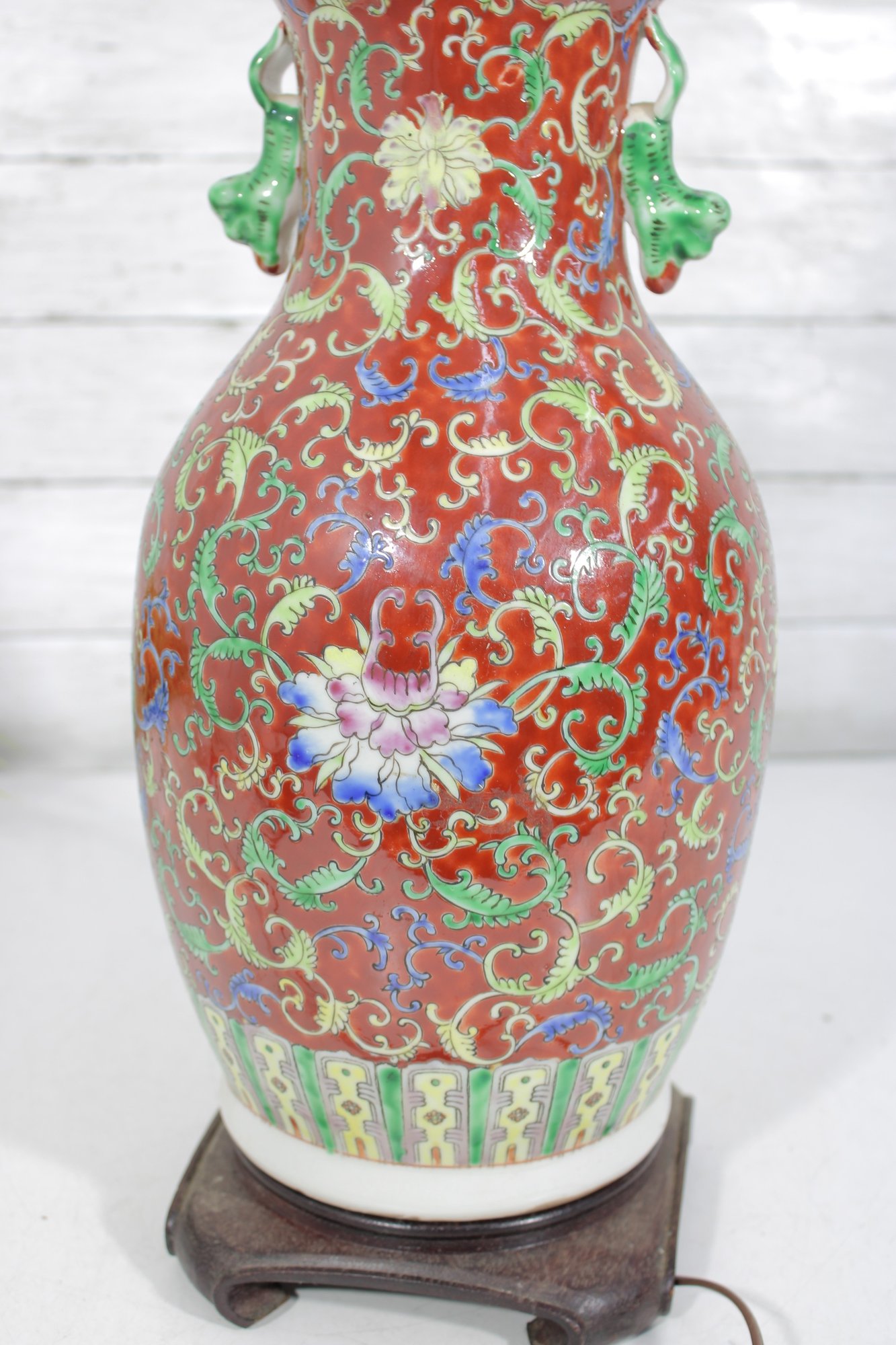 vintage Chinese porcelain table lamp beautifully decorated in the Famille Rose style. The vase-form body features a vibrant red ground with intricate floral and scrolling vine patterns highlighted with green, blue, and gold tones. The design includes detailed lotus-style medallions and ornate decorative borders, showcasing traditional Chinese decorative artistry.