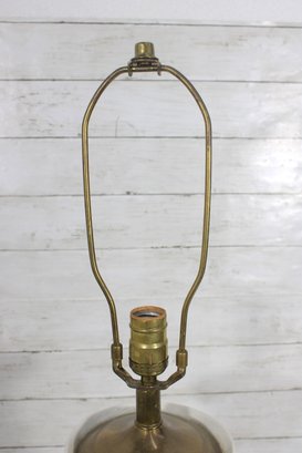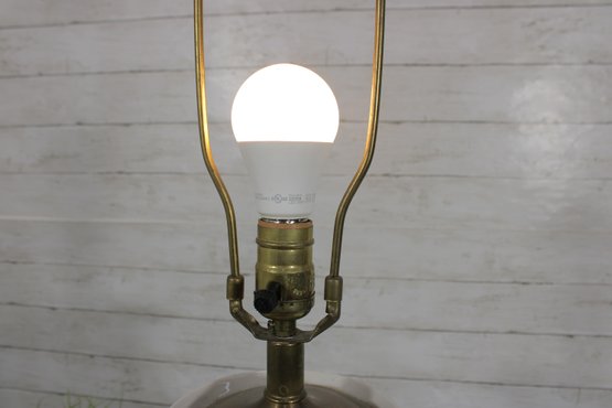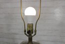 The lamp is mounted on a carved wooden base and fitted with a solid brass harp and single socket fixture. Decorative green mask-style handles appear on each side of the vase, adding an elegant architectural element to the design. When lit, the lamp provides a warm accent and serves as an eye-catching statement piece for traditional, Asian-inspired, or eclectic interiors.