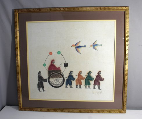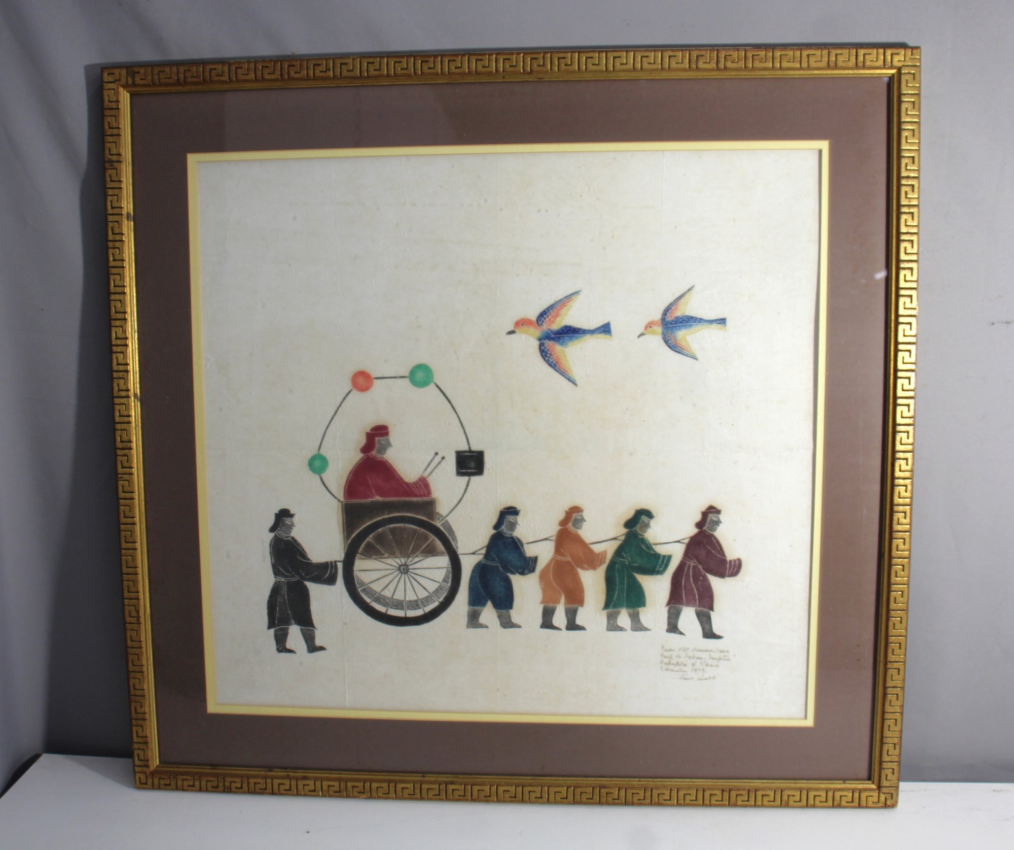 This captivating piece of Chinese folk art features a procession led by a figure in a wheel cart, drawn by four colorful attendants and accompanied by two elegant birds in flight. The painting is marked with a handwritten inscription noting the location and date: "From A82 Demonstration, Fall to Peking, People's Republic of China, November 1975." Framed in a unique gold frame with a Greek key pattern, this work of art embodies the cultural and historical essence of mid-20th century Chinese artistic expression.