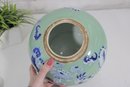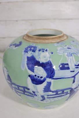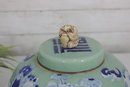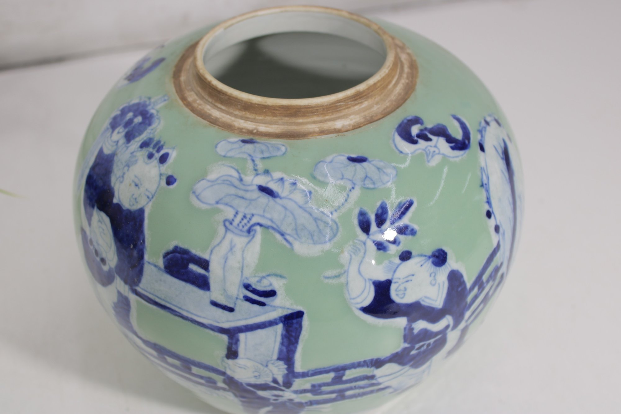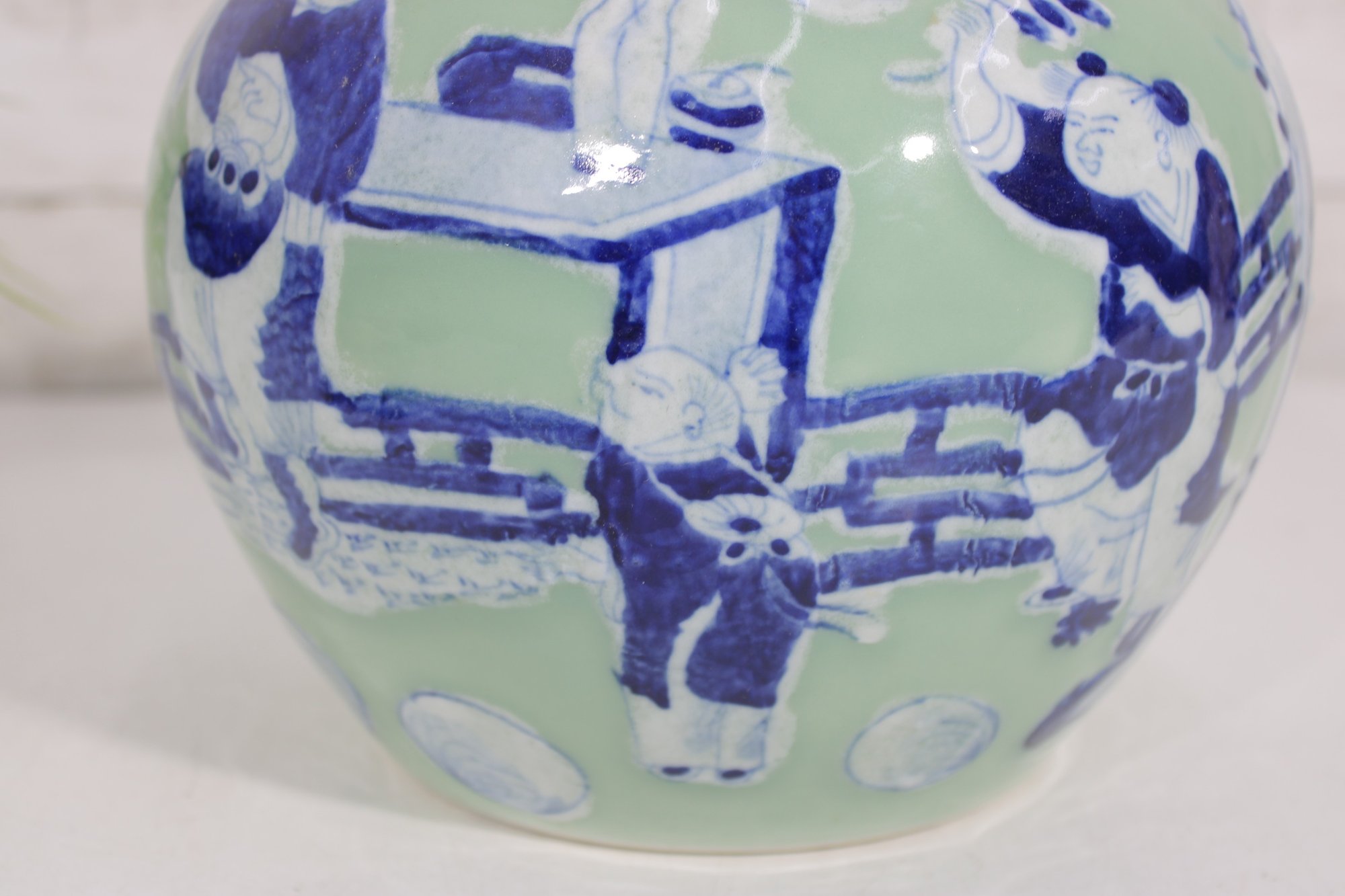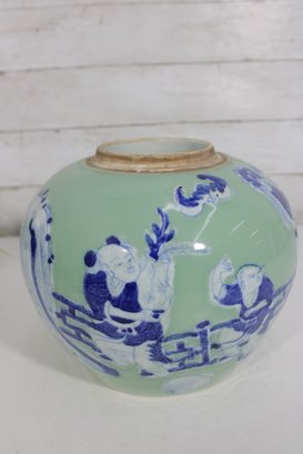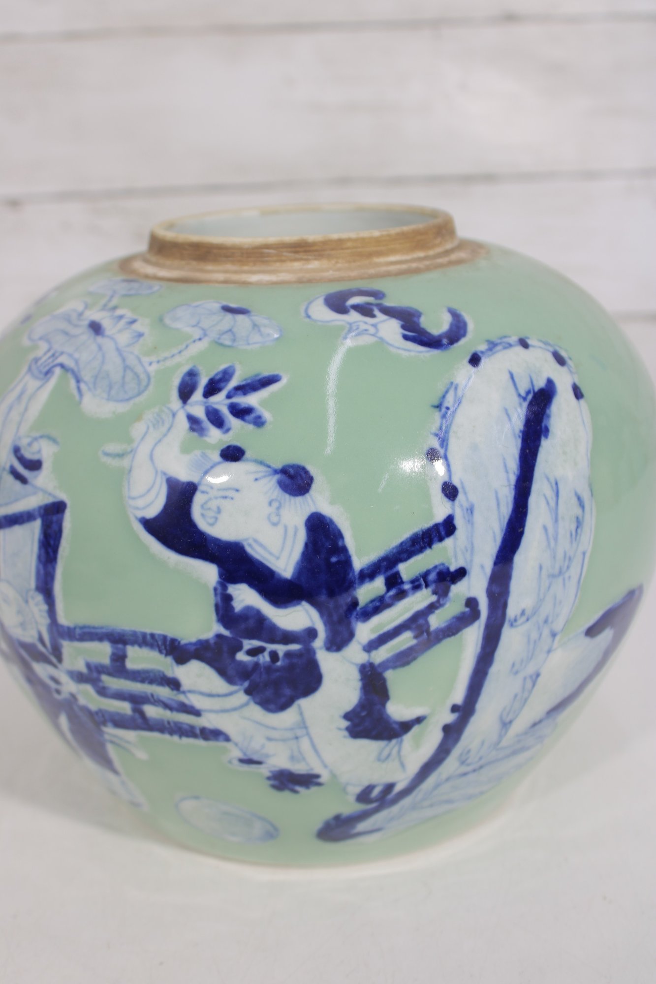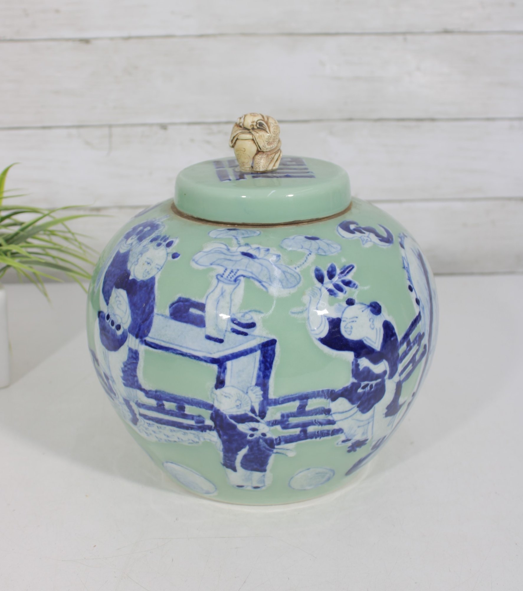 Beautiful vintage Chinese porcelain ginger jar with lid, featuring a charming hand-painted blue and white figural scene set against a soft celadon-green background.