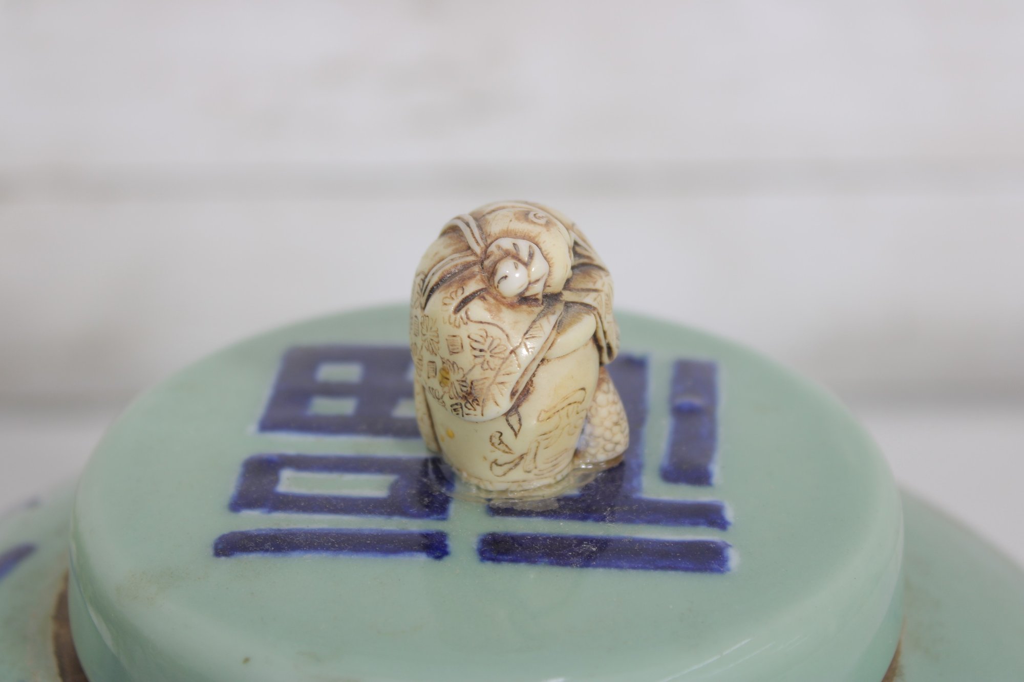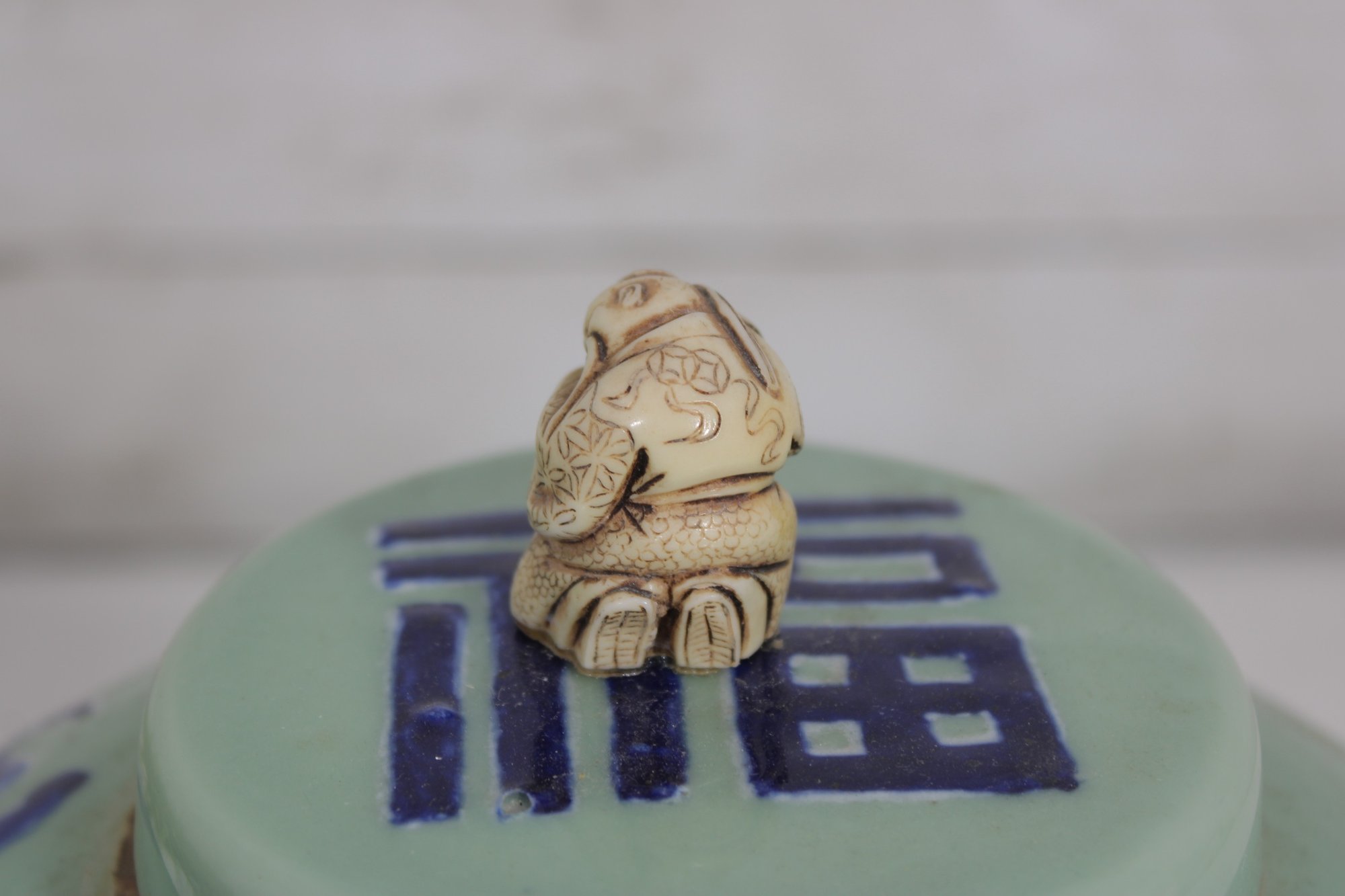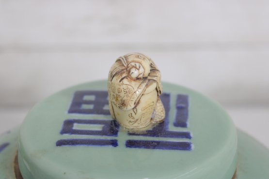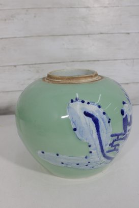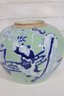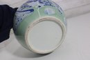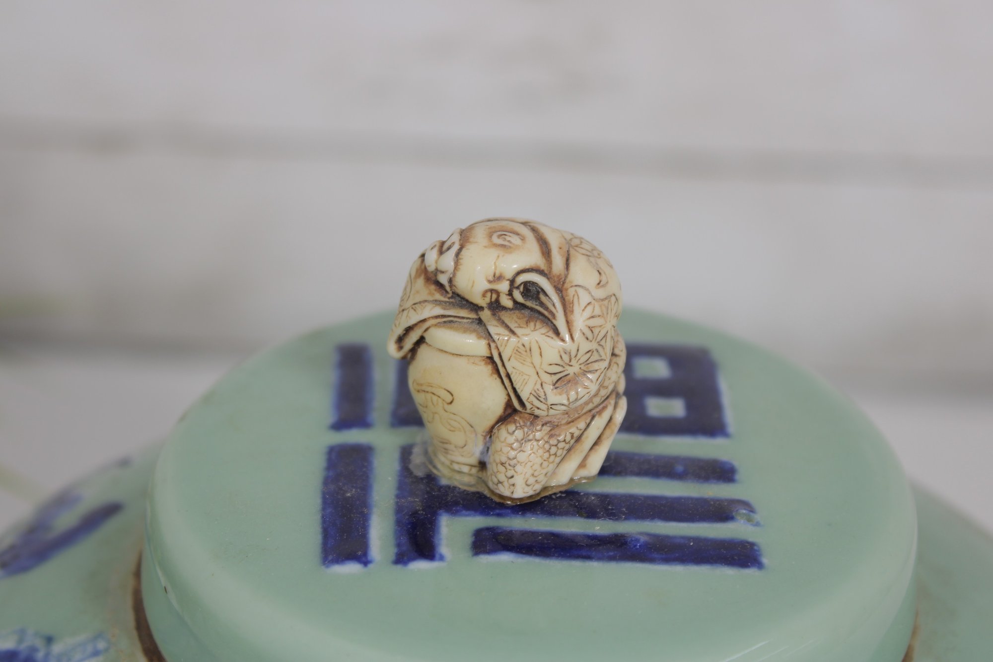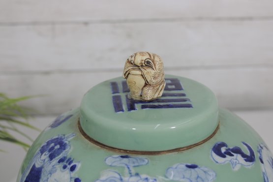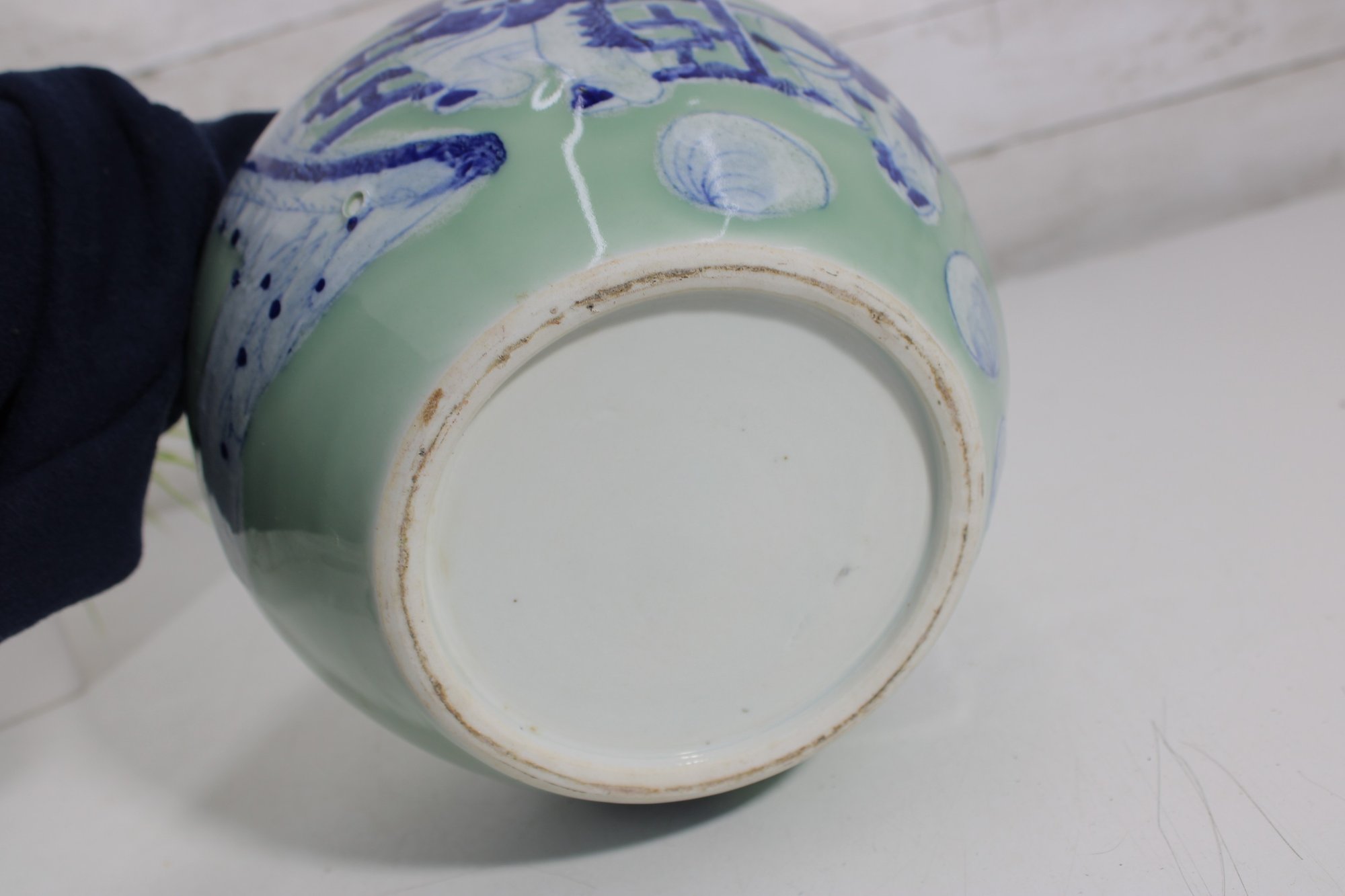 Beautiful vintage Chinese porcelain ginger jar with lid, featuring a charming hand-painted blue and white figural scene set against a soft celadon-green background.
