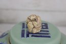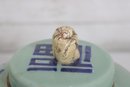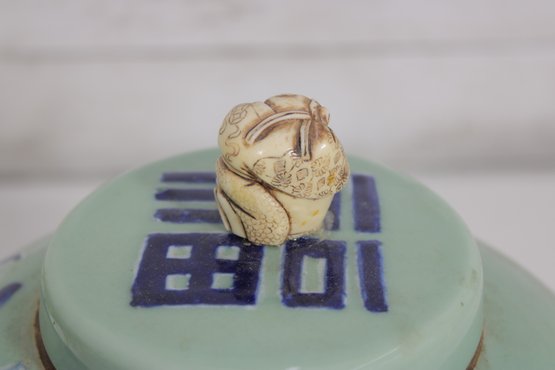 The body is decorated with playful figures and traditional motifs, while the lid is topped with an ornate sculpted finial, adding character and visual interest. The classic rounded form and vibrant cobalt detailing make this a standout decorative piece.