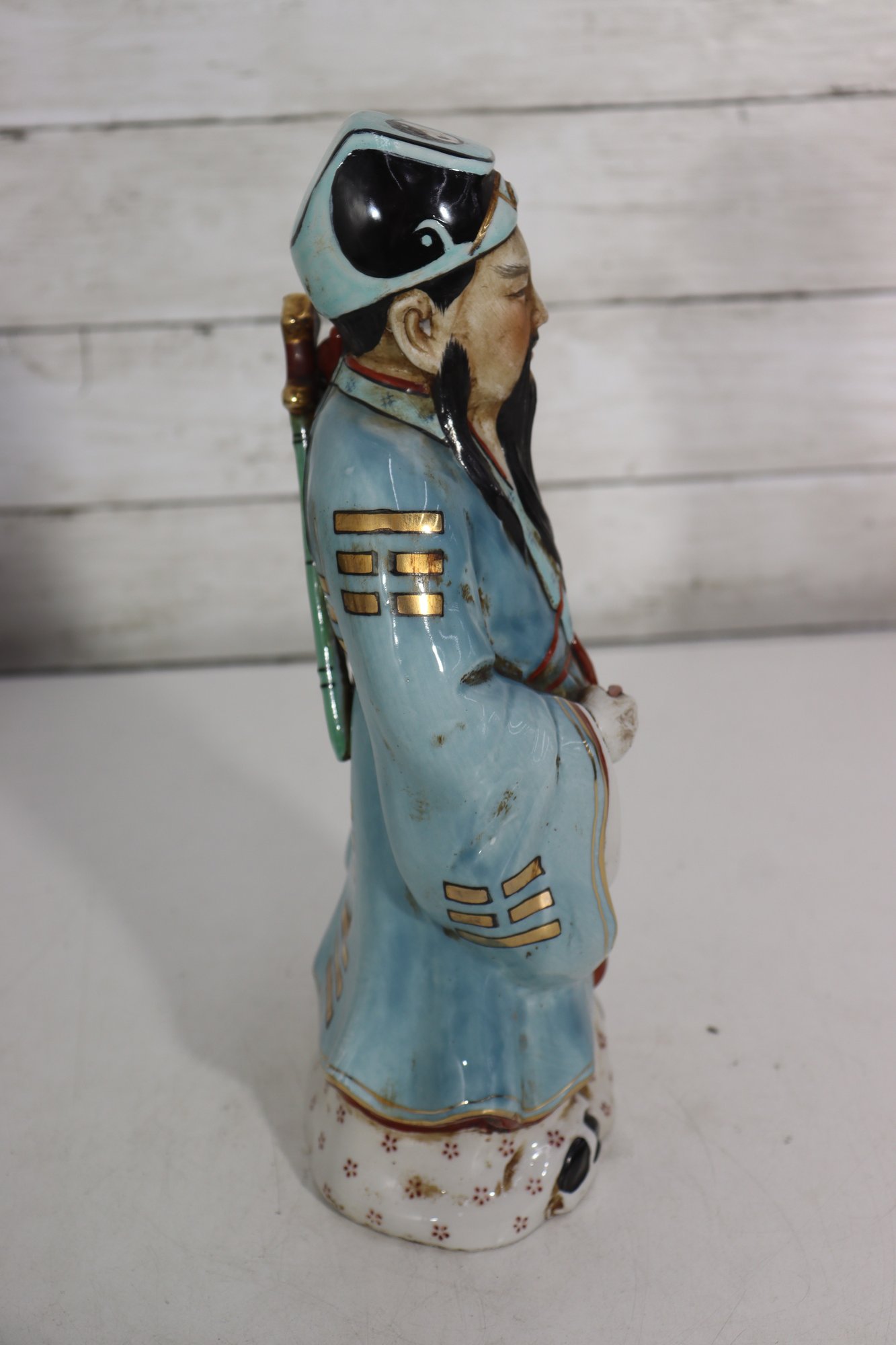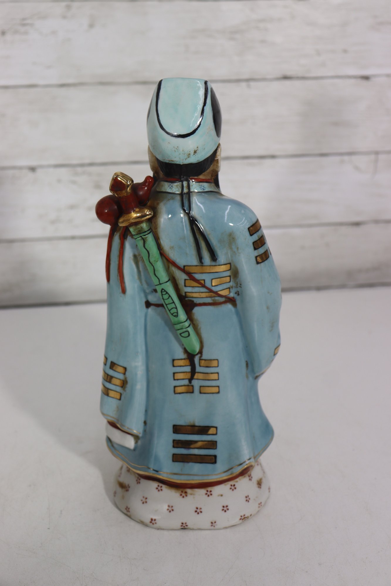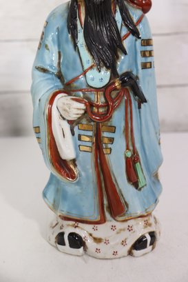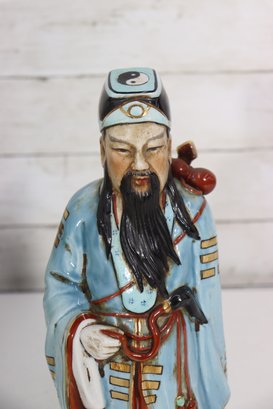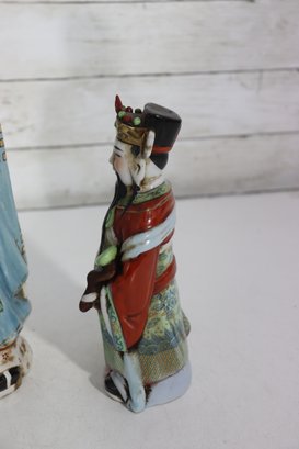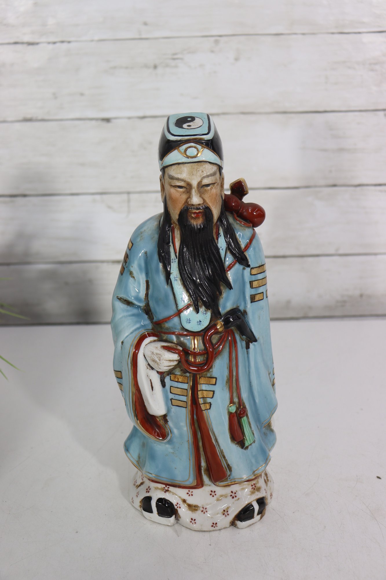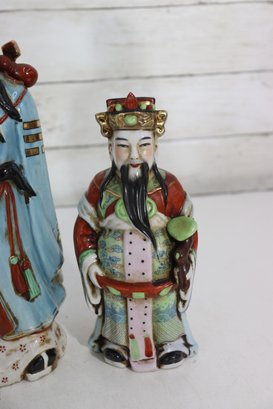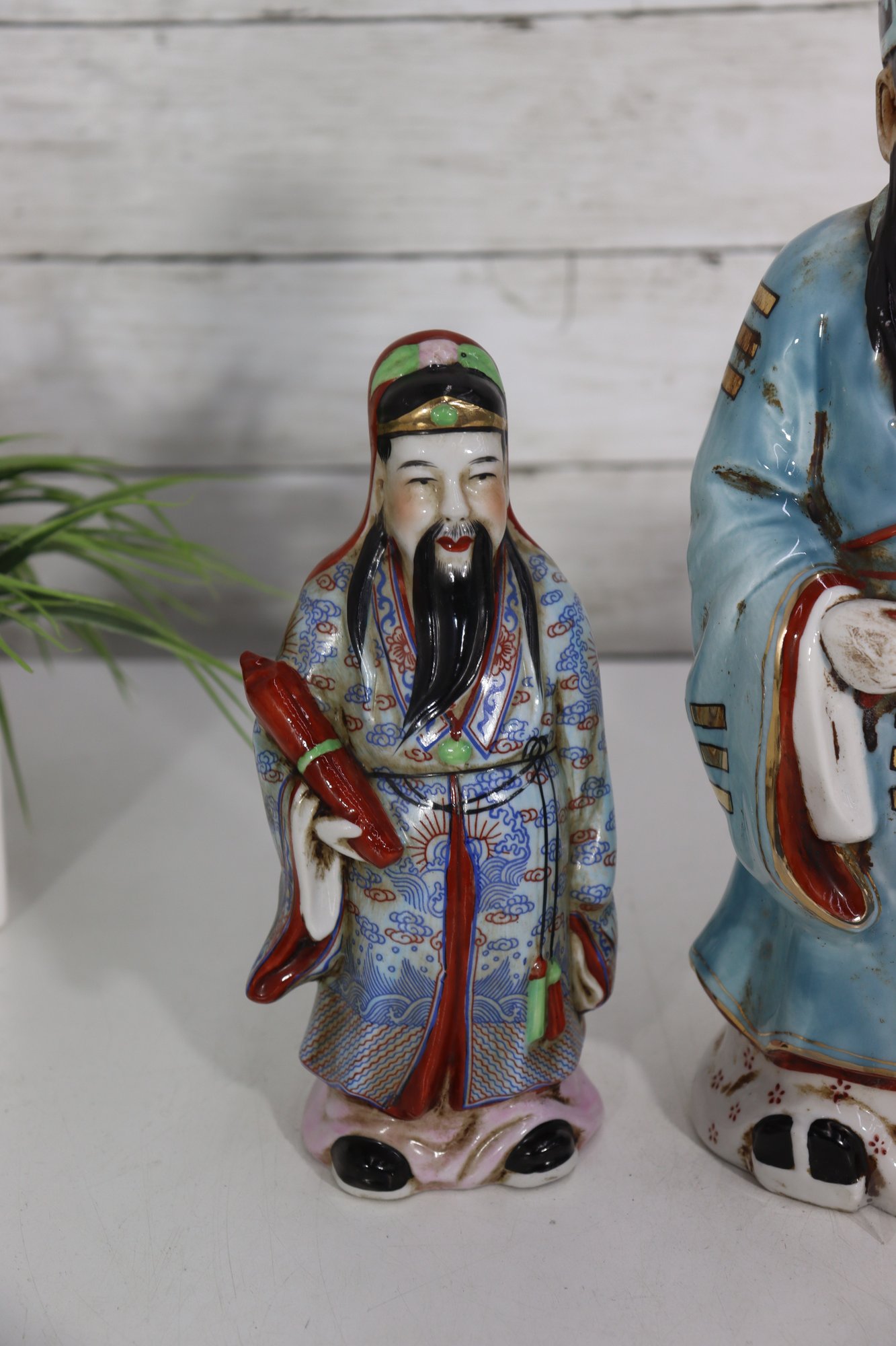an eye-catching set of three vintage Chinese porcelain figures, depicting traditional immortals / scholars in flowing robes. Each figure is individually posed and richly hand-painted in vibrant enamels with detailed facial expressions, long beards, and symbolic accessories.
