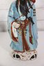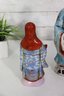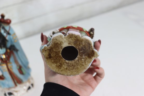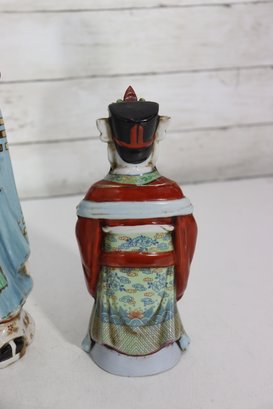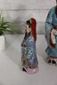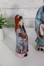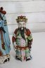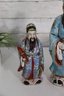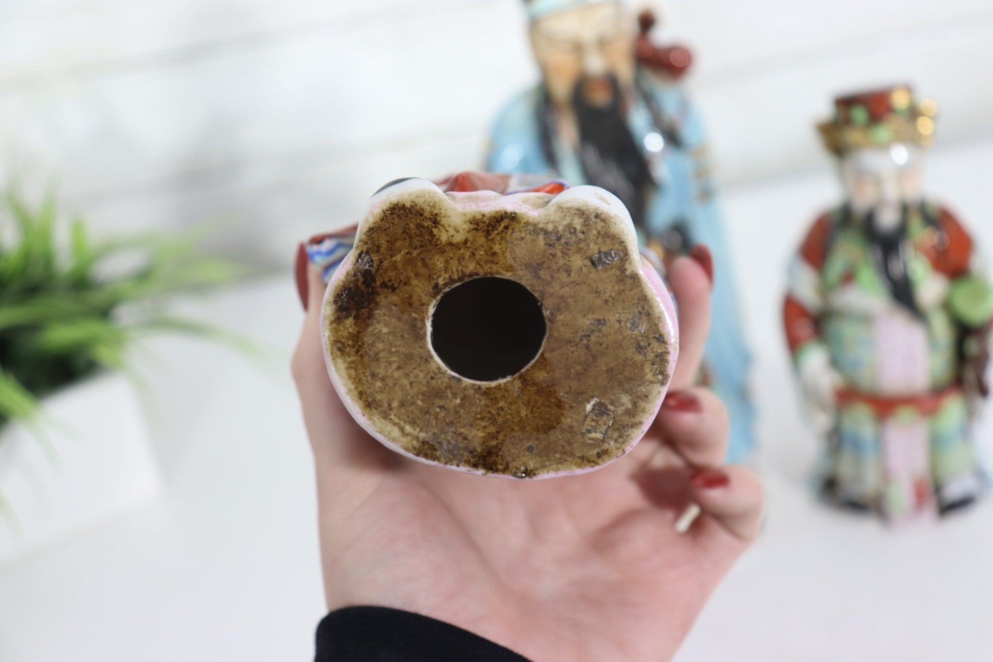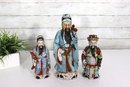 The trio displays beautifully together, each figure differing slightly in height, color palette, and attire—creating a balanced and visually striking grouping. The bases are open with firing holes, consistent with traditional porcelain production methods.