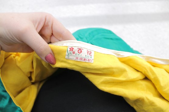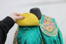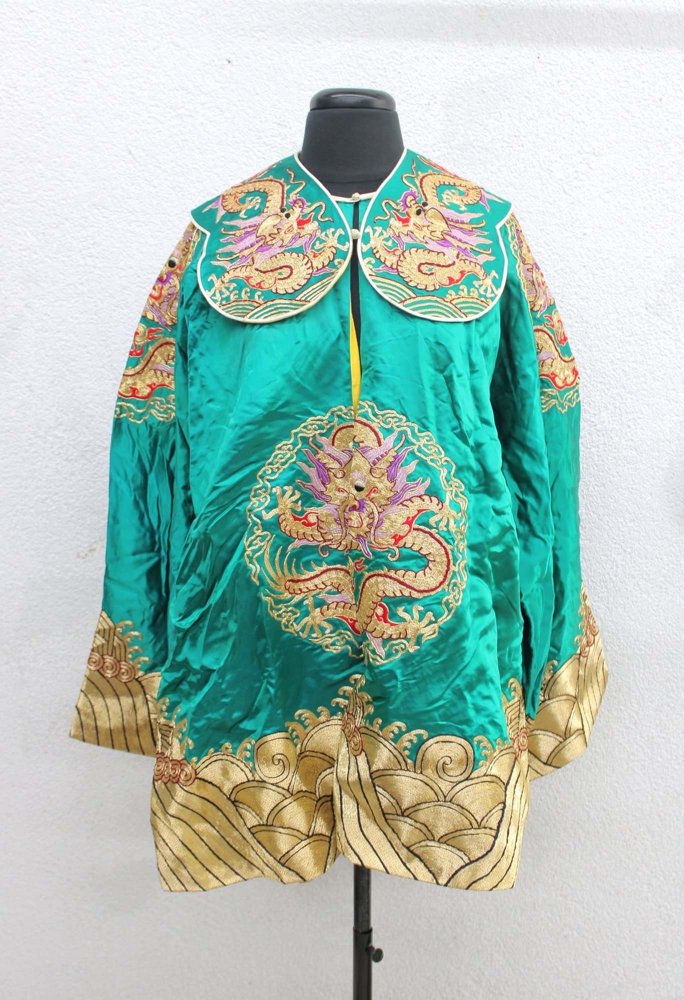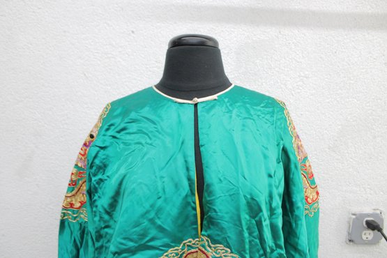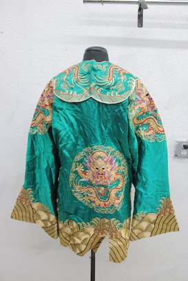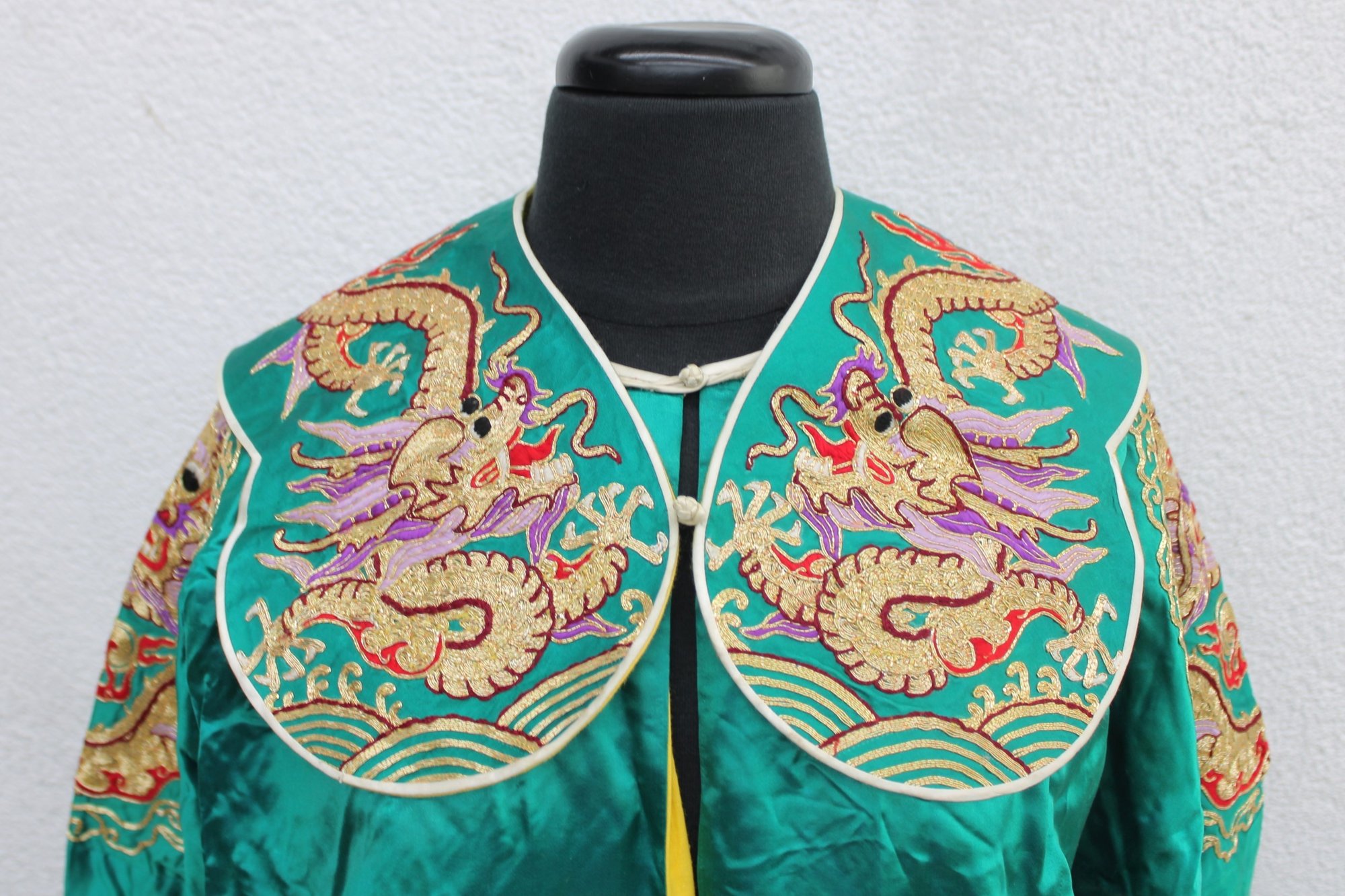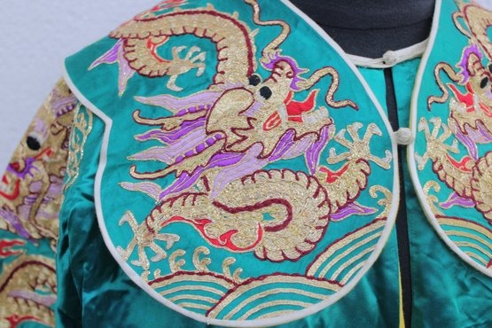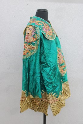 The piece has a loose, traditional cut with wide sleeves and an open front. It would make a striking display piece, costume garment, or addition to a vintage textile or Asian clothing collection.