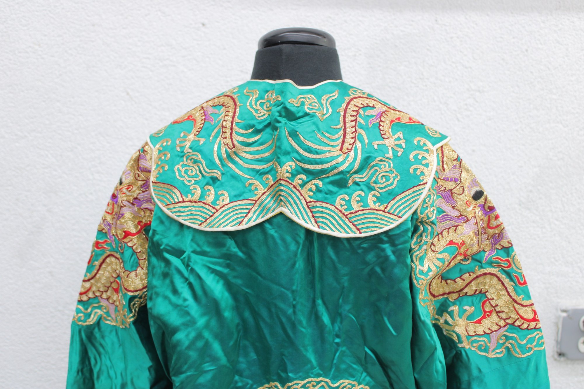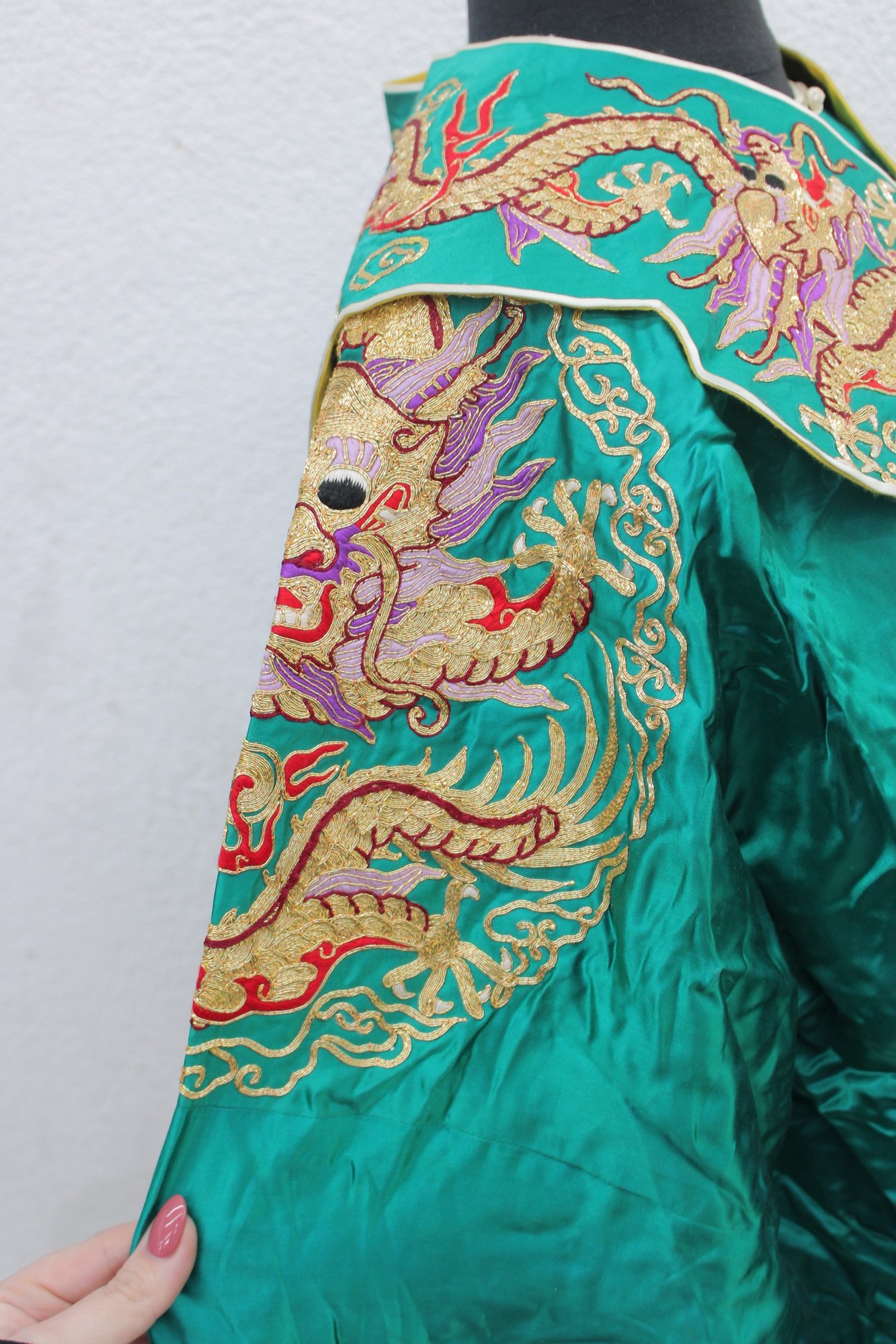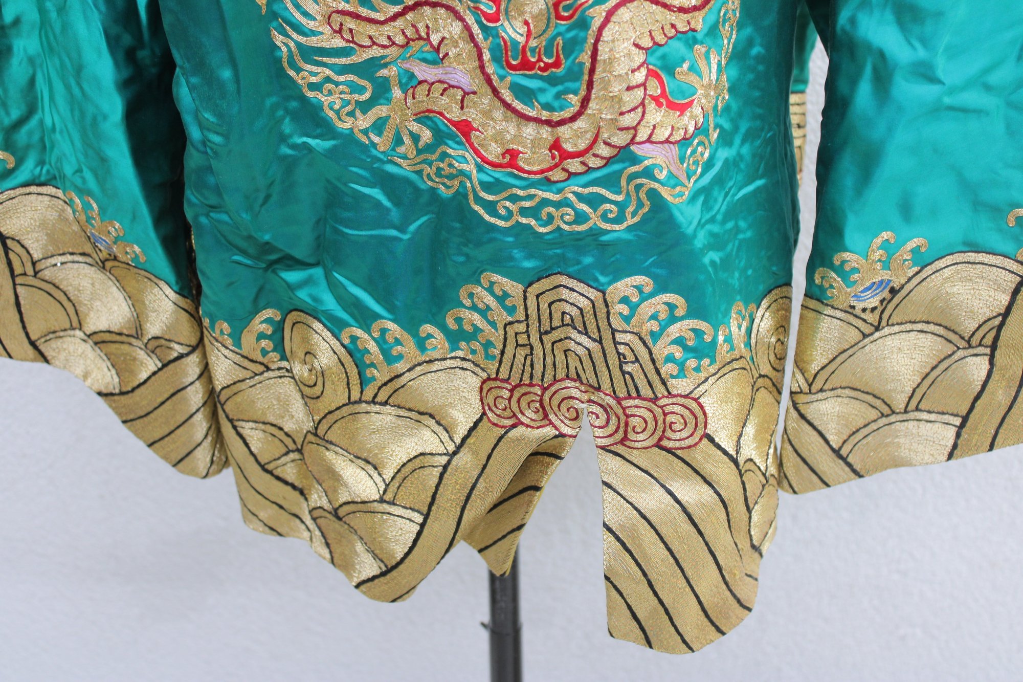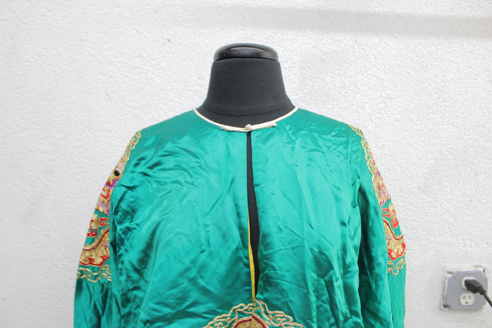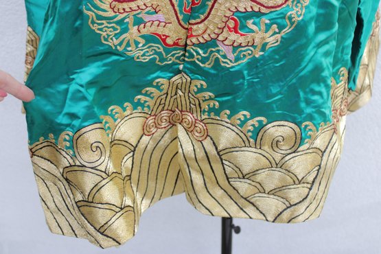 Beautiful vintage Chinese embroidered silk jacket or robe featuring elaborate dragon motifs and traditional wave designs. The garment is made from vibrant green satin-like silk and richly decorated with gold, pink, and multicolor embroidery.