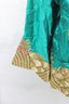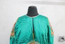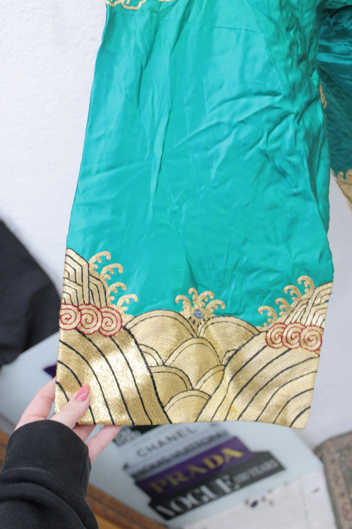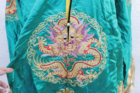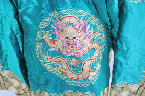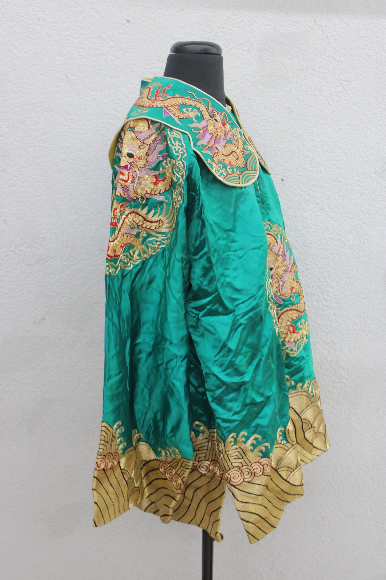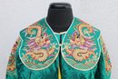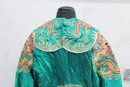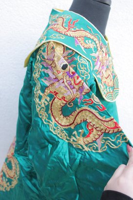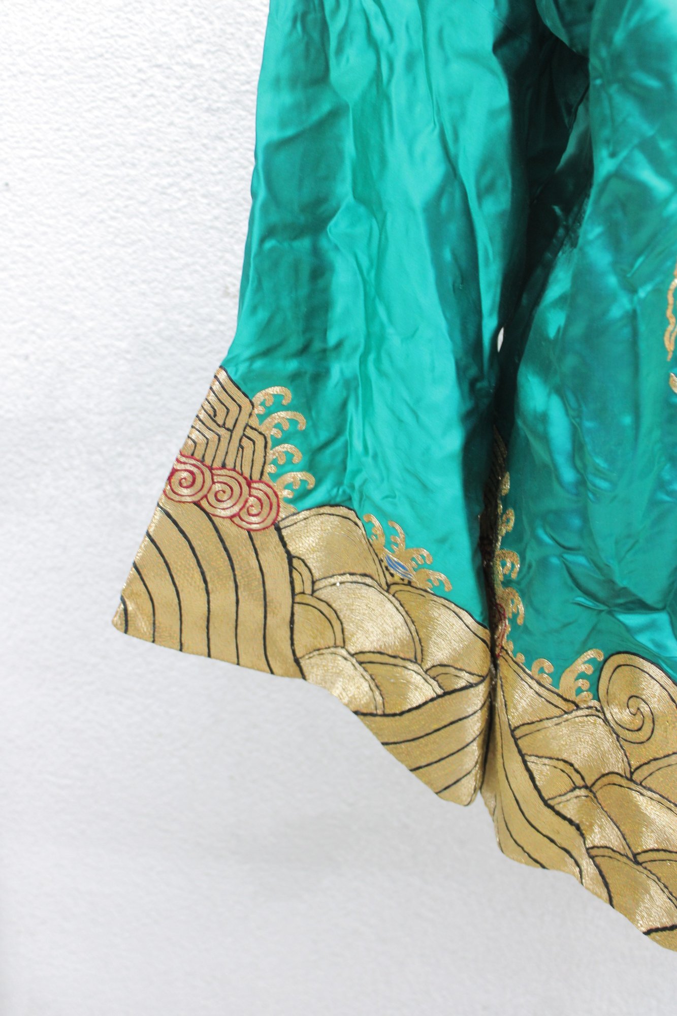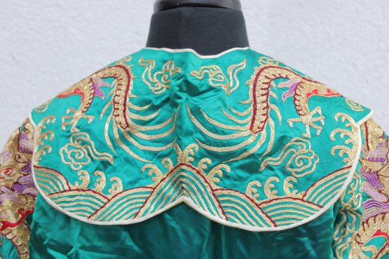 Beautiful vintage Chinese embroidered silk jacket or robe featuring elaborate dragon motifs and traditional wave designs. The garment is made from vibrant green satin-like silk and richly decorated with gold, pink, and multicolor embroidery.