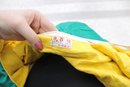 The jacket displays multiple detailed dragons across the collar and body, symbolizing power and good fortune in traditional Chinese design. The lower portion features stylized wave patterns in gold embroidery. The interior is lined in bright yellow fabric and includes a Chinese label.