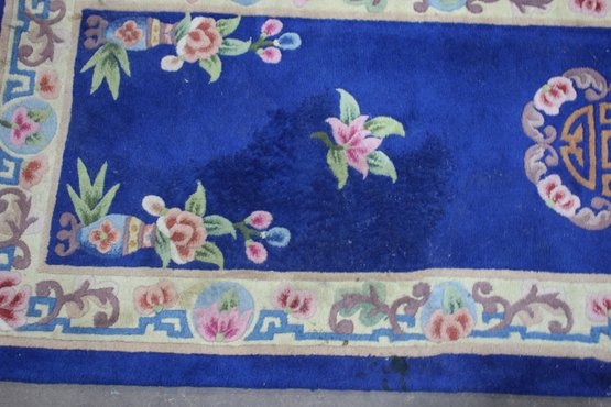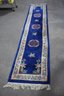 a magnificent vintage Chinese wool runner rug measuring 143.5" x 30.5". This beautifully handwoven piece features a rich royal blue field adorned with delicate floral medallions and elegant pastel floral patterns along the border. The vibrant colors and detailed craftsmanship make it a striking addition to any hallway or narrow space.