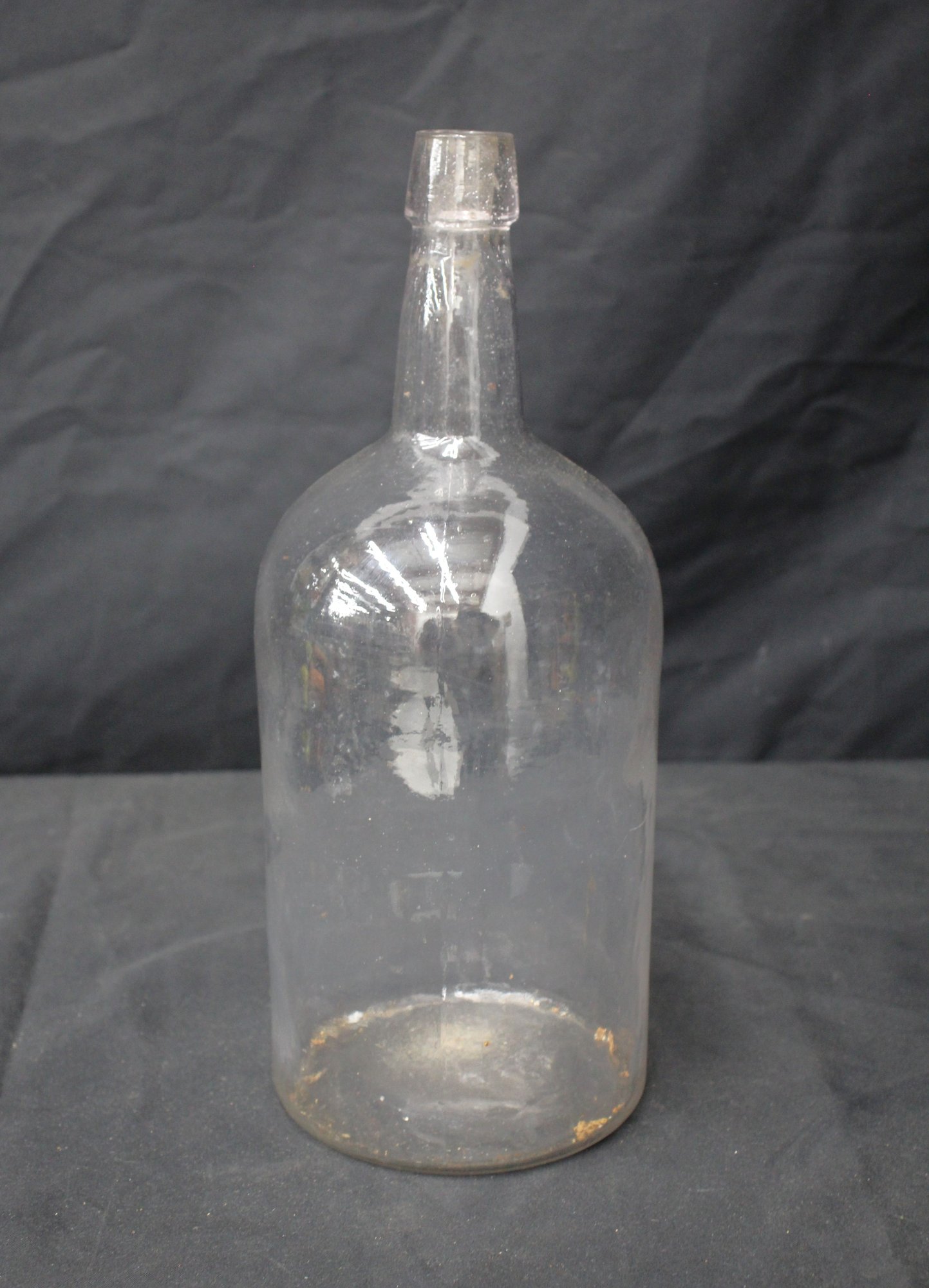 a clear glass apothecary bottle standing 15 inches tall, exuding the charm of yesteryear's pharmacies and laboratories. This bottle features a simple yet classic design with a stout base and a narrow neck, hinting at its practical past where it may have held a variety of substances for either medicinal or scientific purposes.