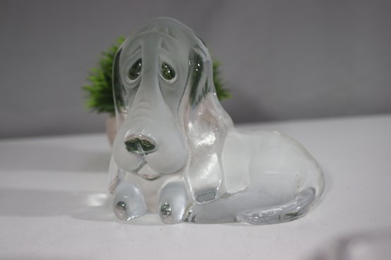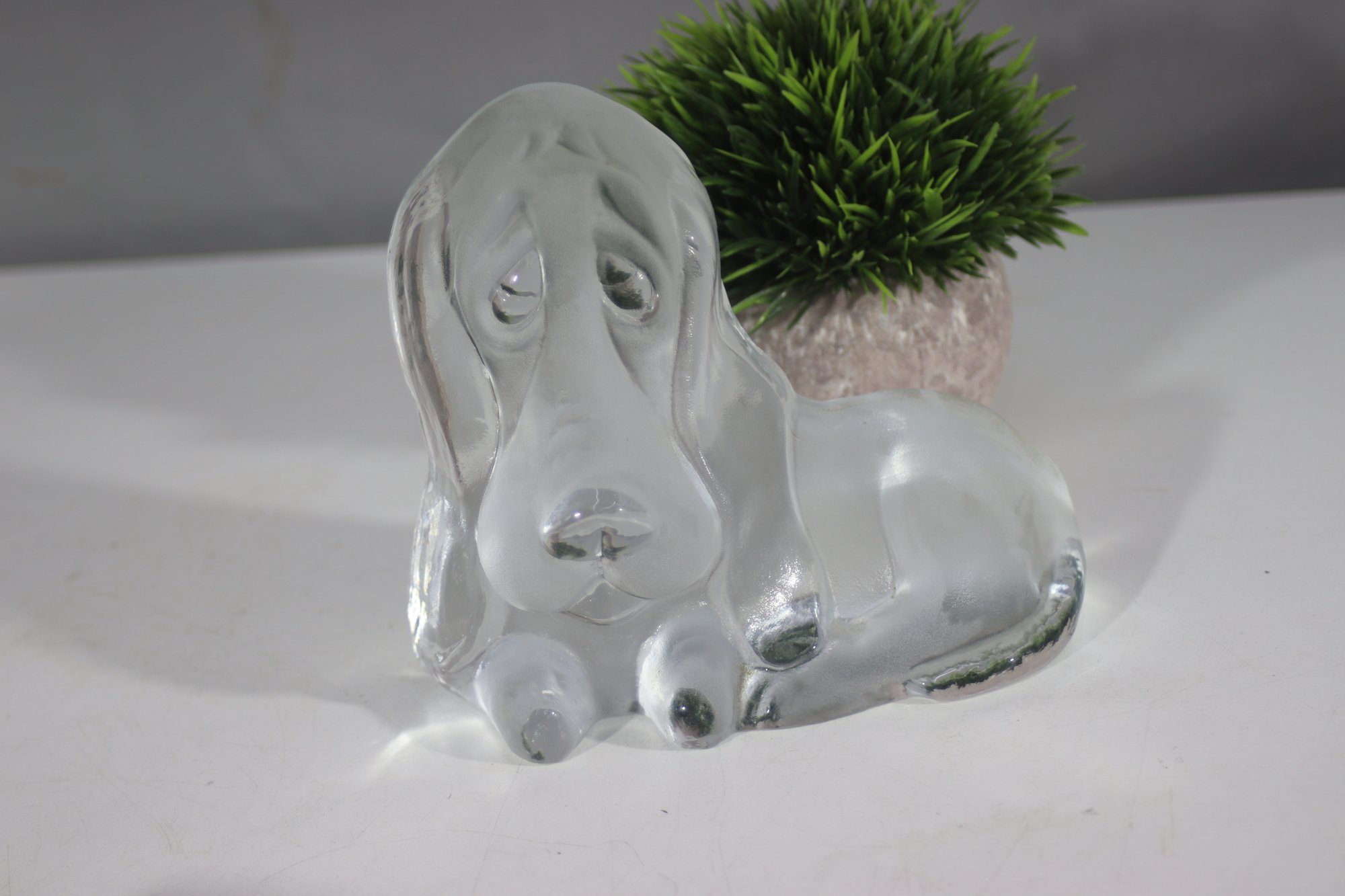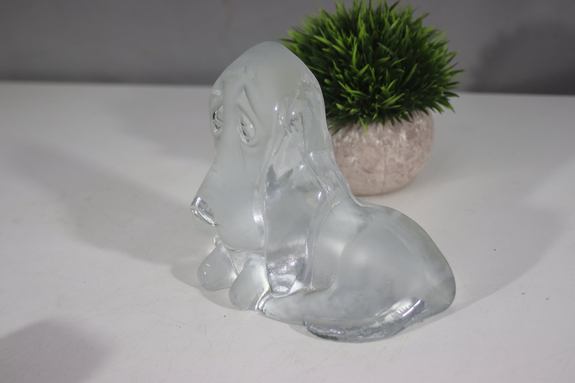 This charming vintage clear glass figurine features a detailed depiction of a basset hound dog in a resting position. With its droopy eyes and long ears, this piece captures the essence of the beloved breed. The solid glass construction makes it a perfect decorative piece or a functional paperweight.