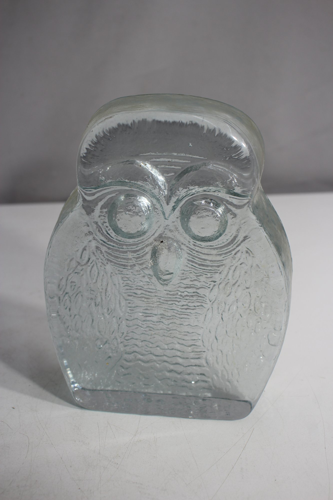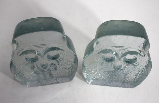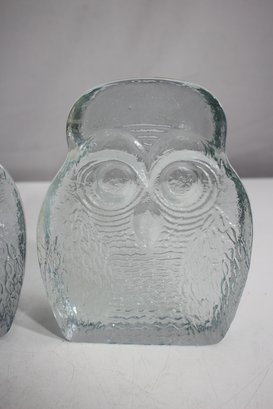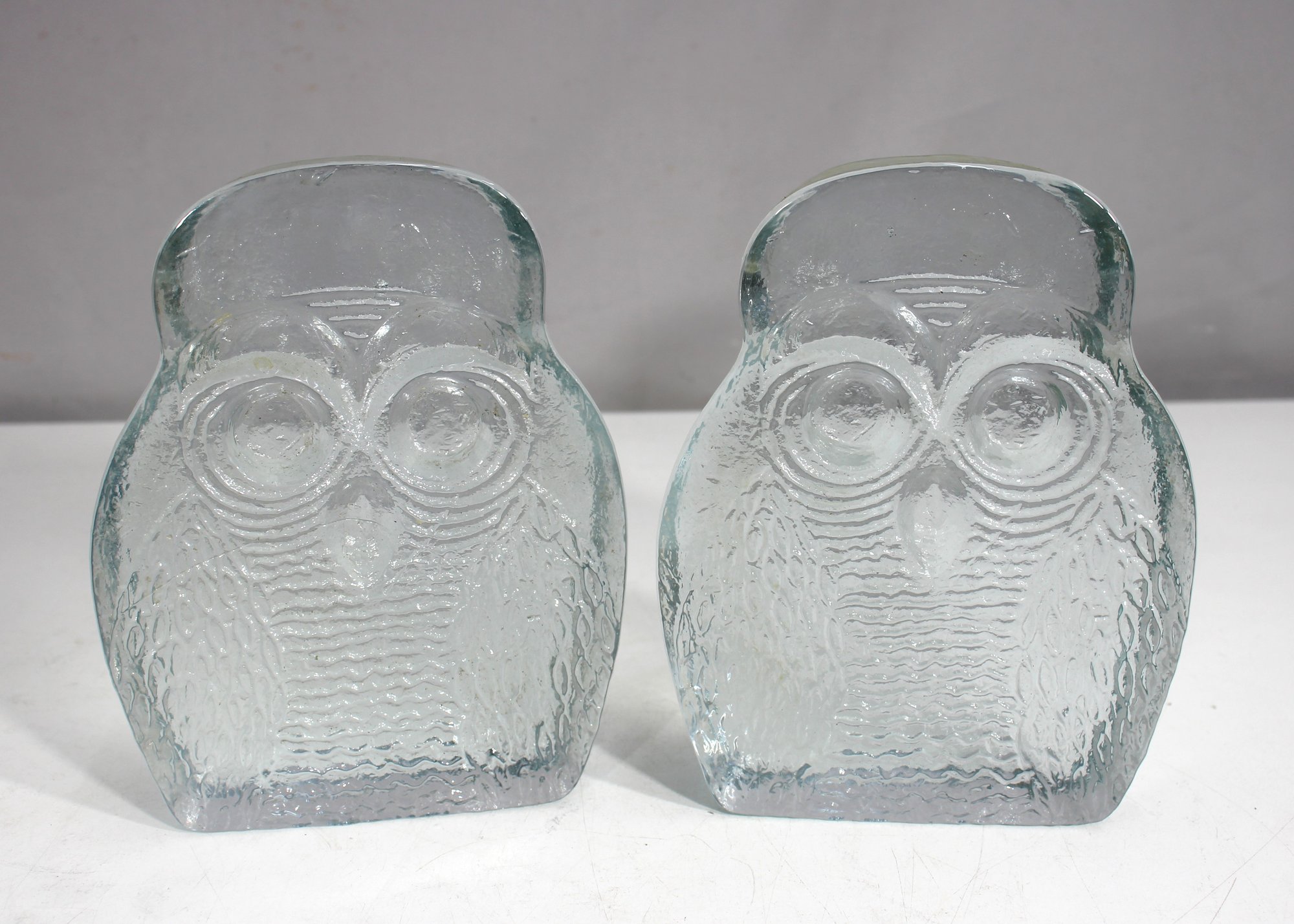 Add a touch of wisdom and charm to your bookshelf with this stunning pair of vintage clear glass owl bookends. These beautifully textured glass pieces showcase intricate feather detailing and large, round eyes, making them both functional and decorative.