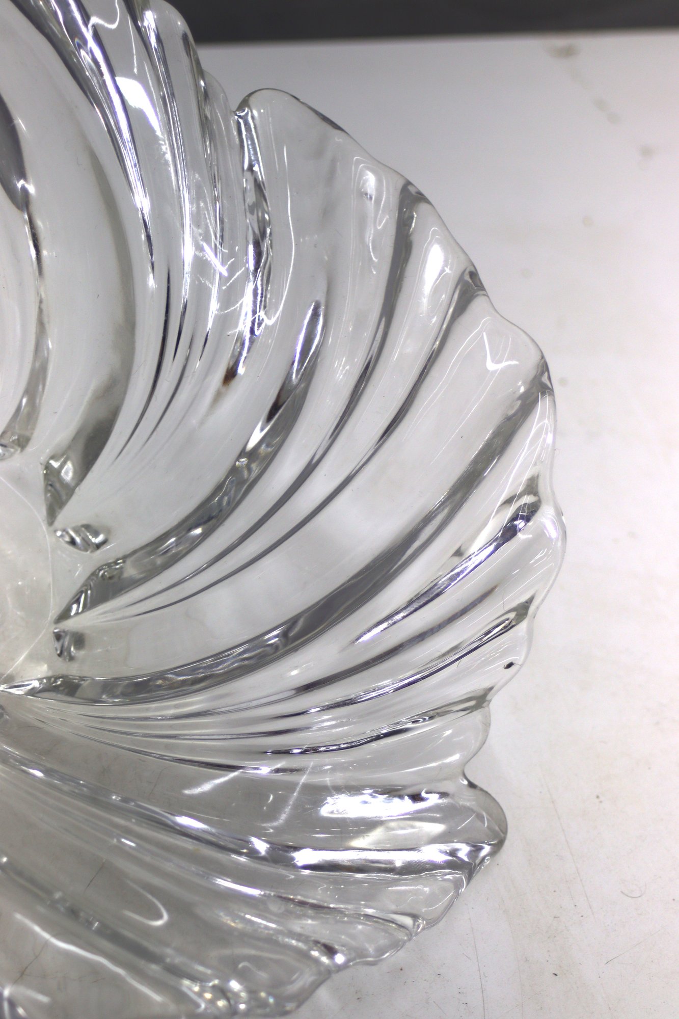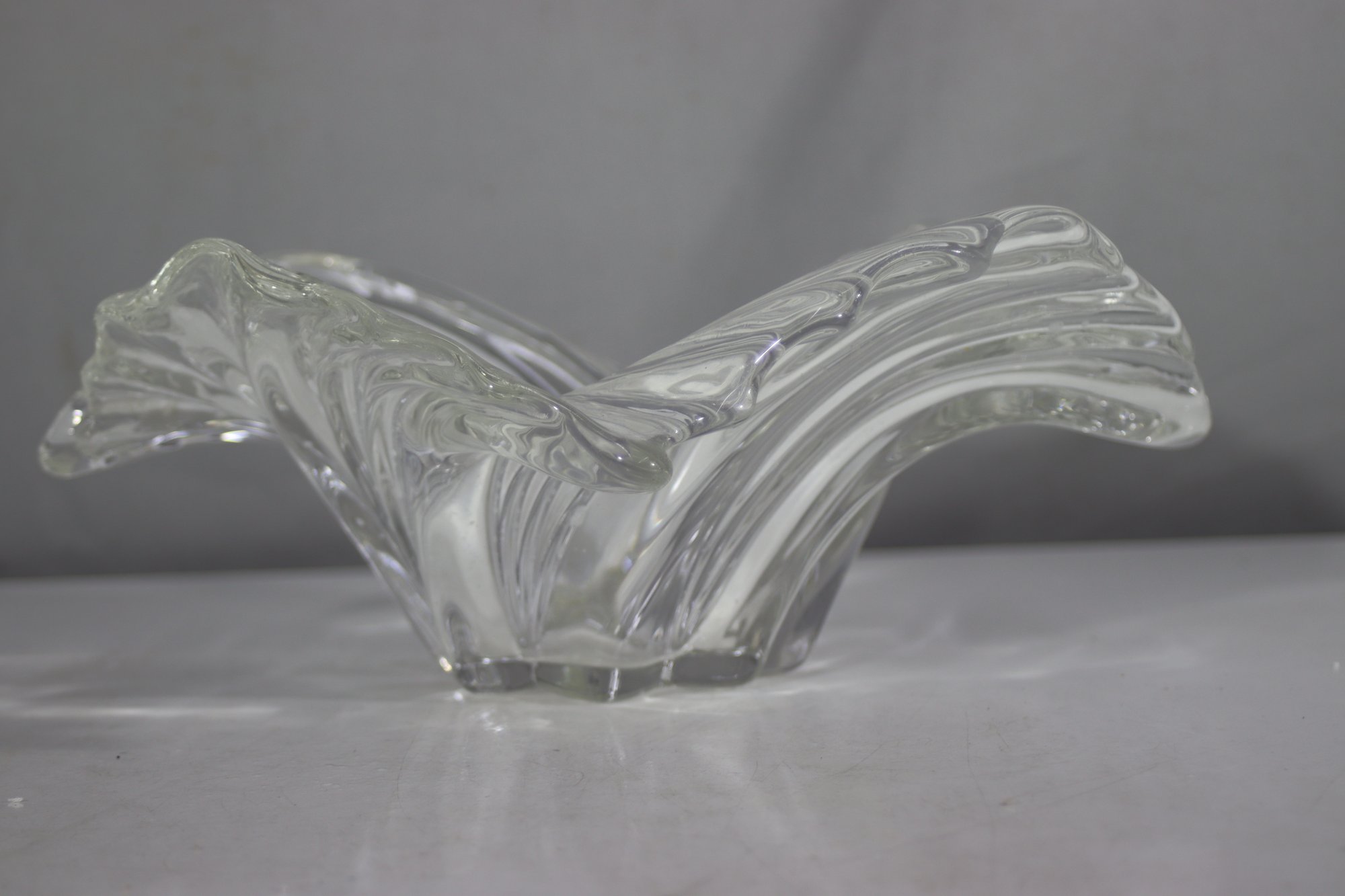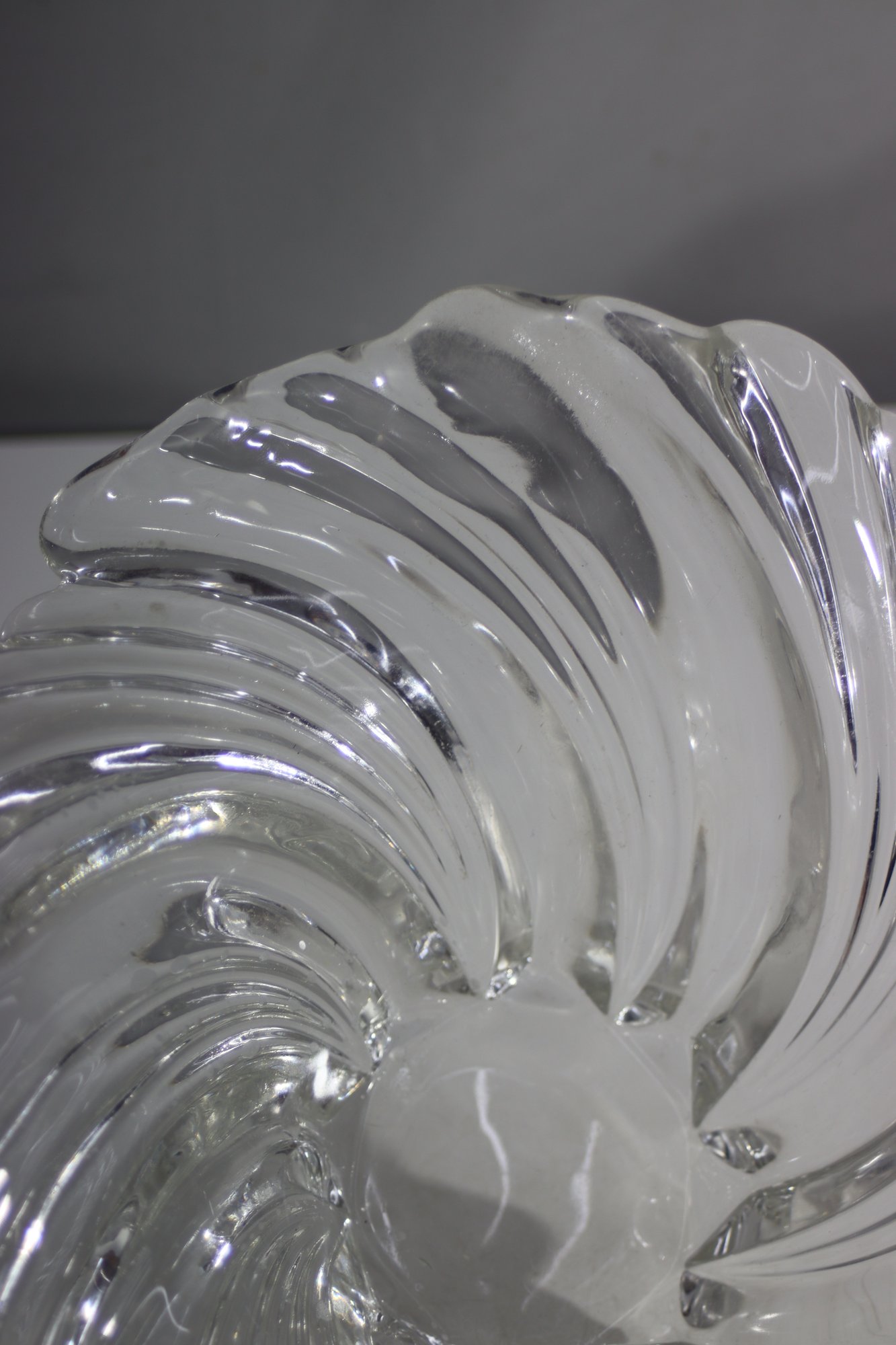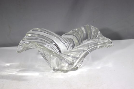 vintage clear glass bowl with a beautiful swirl wave design. This unique piece features an elegant sculpted form with flowing ridges that reflect light beautifully. A perfect centerpiece, fruit bowl, or decorative accent for any home!