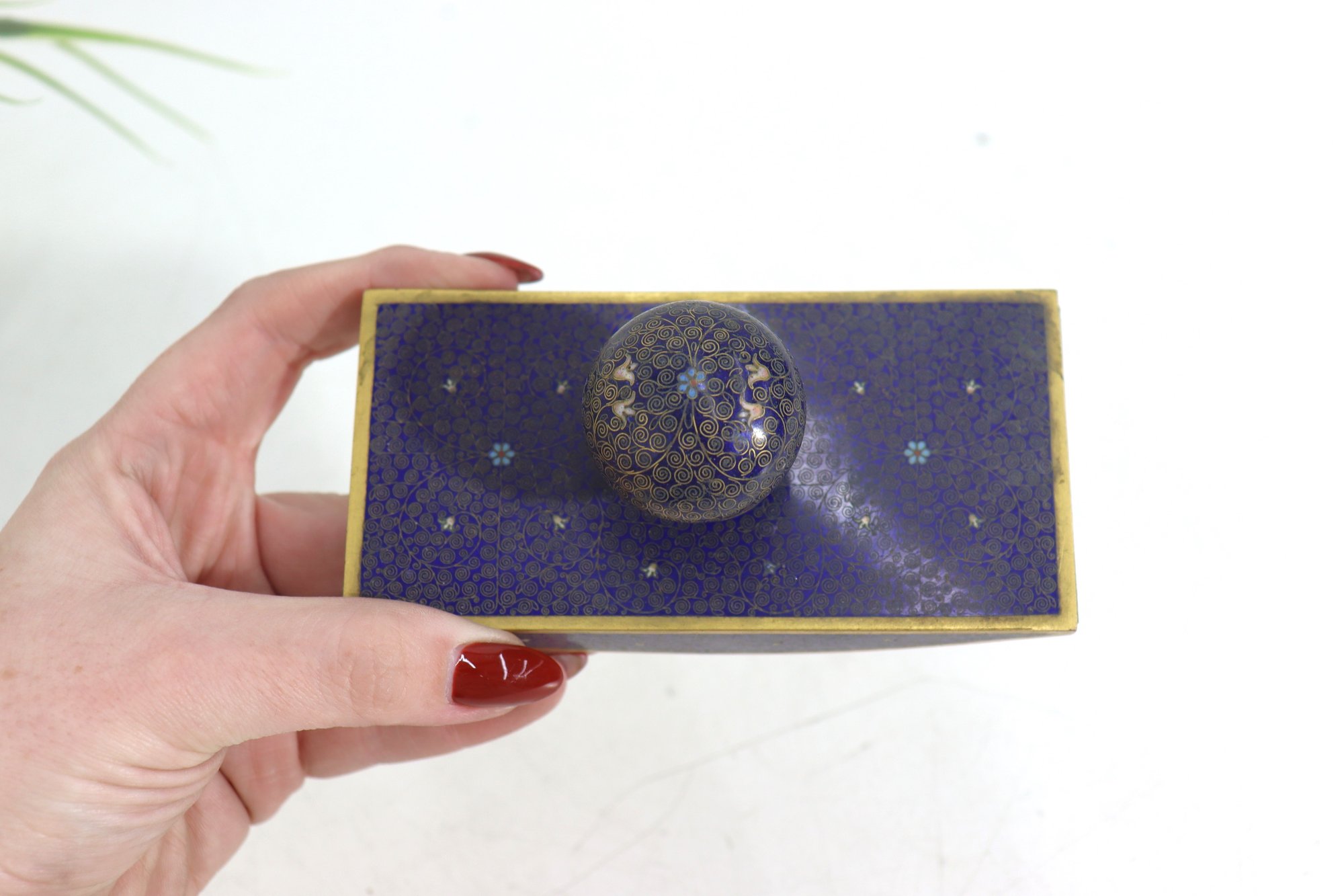 This blotter measures 5 inches long and has a lovely curved base with original paper backing. The handle is rounded and comfortable to hold, showcasing matching cloisonné artistry. Perfect for collectors of writing instruments, antique desk décor, or cloisonné enamelware.