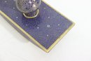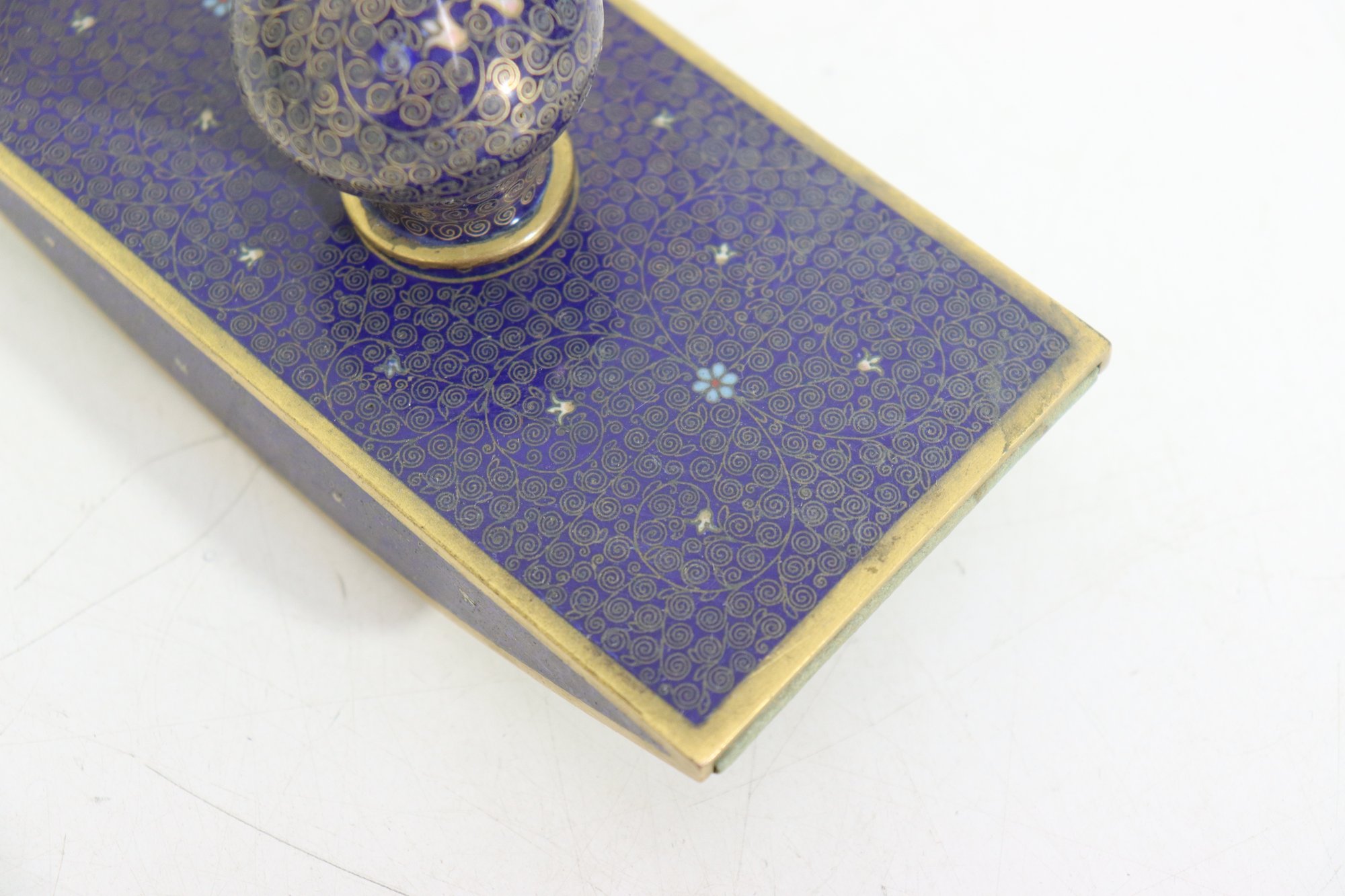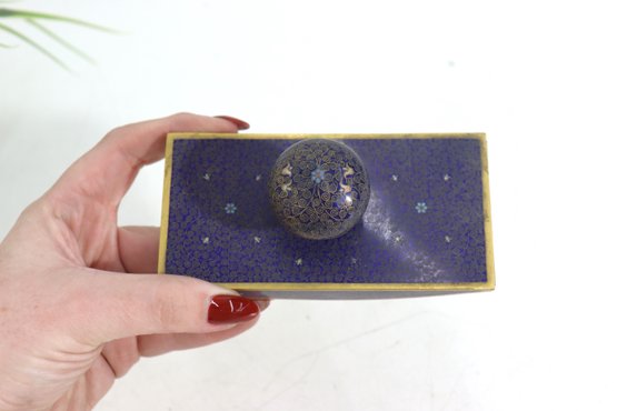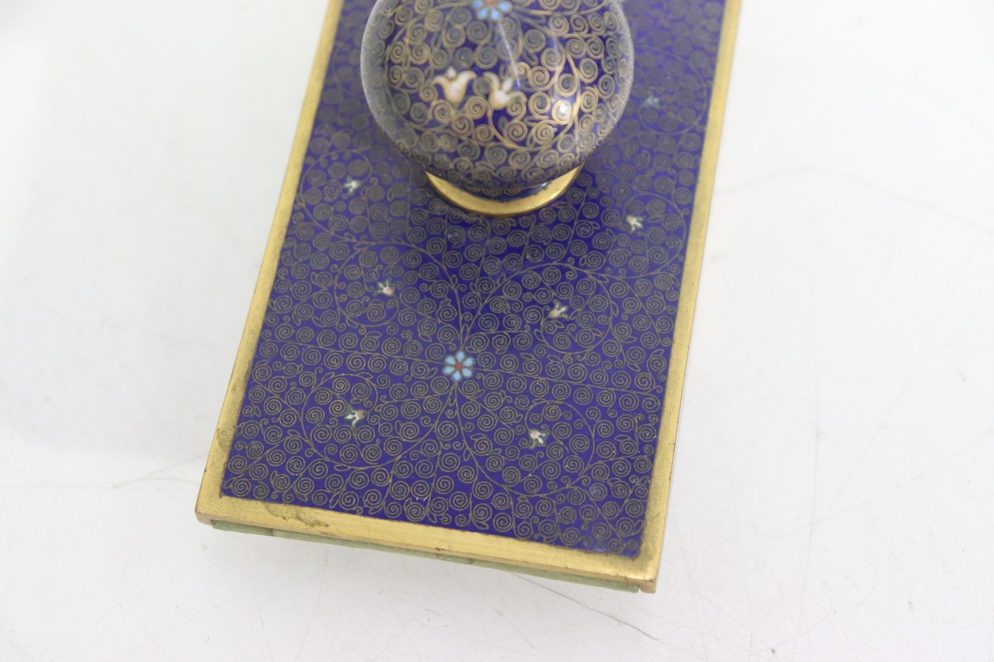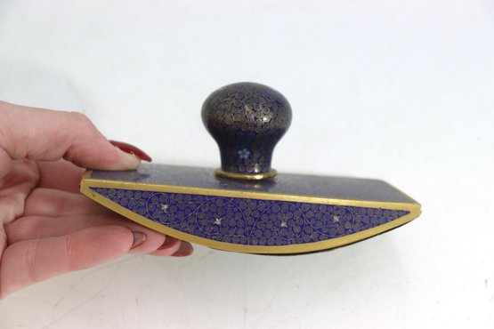 vintage cloisonné ink blotter, featuring an elegant deep blue enamel surface adorned with intricate floral and geometric patterns. The gold-tone trim adds a refined finish, making this piece both a functional writing accessory and a decorative collectible.