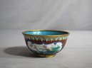 This exquisite piece features a vibrant turquoise interior that contrasts splendidly with the intricate exterior design of florals and avian motifs. The exterior is adorned with an array of vivid colors, bounded by fine golden trims that highlight the mastery of the cloisonné technique. The bowl sits on a delicate golden base, which elevates its presence and adds to its allure.