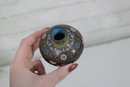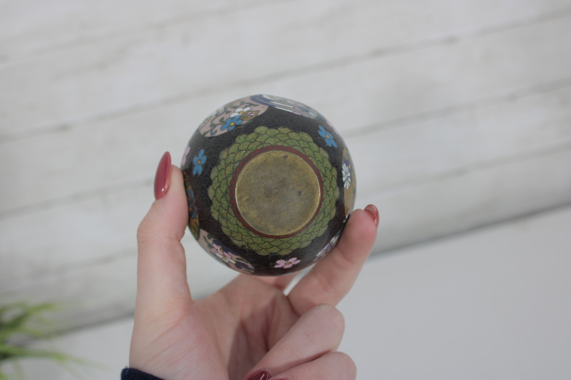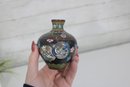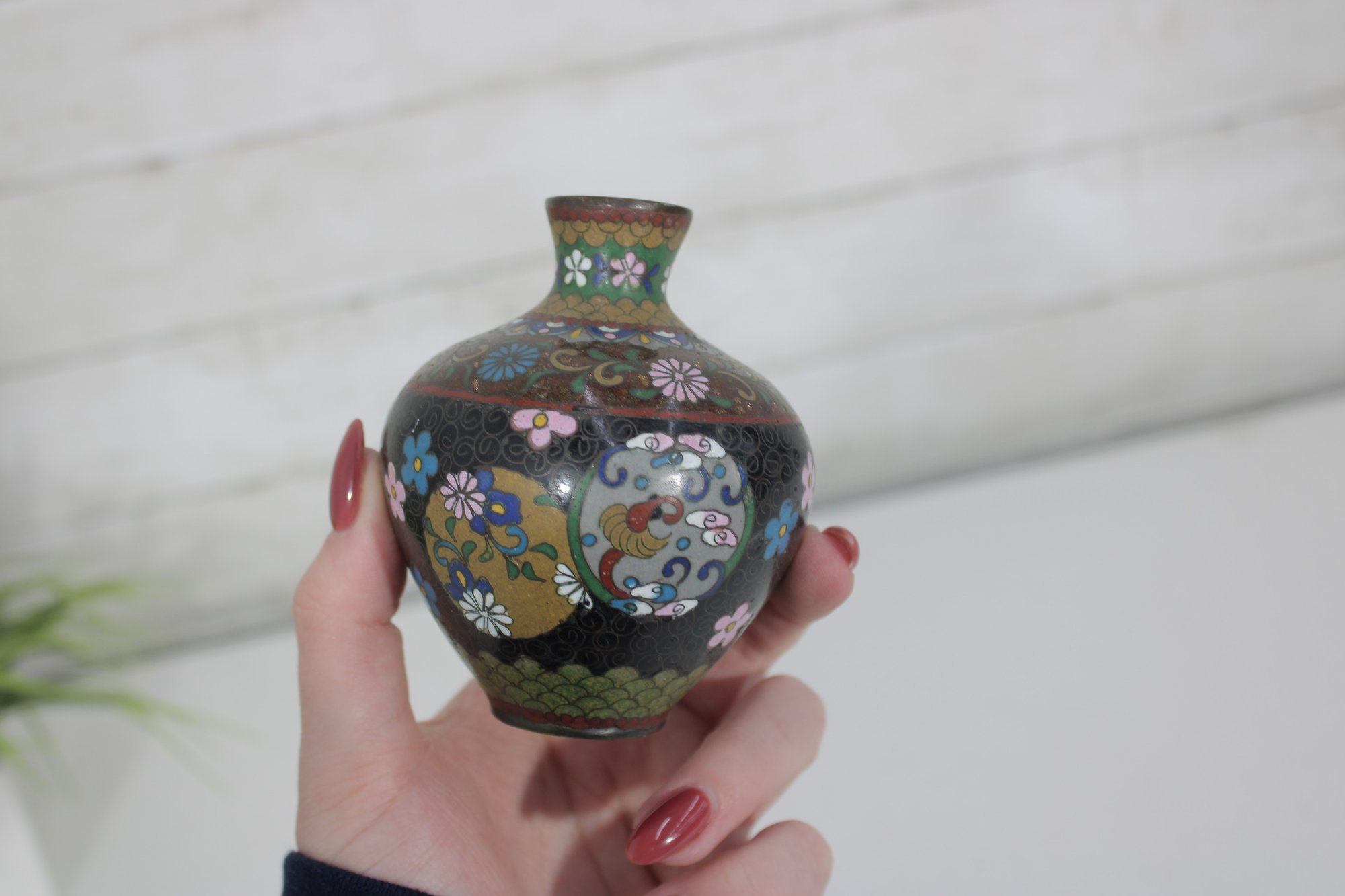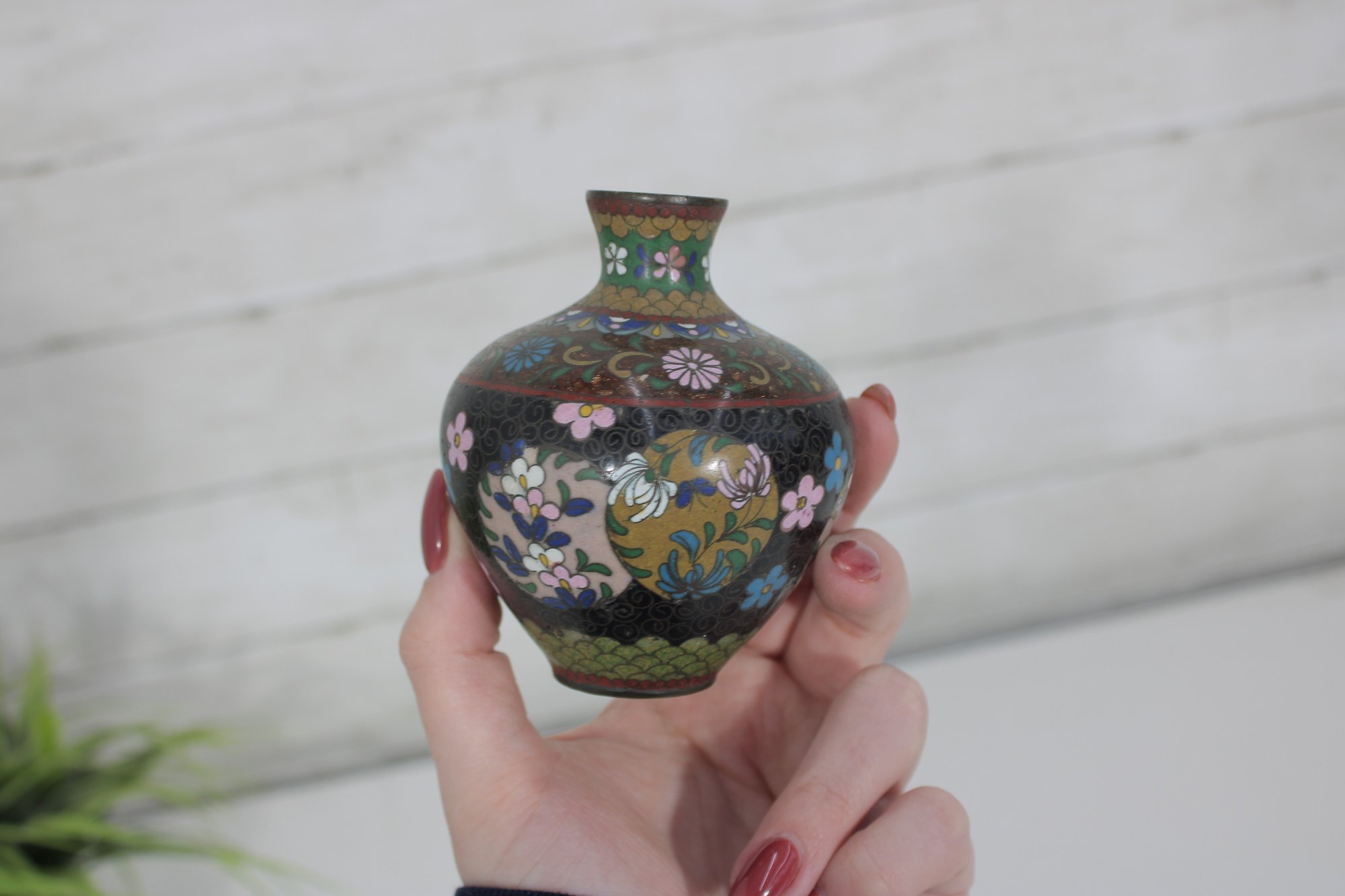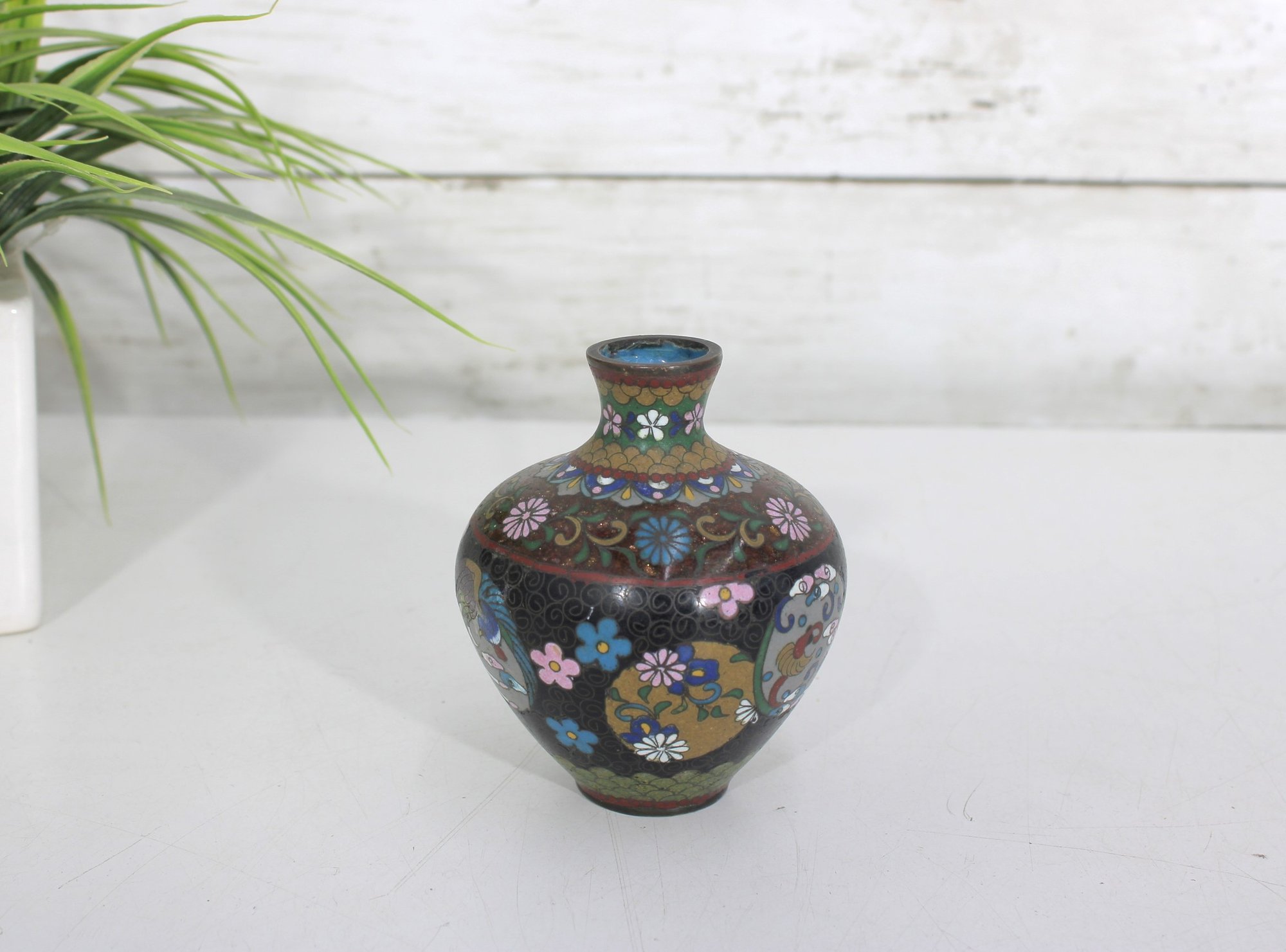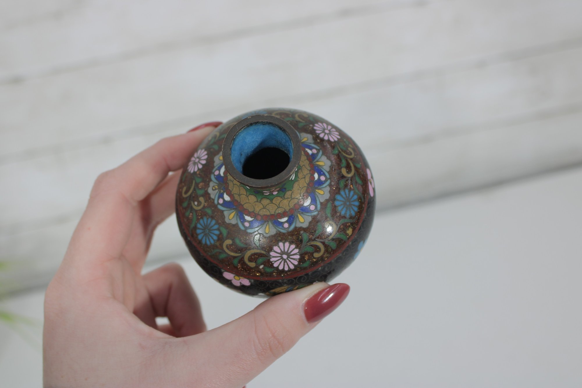 This small decorative bud vase features a rich dark enamel ground adorned with intricate multicolor floral designs, including blossoms in pink, blue, white, and yellow with detailed green foliage. The fine brass cloisonné wirework outlines each motif, creating a vibrant and textured surface. The interior appears to be enameled in a complementary blue tone.