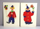 This charming vintage pair of mixed media clown artworks features colorful felt appliqué designs mounted on wooden panels. Each piece showcases a whimsical clown character, one holding balloons and the other presenting a flower, creating a lively and nostalgic display.