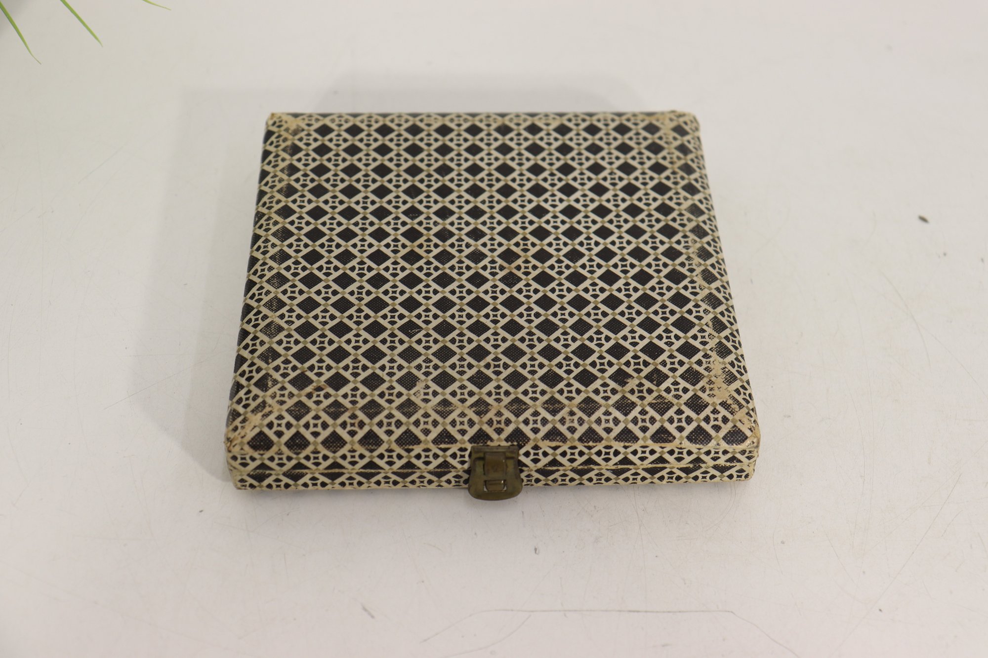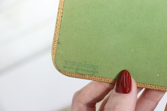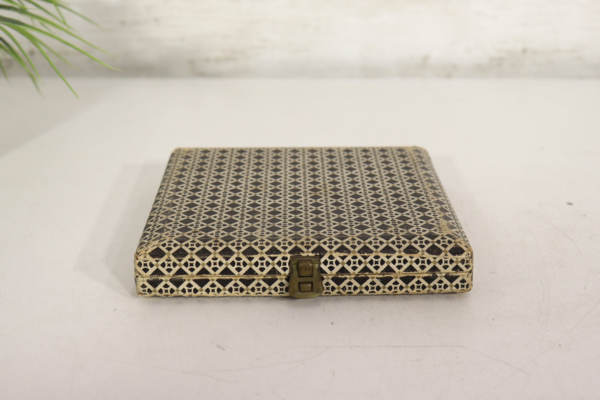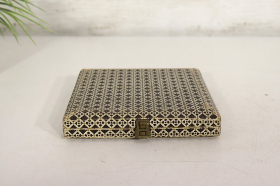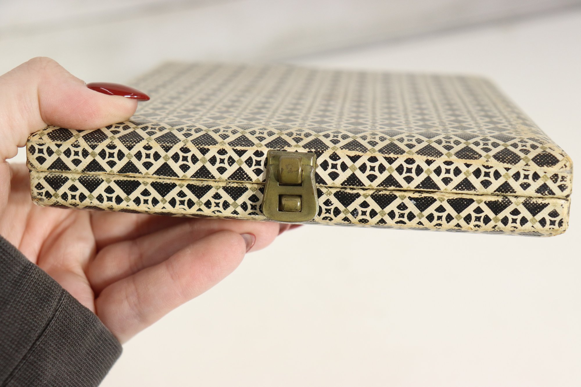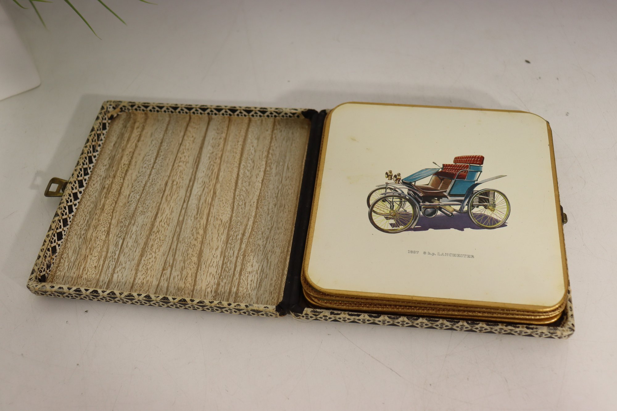 Comes with its original decorative storage case with lattice style pattern and brass latch closure. Great vintage display piece with retro automotive artwork.