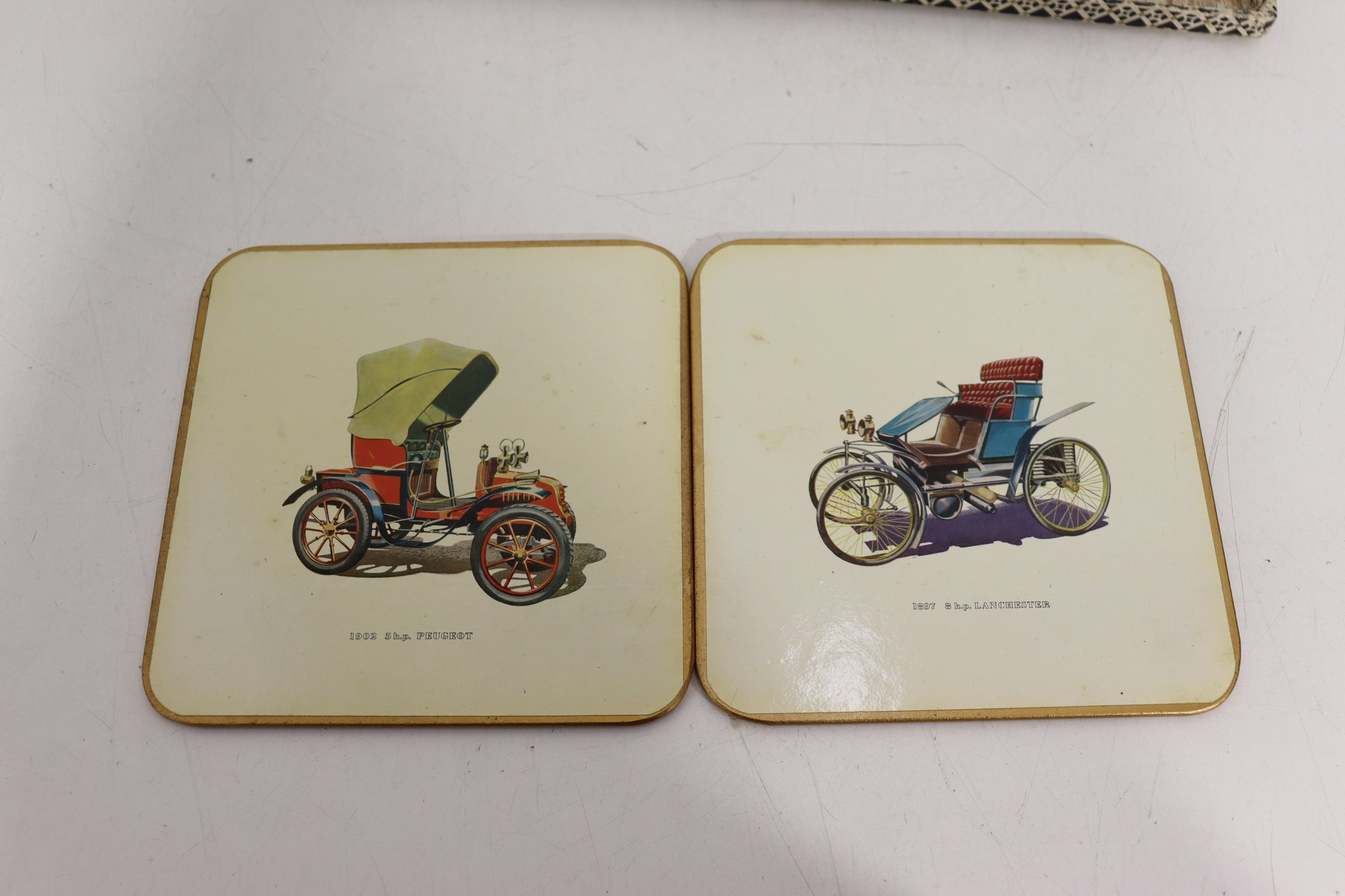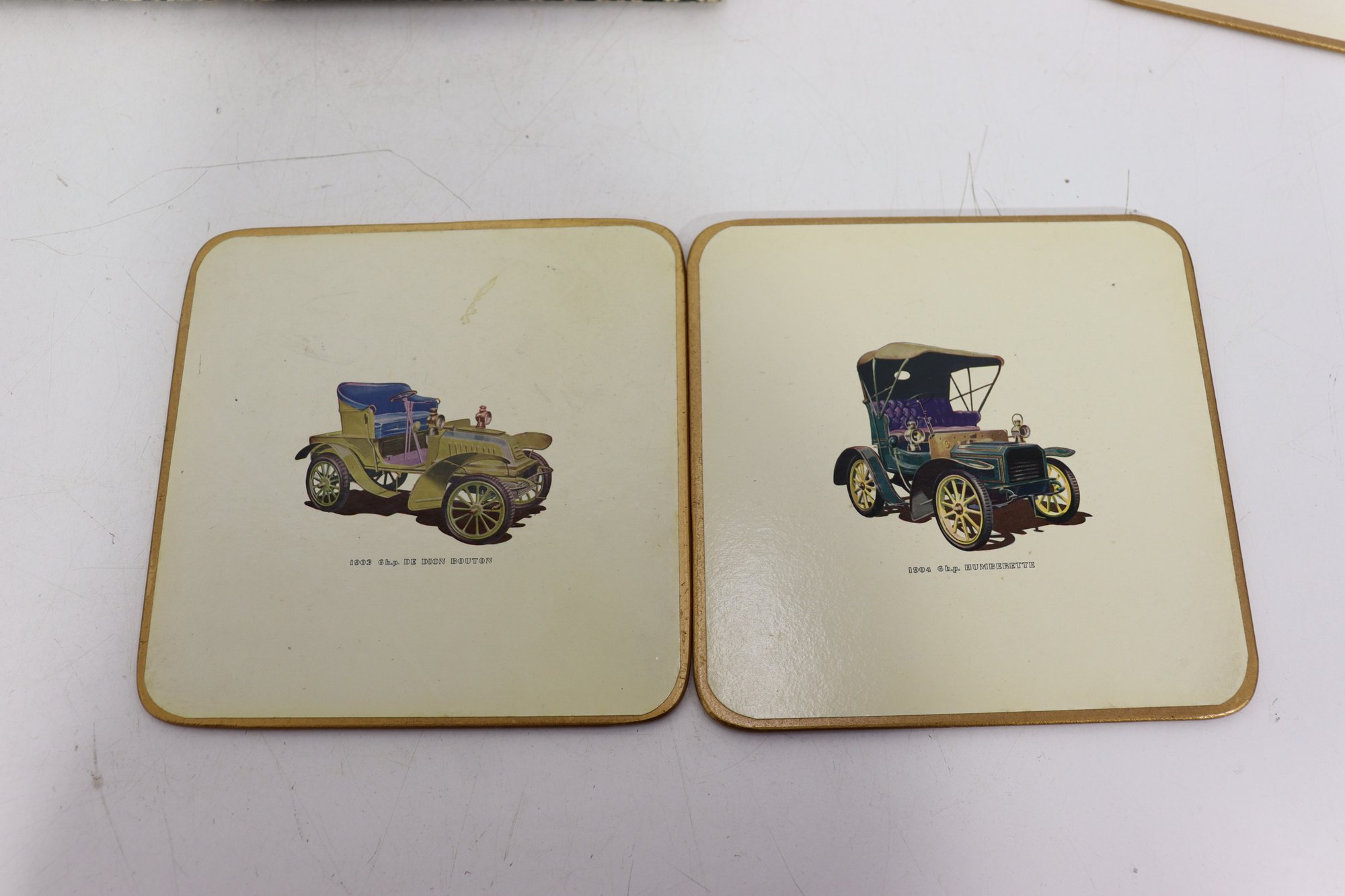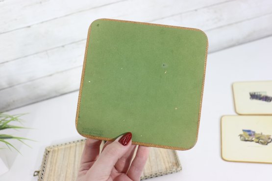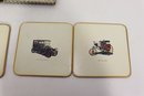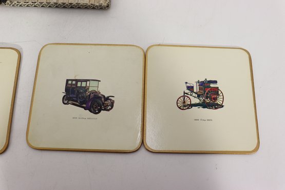 Vintage set of 6 English drink coasters featuring colorful illustrations of early antique motor cars. Each coaster measures approx. 6” and is marked Made in England on the back.