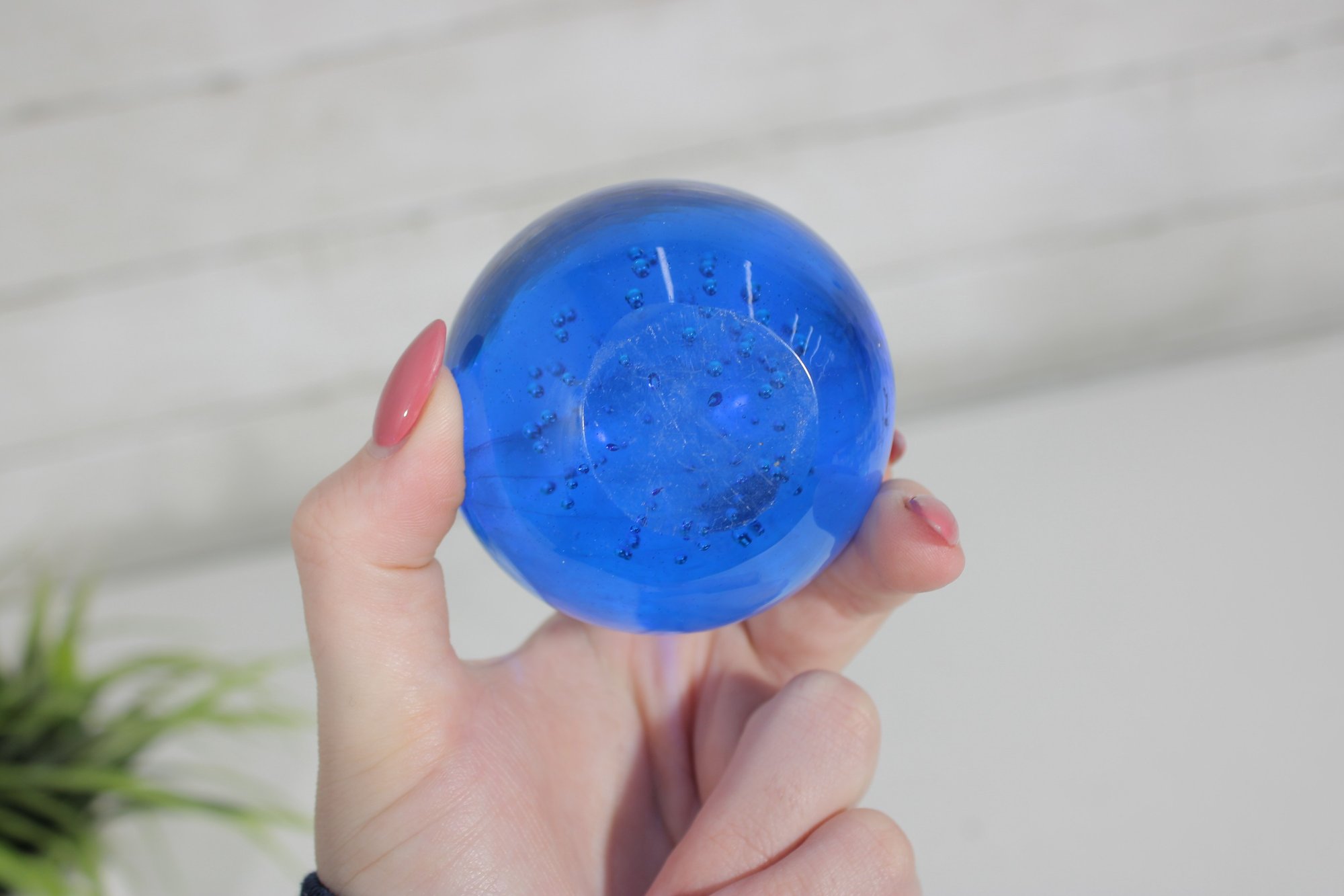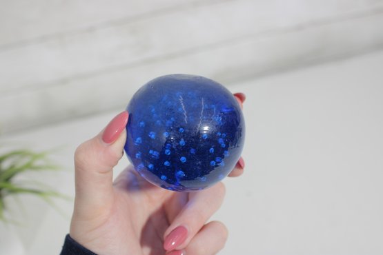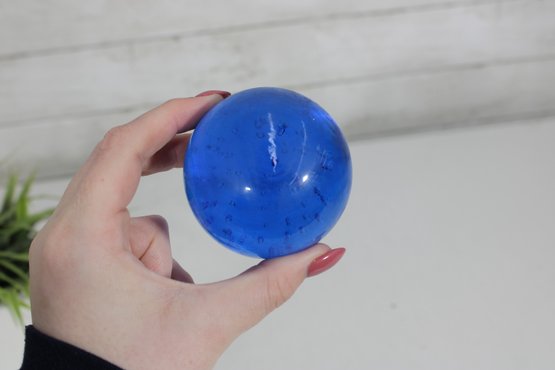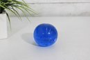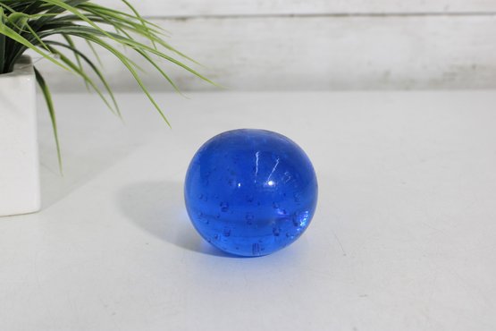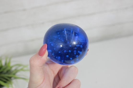 Classic vintage art glass paperweight featuring a rich cobalt blue color with a controlled bubble design. Measuring approximately 2.5 inches in diameter, this piece has a smooth, rounded form and a substantial feel.