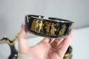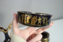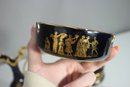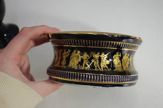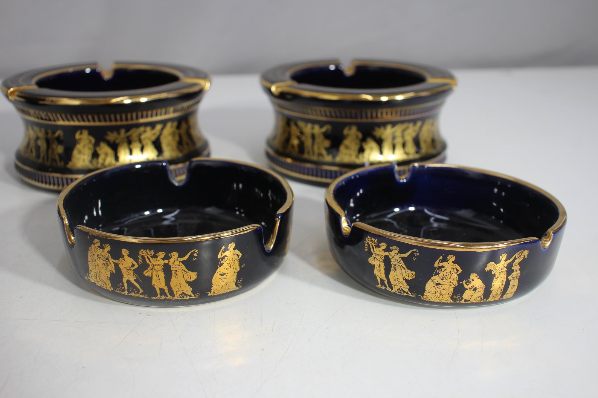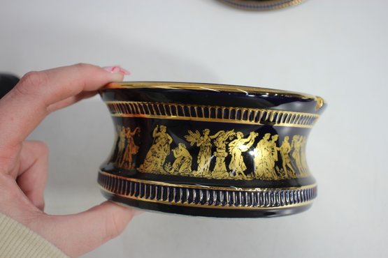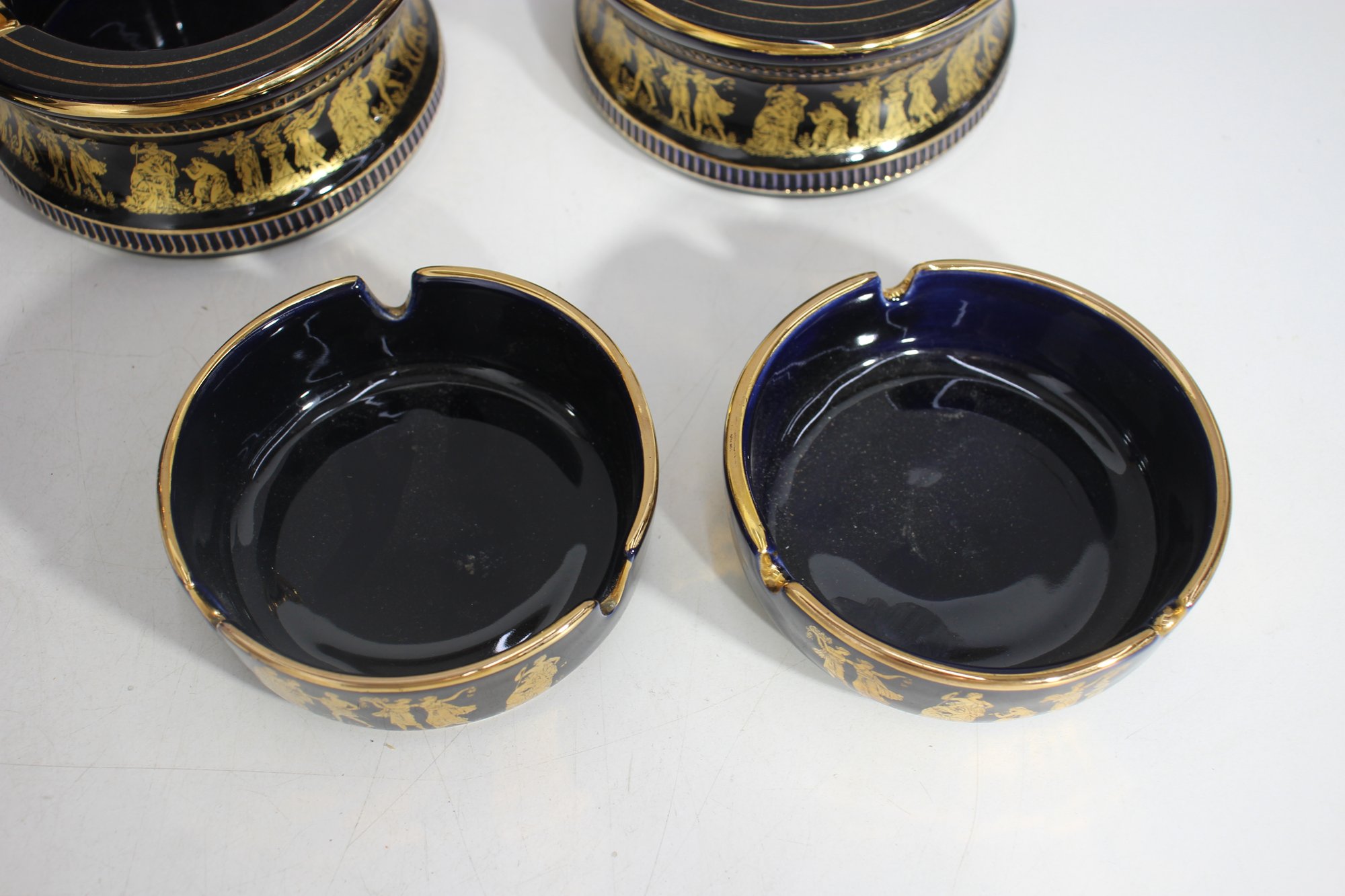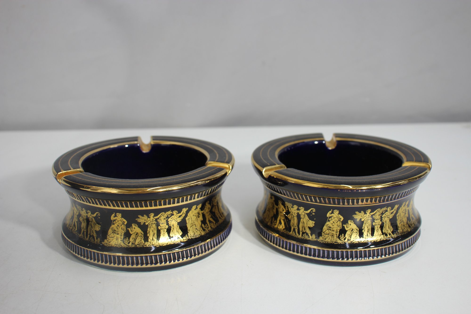 2 Smaller Round Ashtrays – Matching cobalt blue with gold Greek figures and laurel wreath patterns