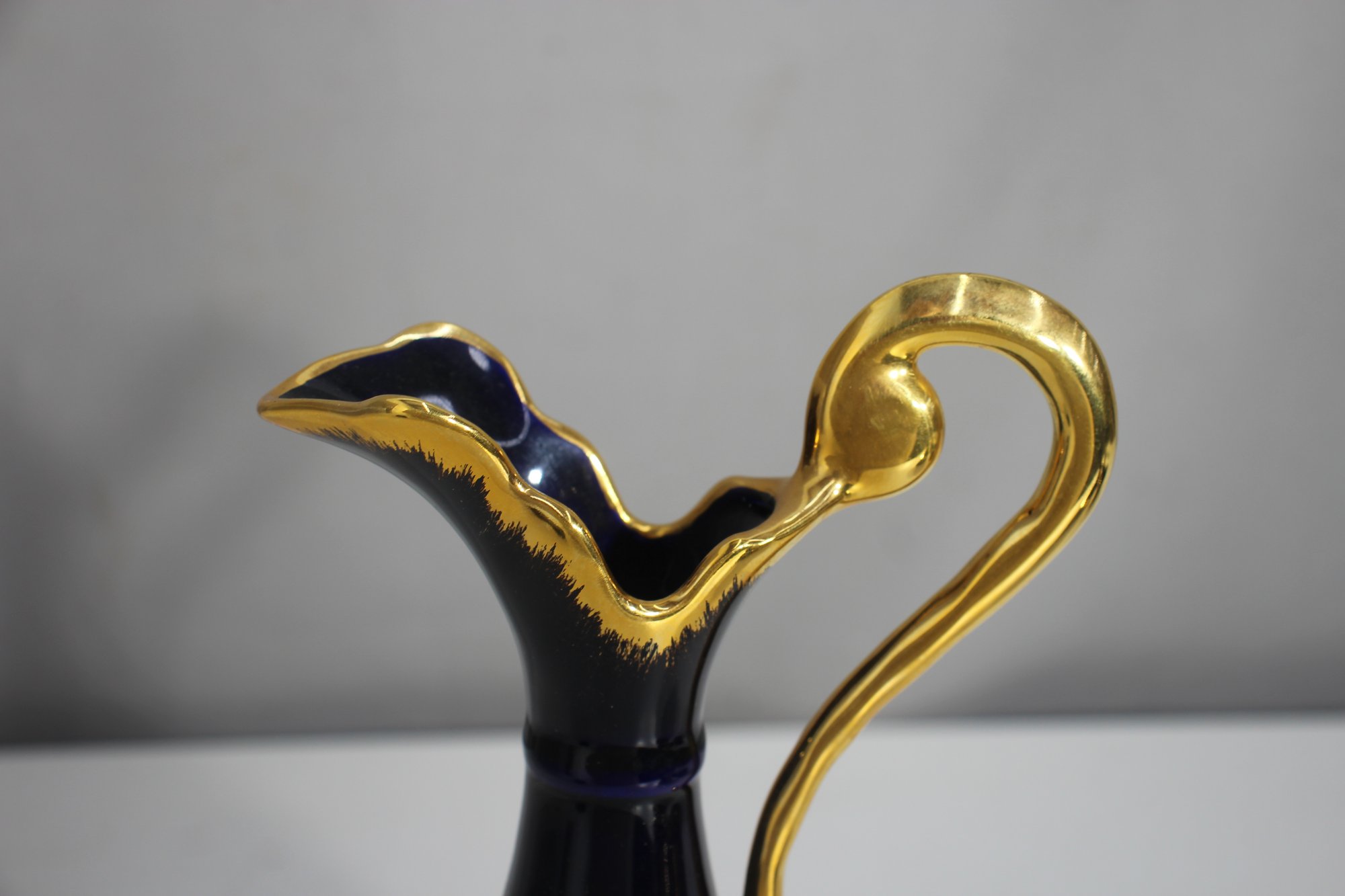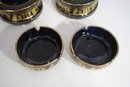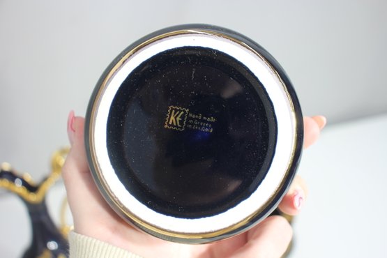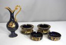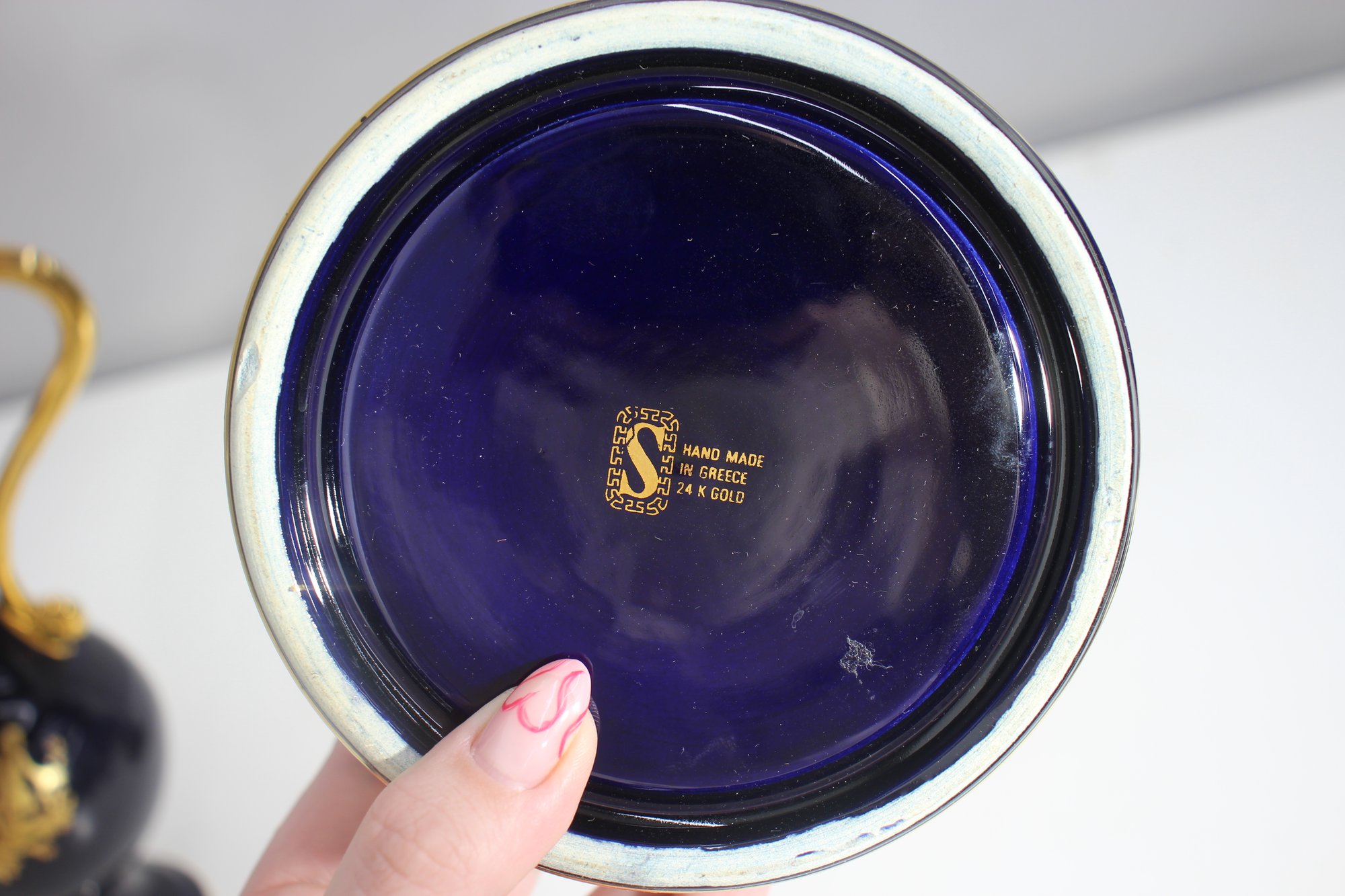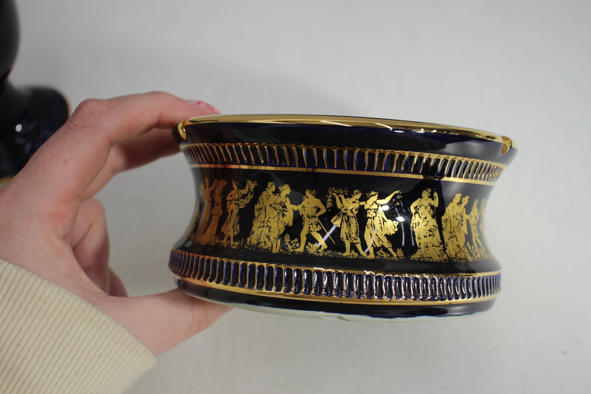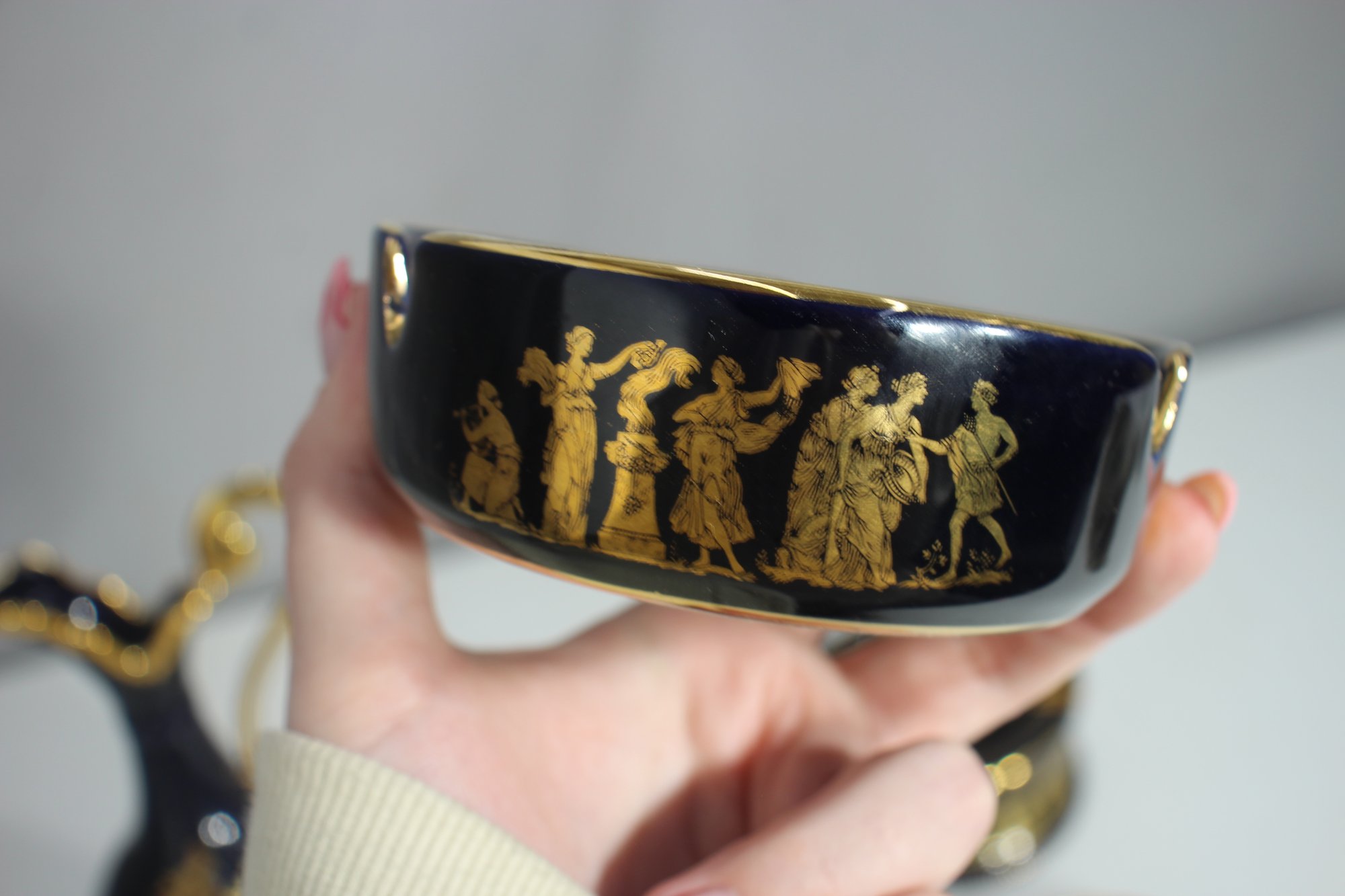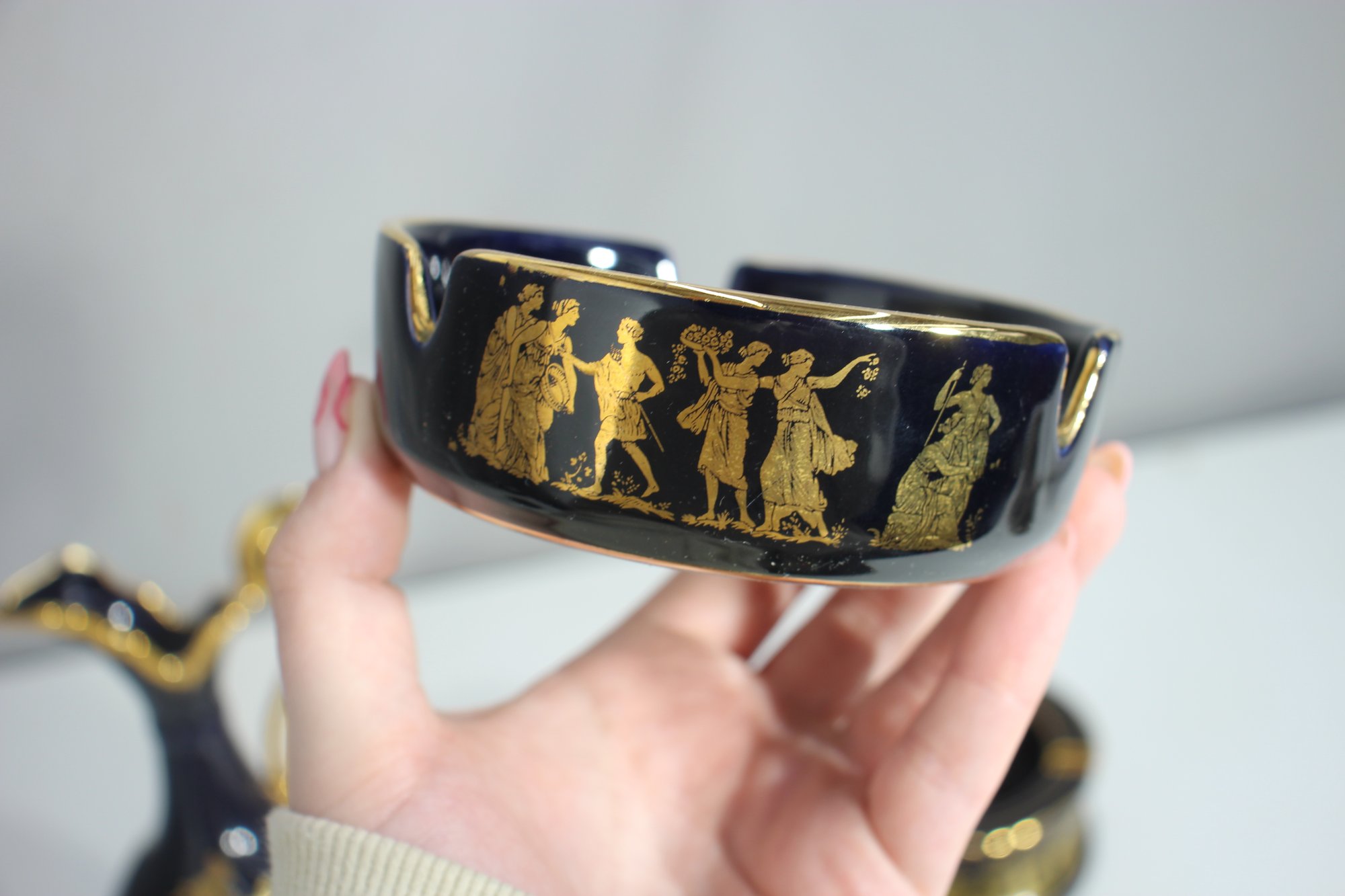 This stunning vintage porcelain set features a deep cobalt blue glaze with intricate gold detailing, inspired by classic Greek mythology and Rococo designs. A striking and elegant addition to any collection!