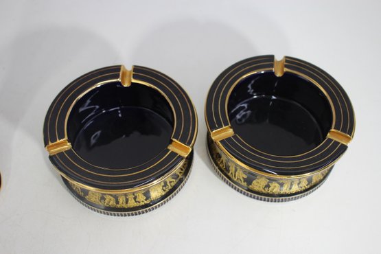 2 Large Round Ashtrays – Raised pedestal design with gold-trimmed edges and Greek key motifs
