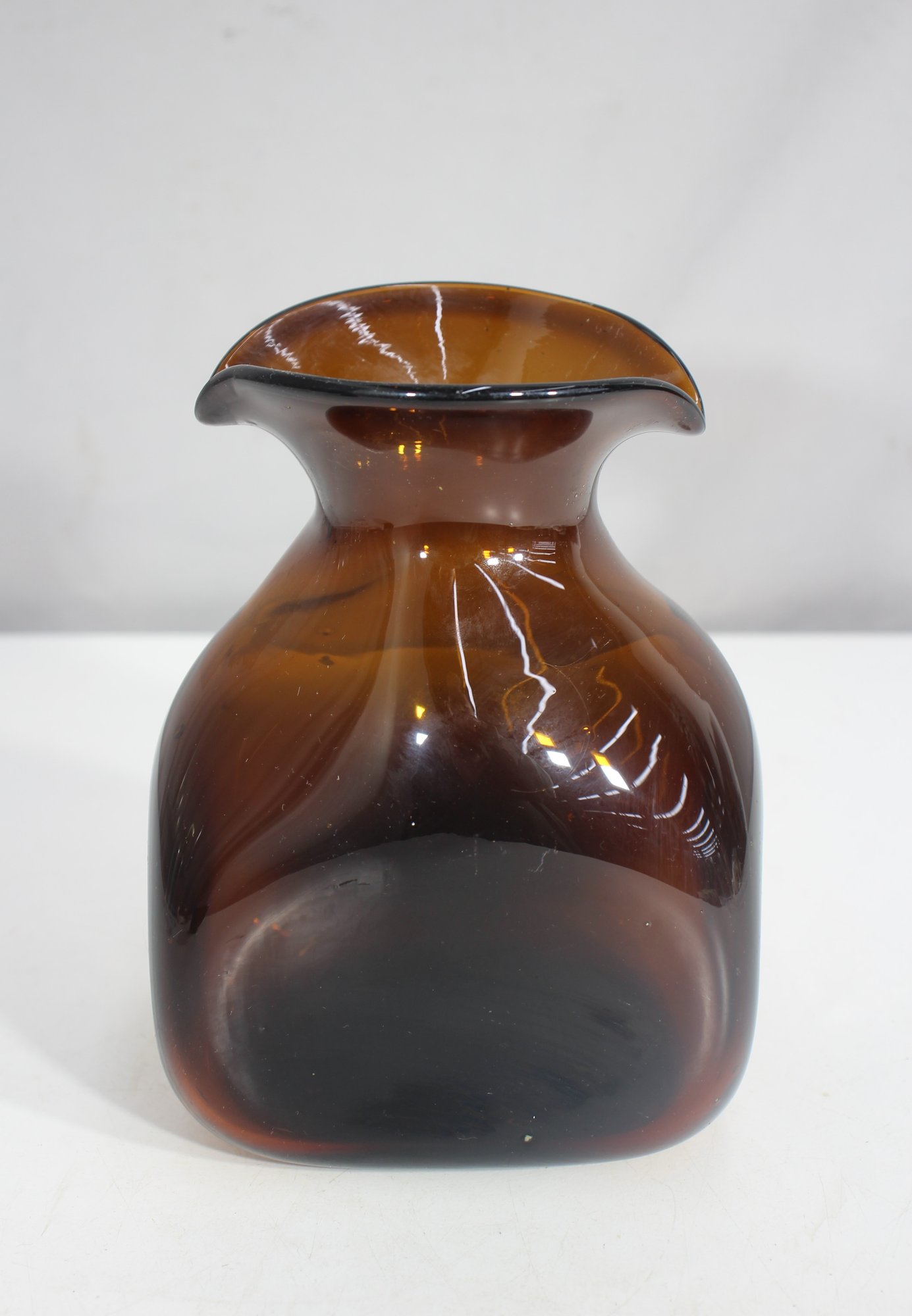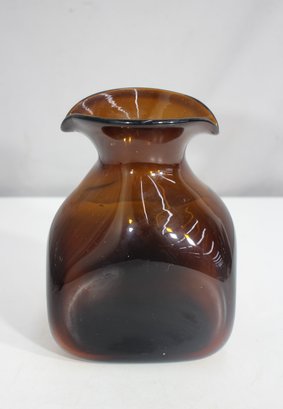 a vintage hand-blown amber glass vase by Cobre Mexico, featuring a rich, warm brown hue and a uniquely flared organic rim. This exquisite piece embodies the Mid-Century Modern aesthetic, making it a perfect addition to any retro or contemporary decor.