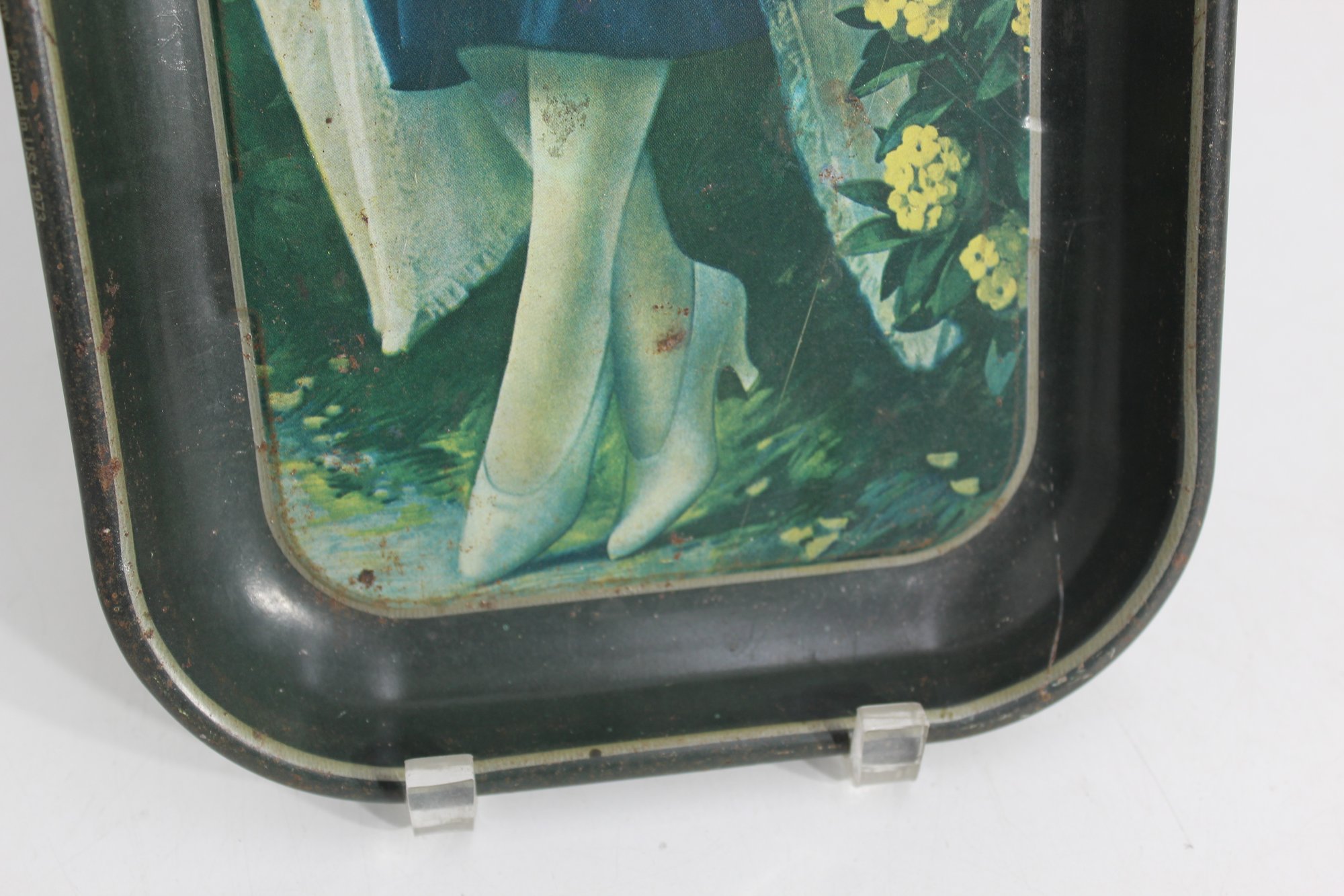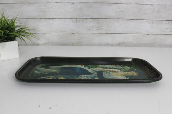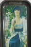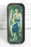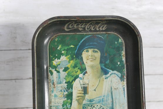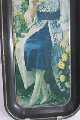Charming vintage Coca-Cola advertising tin tray featuring a classic 1920s lady holding a glass bottle of Coke, seated in a garden scene surrounded by flowers. This rectangular metal tray captures the nostalgic artistry of early Coca-Cola advertising and serves as a great collectible or decorative display piece.