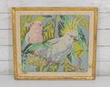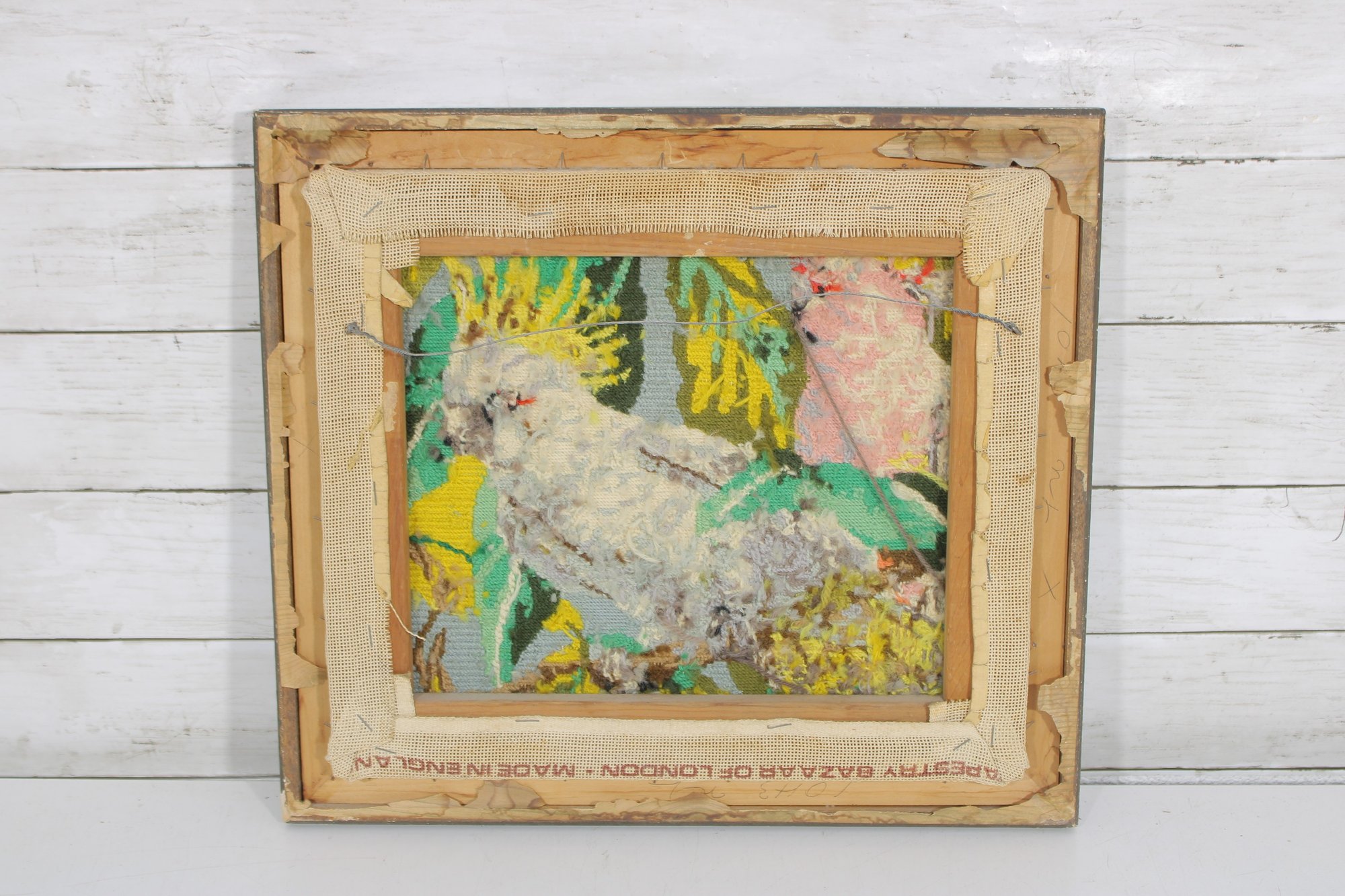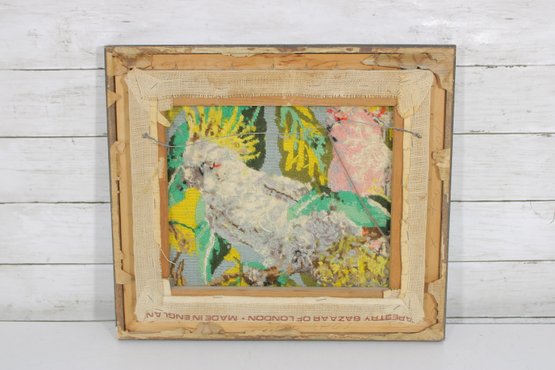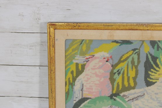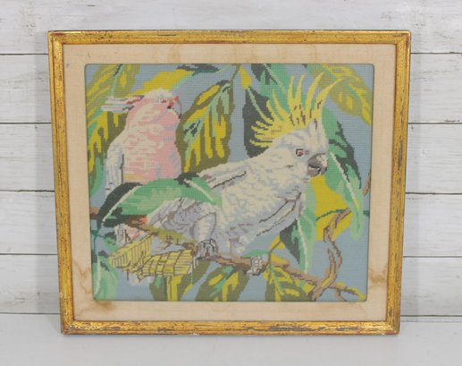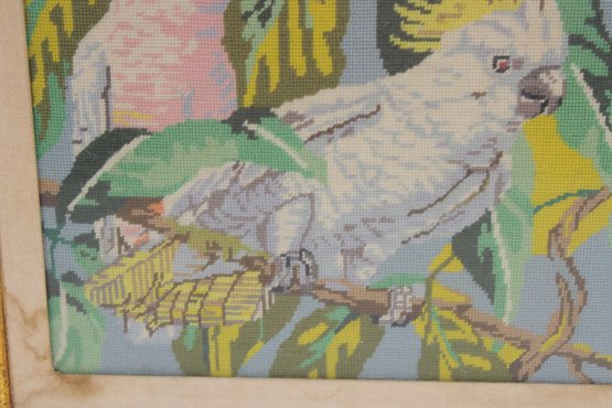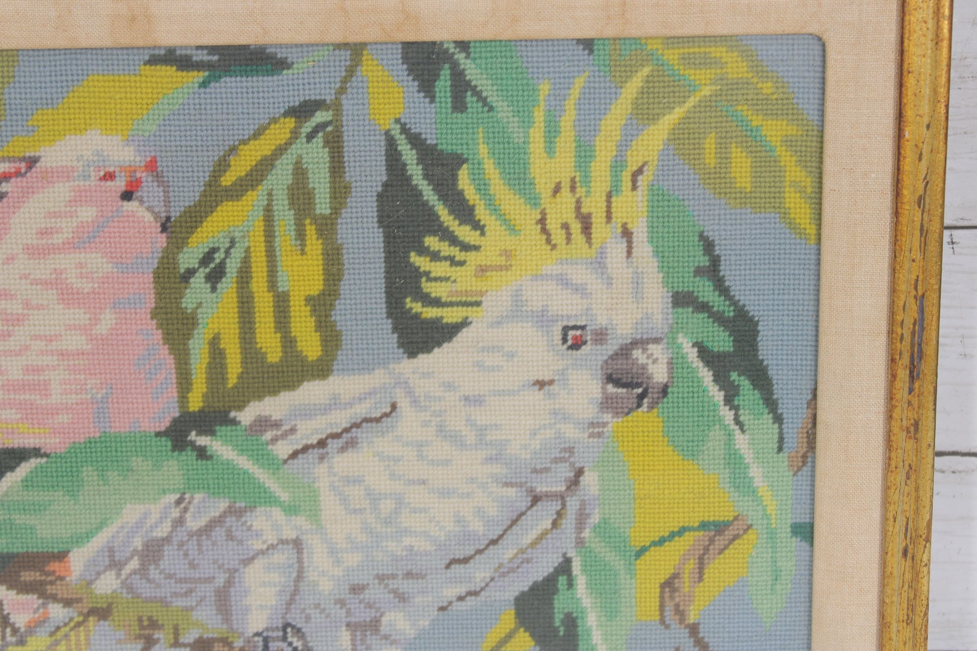 vintage needlepoint artwork featuring a striking tropical cockatoo perched among lush foliage.