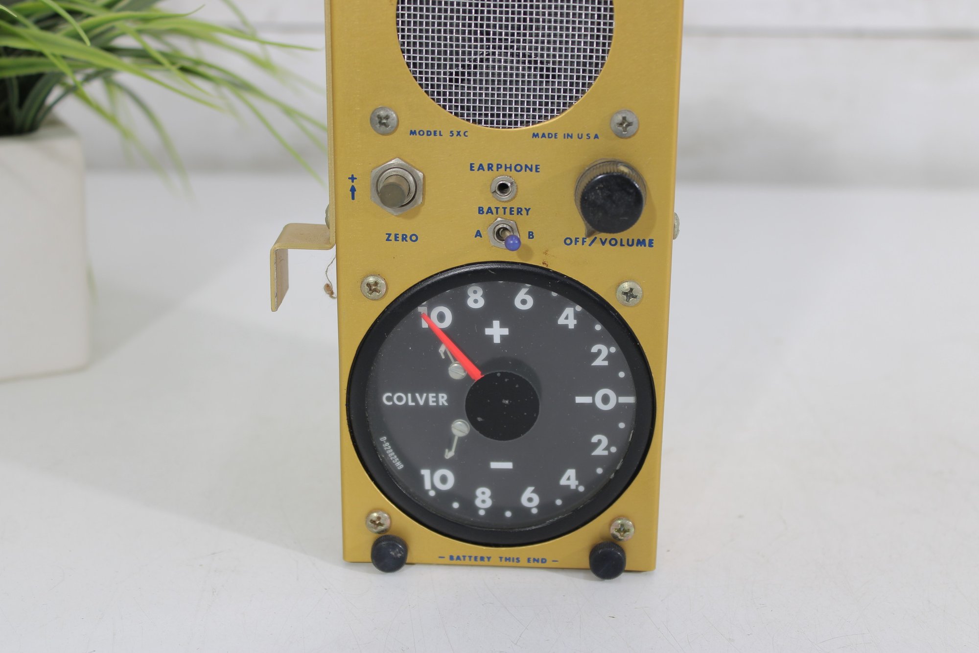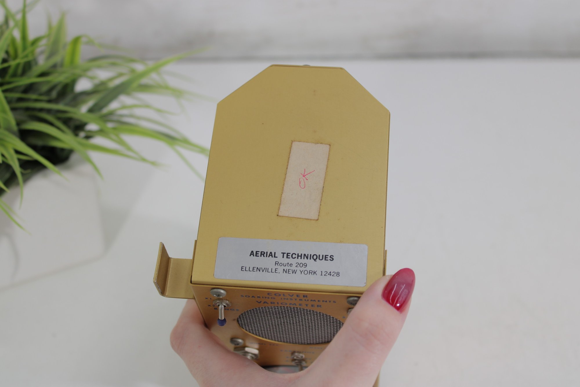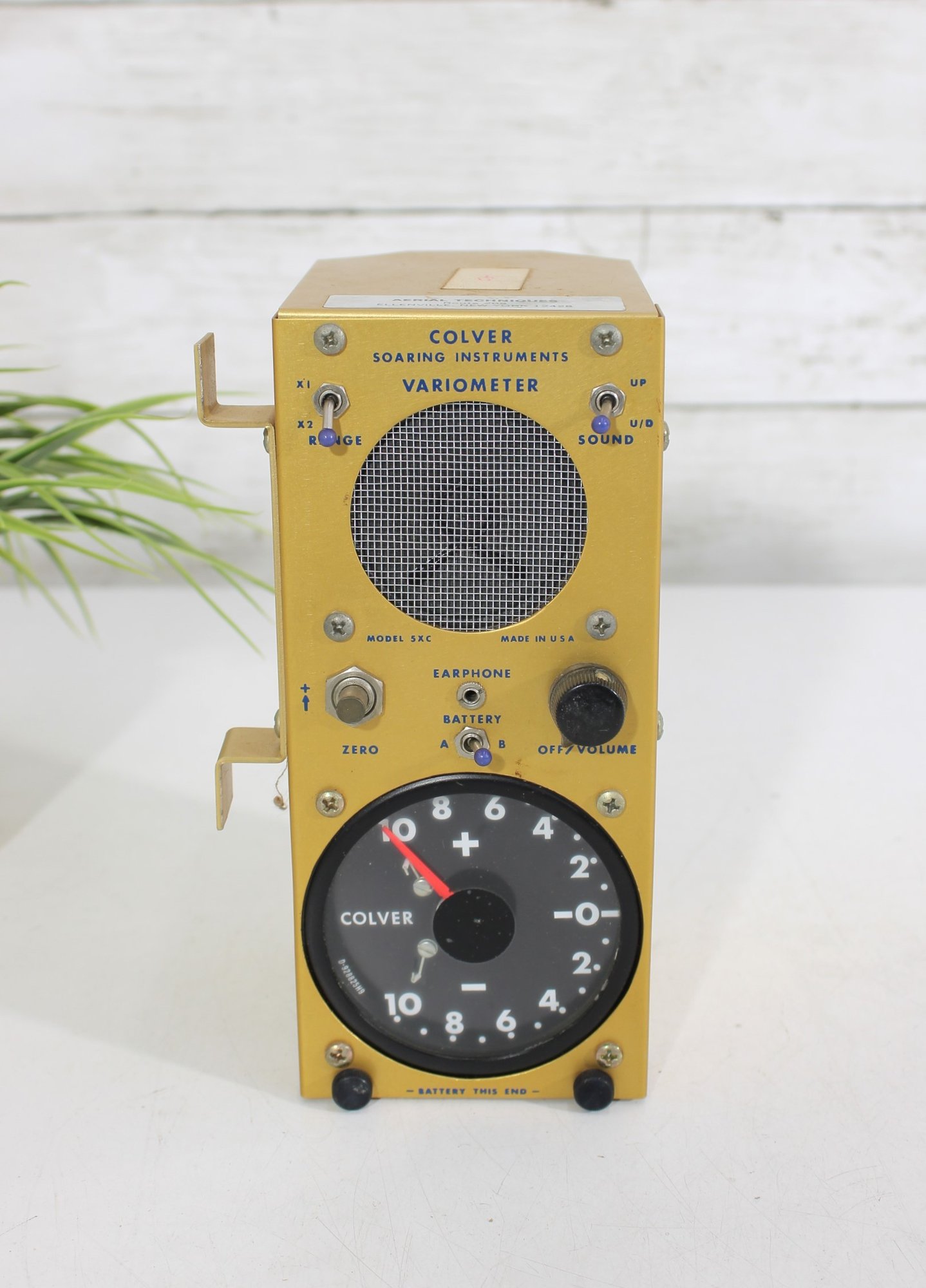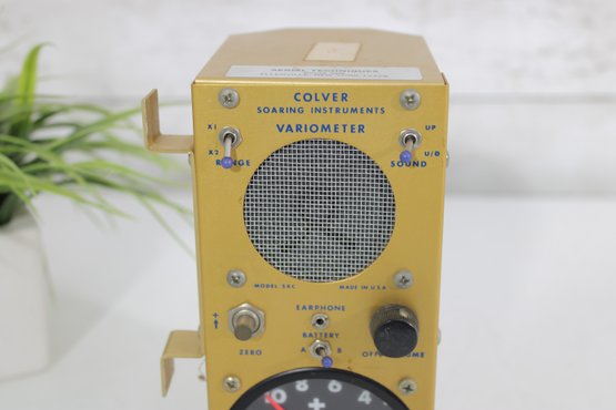 vintage Colver Soaring Instruments variometer, a classic aviation instrument used in gliders to measure rate of climb and descent. This compact unit features a distinctive yellow metal housing with a built-in speaker, control knobs, and an analog dial gauge marked with plus and minus indicators.